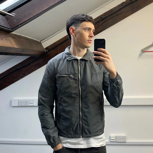 Produttore:ajpg_shopPrada Grey 2015 Contrast Stripe Zip Concealed Hood Nylon Windbreaker Jacket