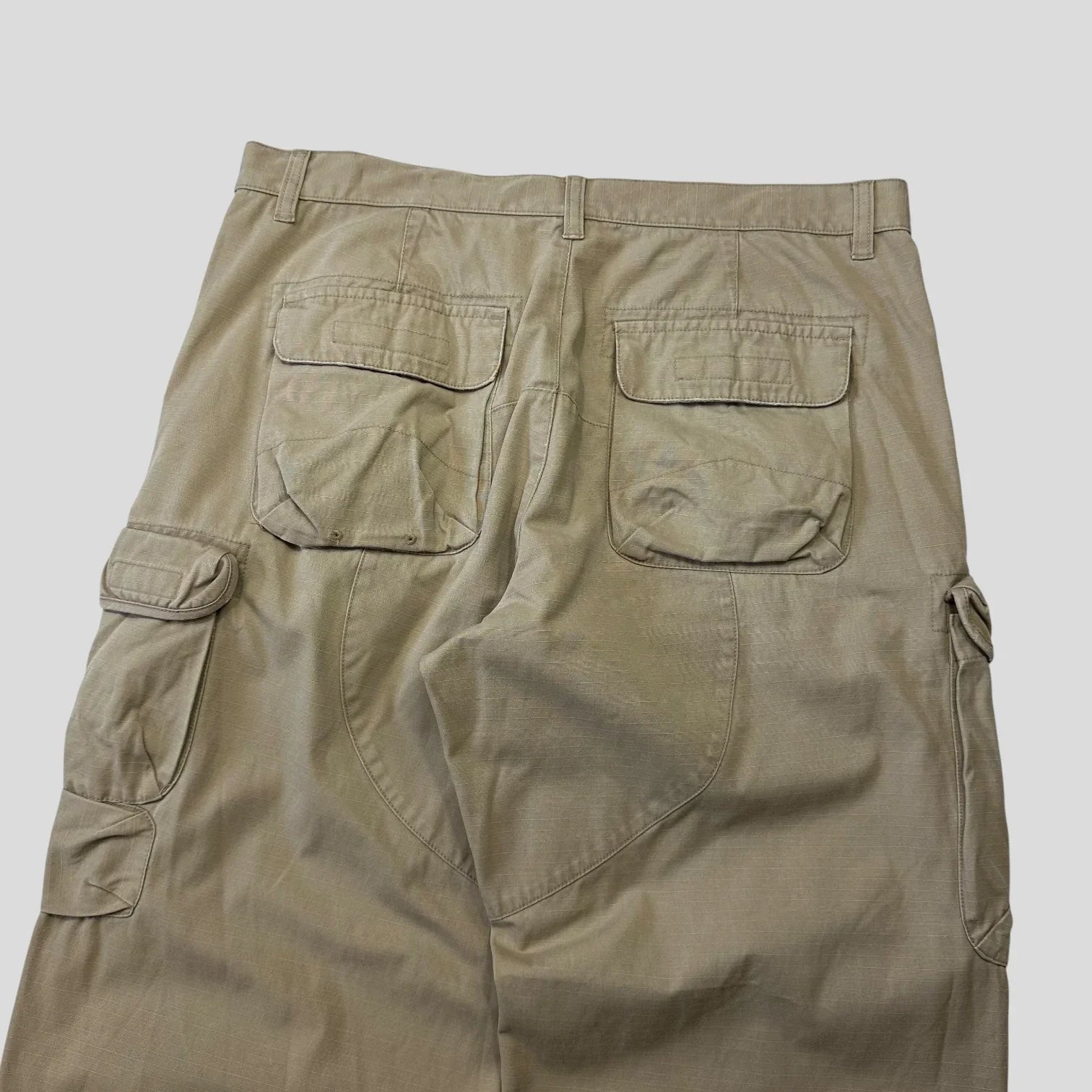 Rare 1990’s Armani Exchange cream / beige ripstop cotton cargo trousers, unique asymmetrical pocket construction with sideways mini pocket to thigh, knee darts for a stacked fit, hand pockets and pouch pockets to back.