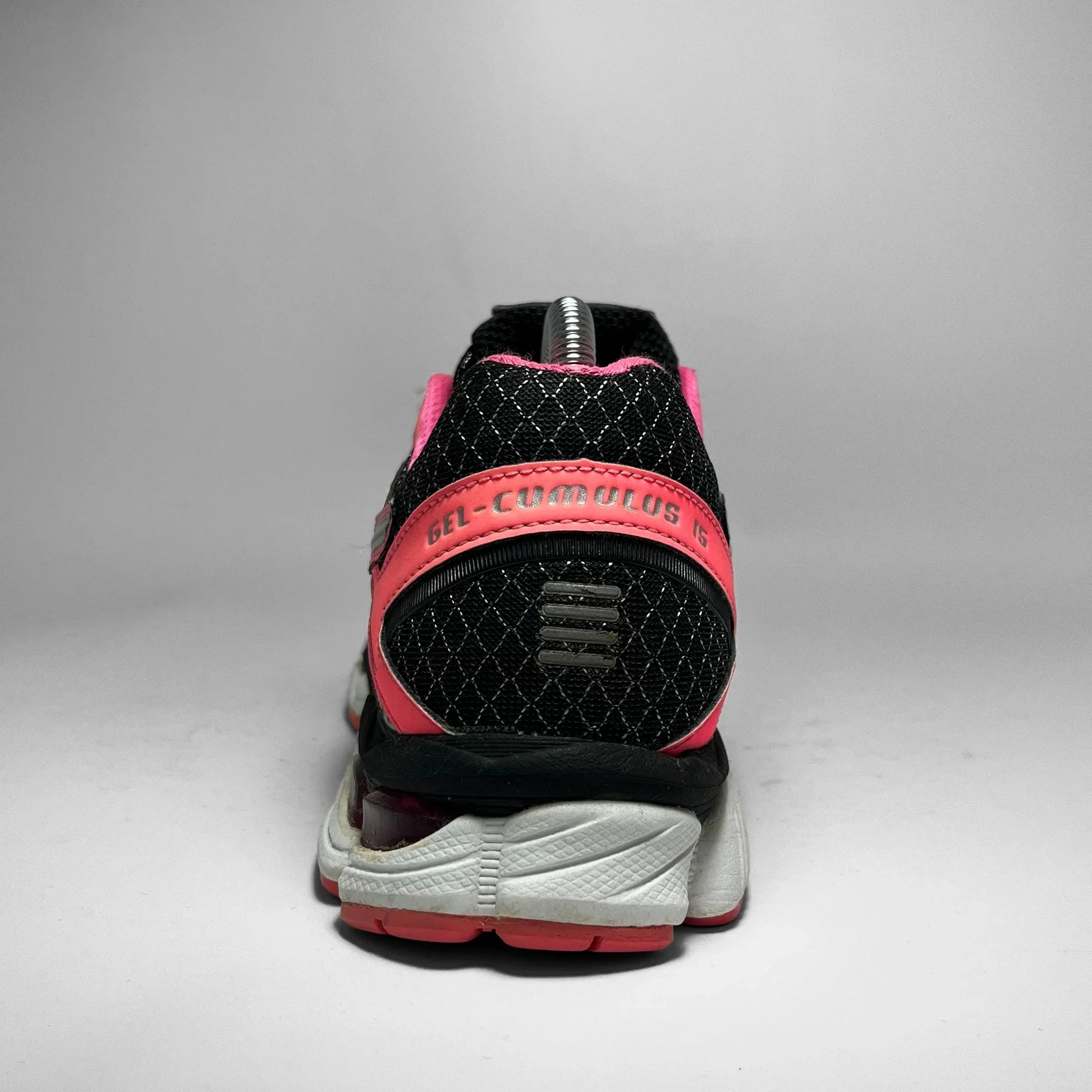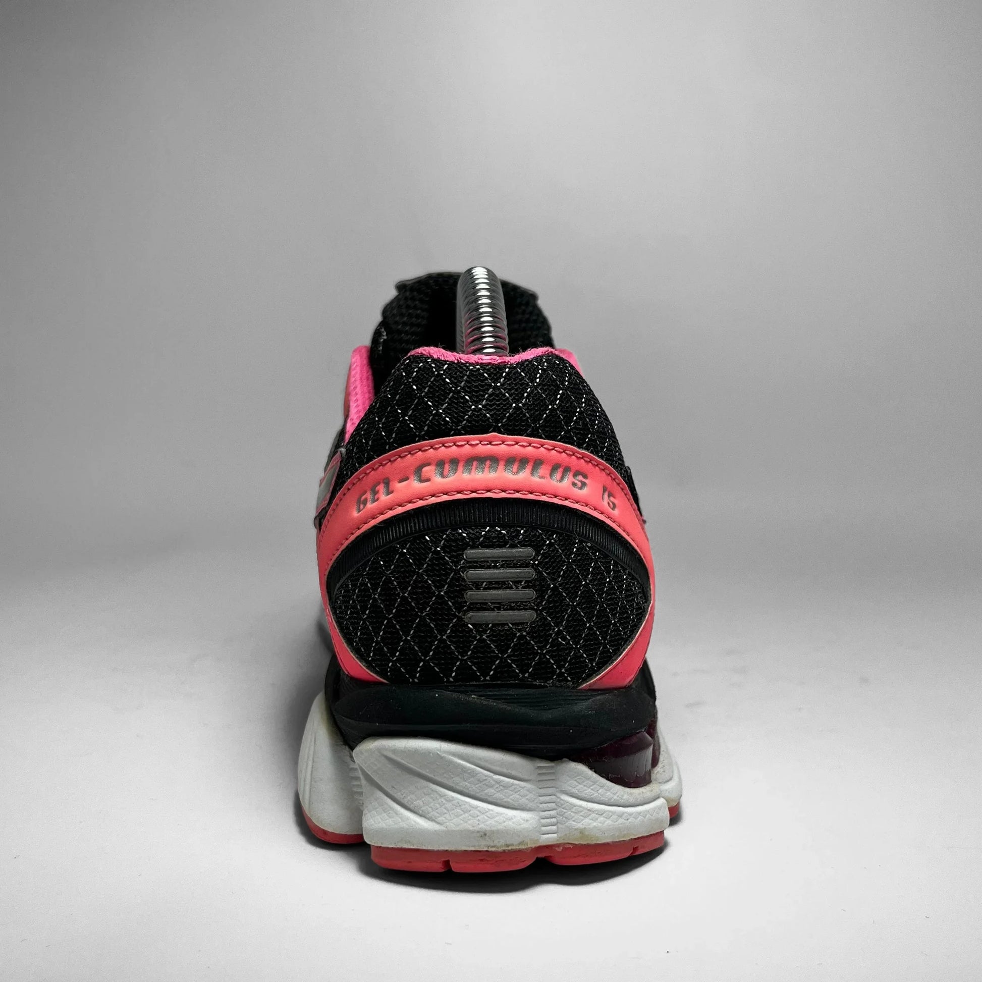ASICS Gel-Cumulus 15 in a bold black, pink, and silver colorway. Featuring a black mesh upper with reflective silver overlays and vibrant pink accents throughout. The midsole combines white and black with visible GEL cushioning, while the outsole pops with bright pink rubber traction panels. Classic ASICS branding on the sides and heel complete the look.