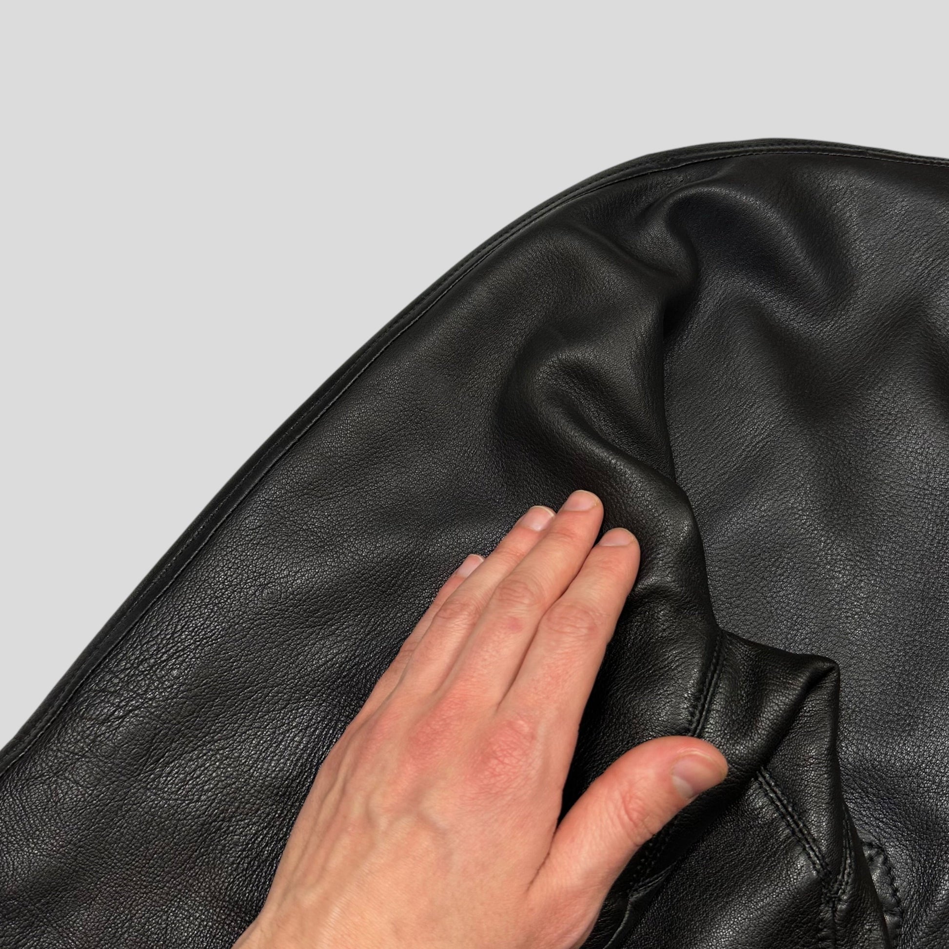 Extremely rare and beautiful black Gucci by Tom Ford lambskin leather bomber flight jacket, unique lungs style pockets at the front that are accessed by the opposing arm, beautiful big open pleat detail on the back synonymous with the fall winter 2003 Tom Ford season.