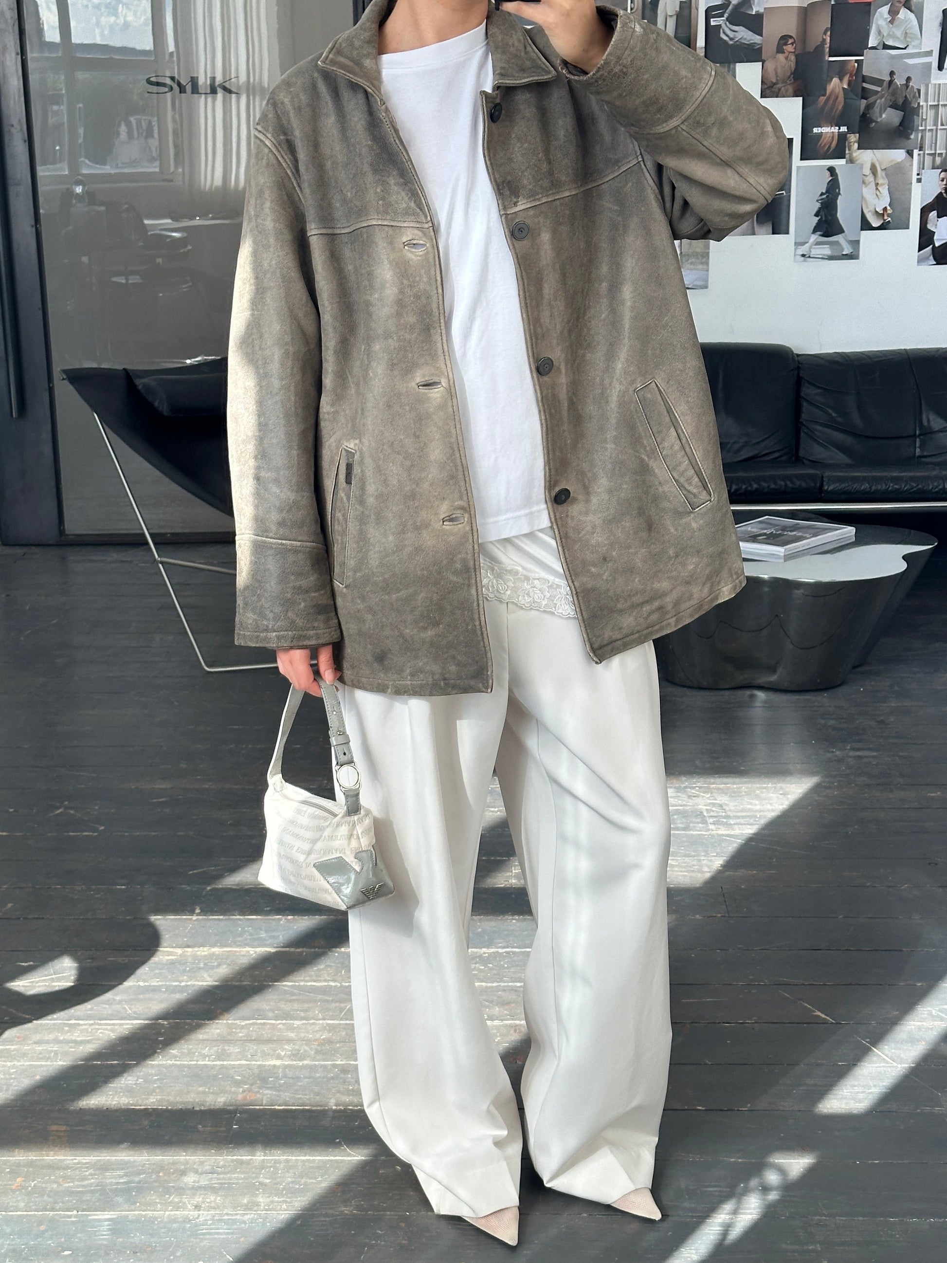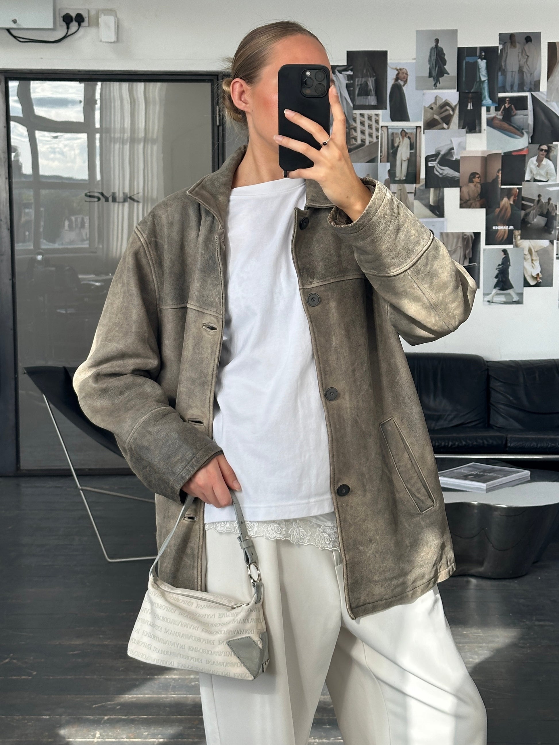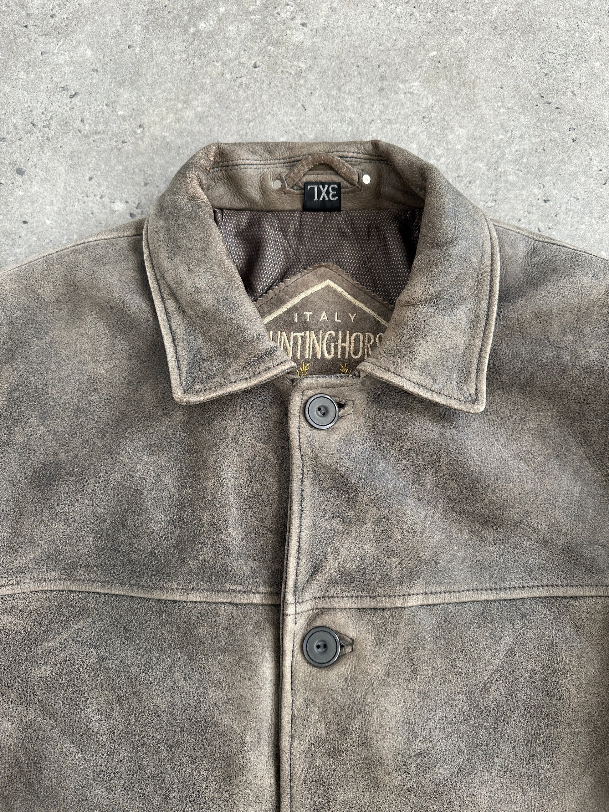 A distressed Italian leather car coat by Hunting Horse, cut with a relaxed, oversized silhouette and finished with heritage-inspired branding for a rugged yet elevated edge.