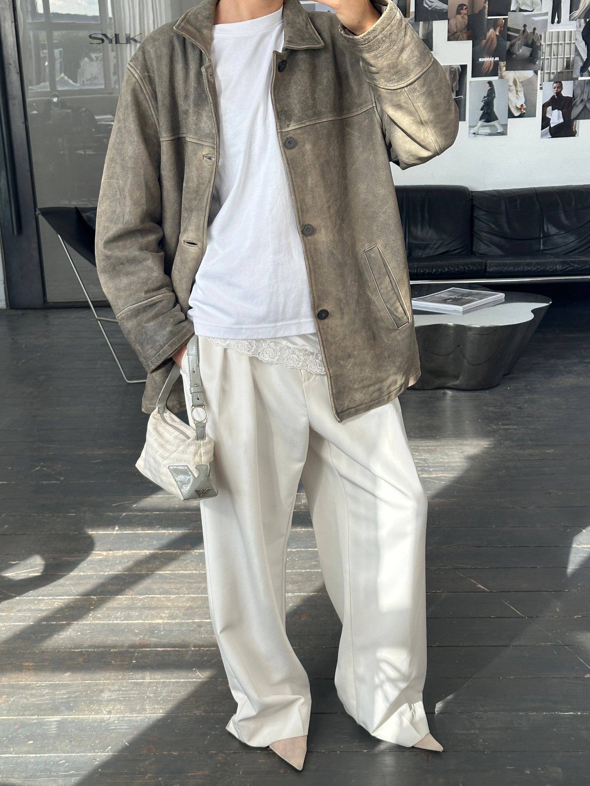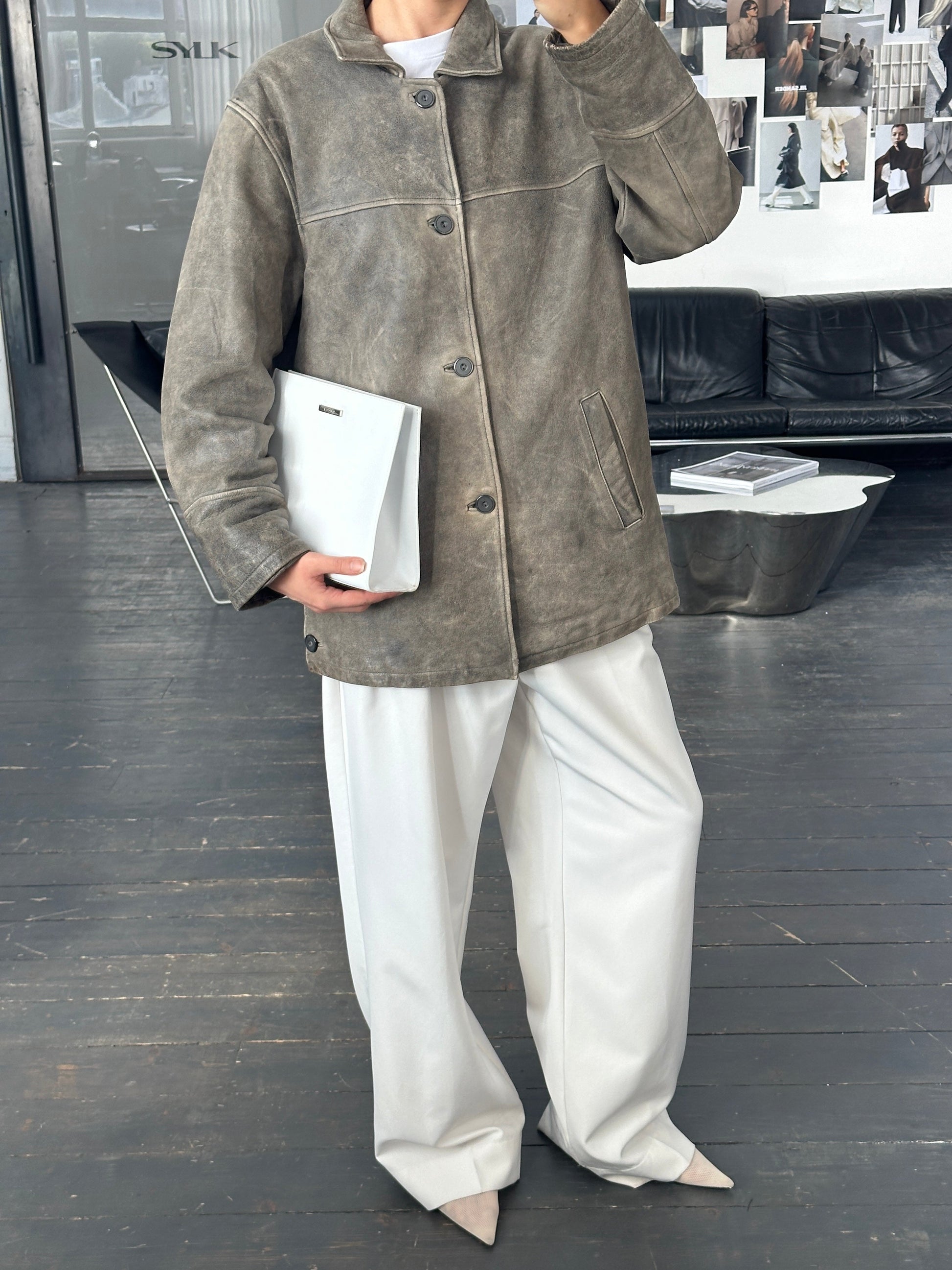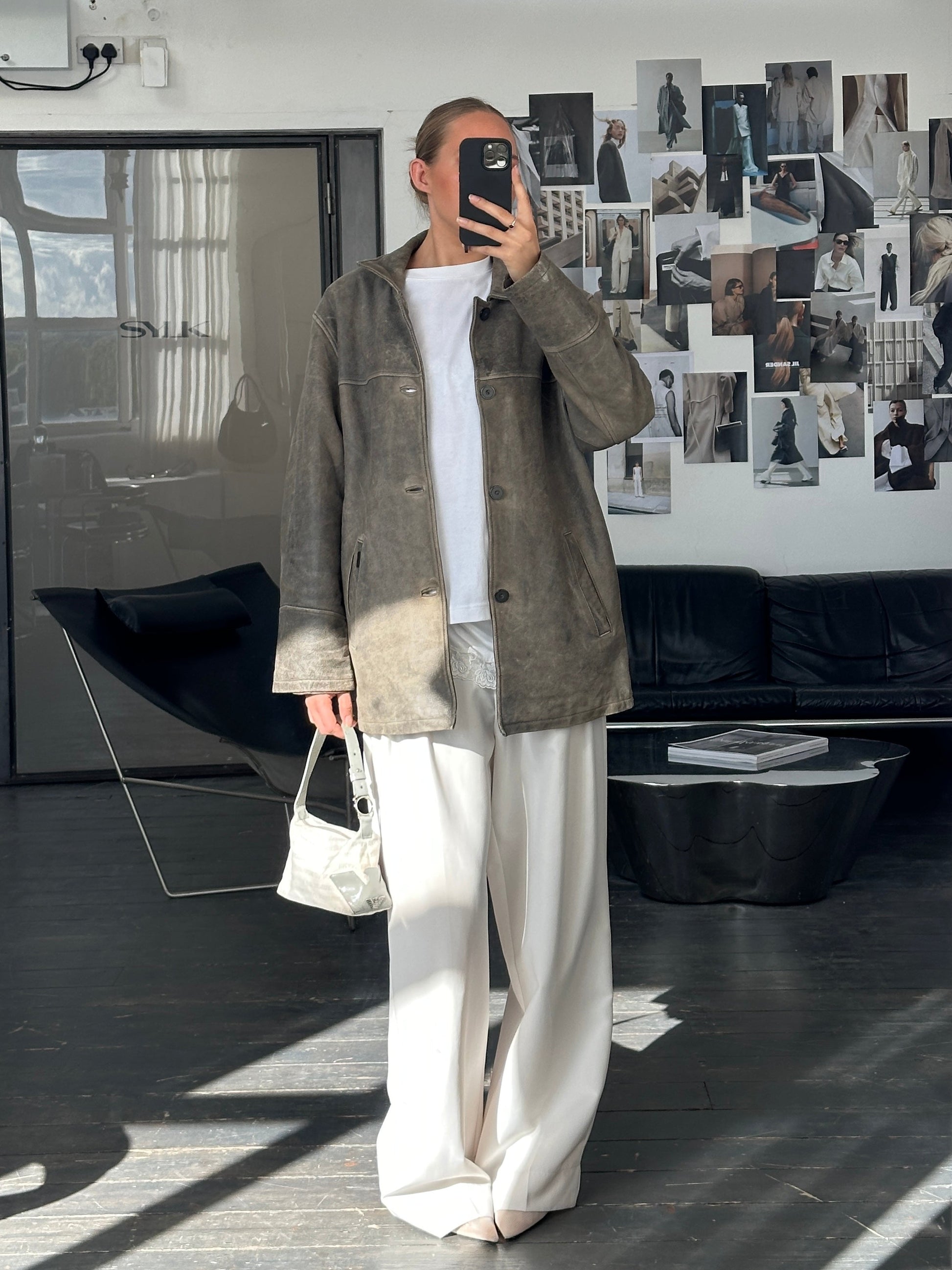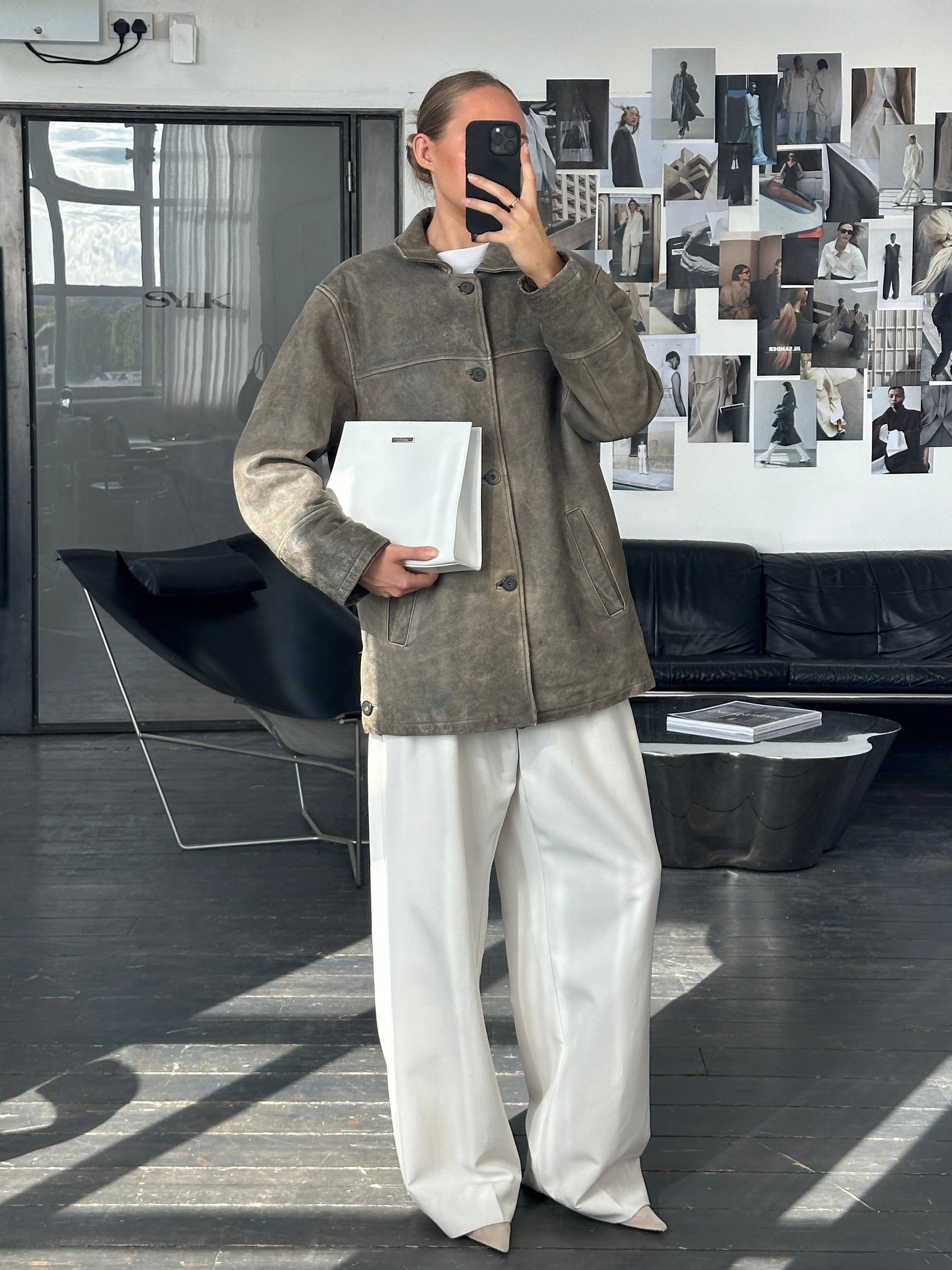 A distressed Italian leather car coat by Hunting Horse, cut with a relaxed, oversized silhouette and finished with heritage-inspired branding for a rugged yet elevated edge.