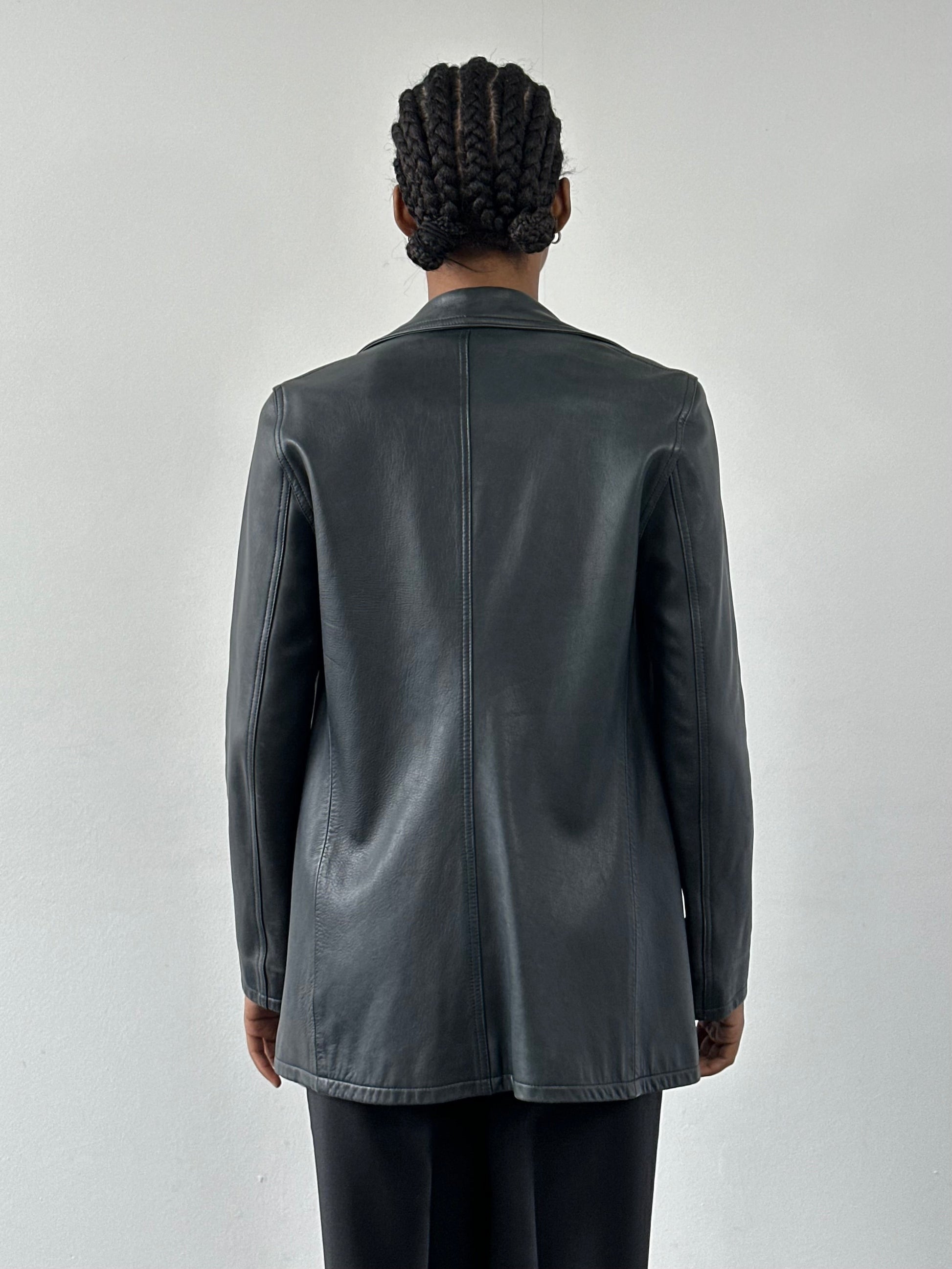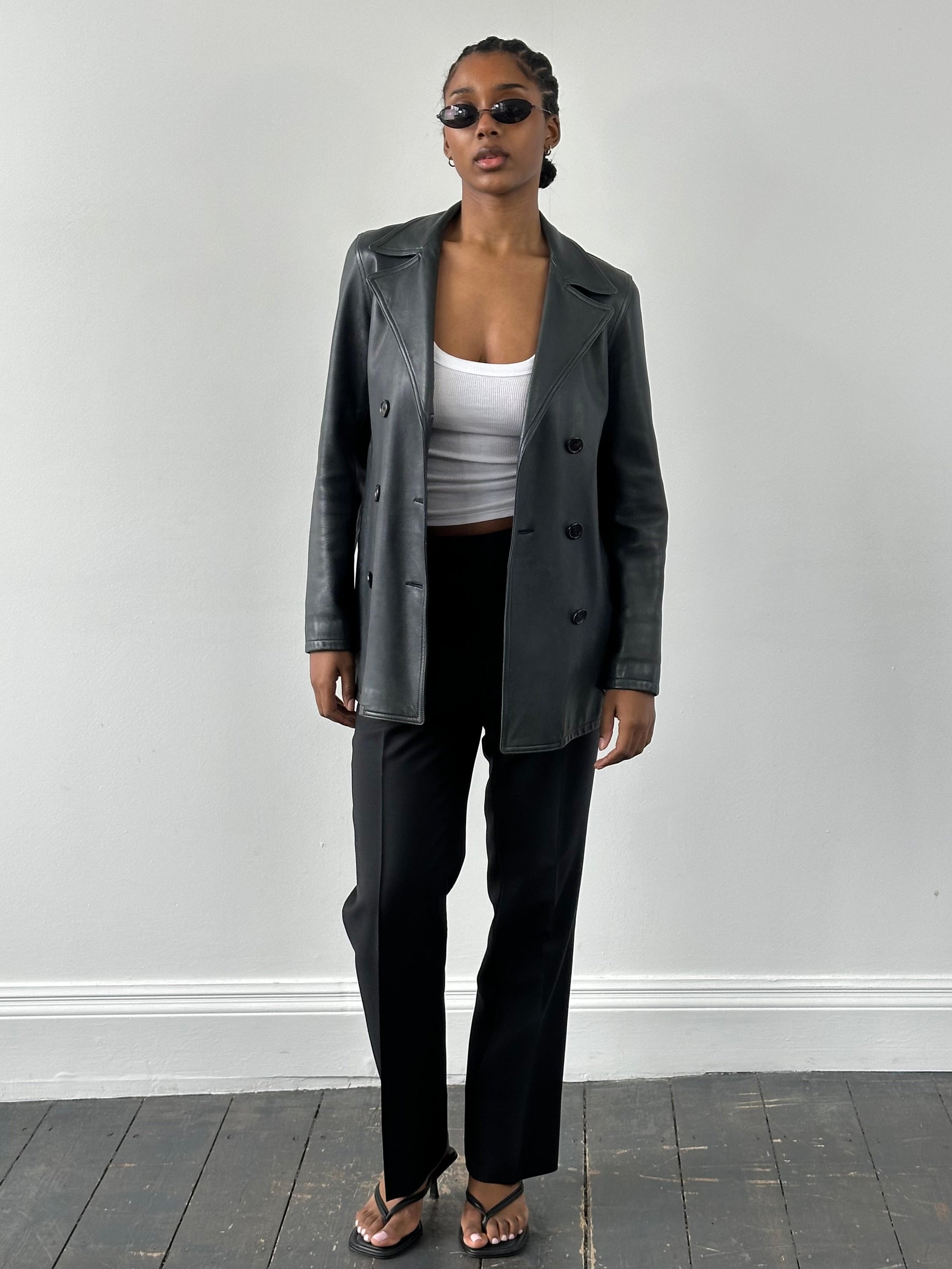Jaeger double breasted leather jacket in a muted grey blue tone with a smooth soft finish and structured tailoring. Designed with wide notch lapels, tonal buttons and clean vertical pockets for a refined silhouette.