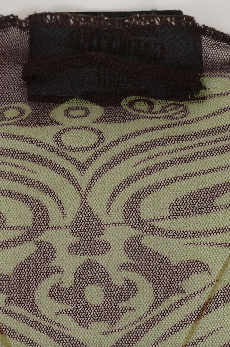 JPG green and brown iconic tattoo mesh top with raw edges made of 100% nylon.