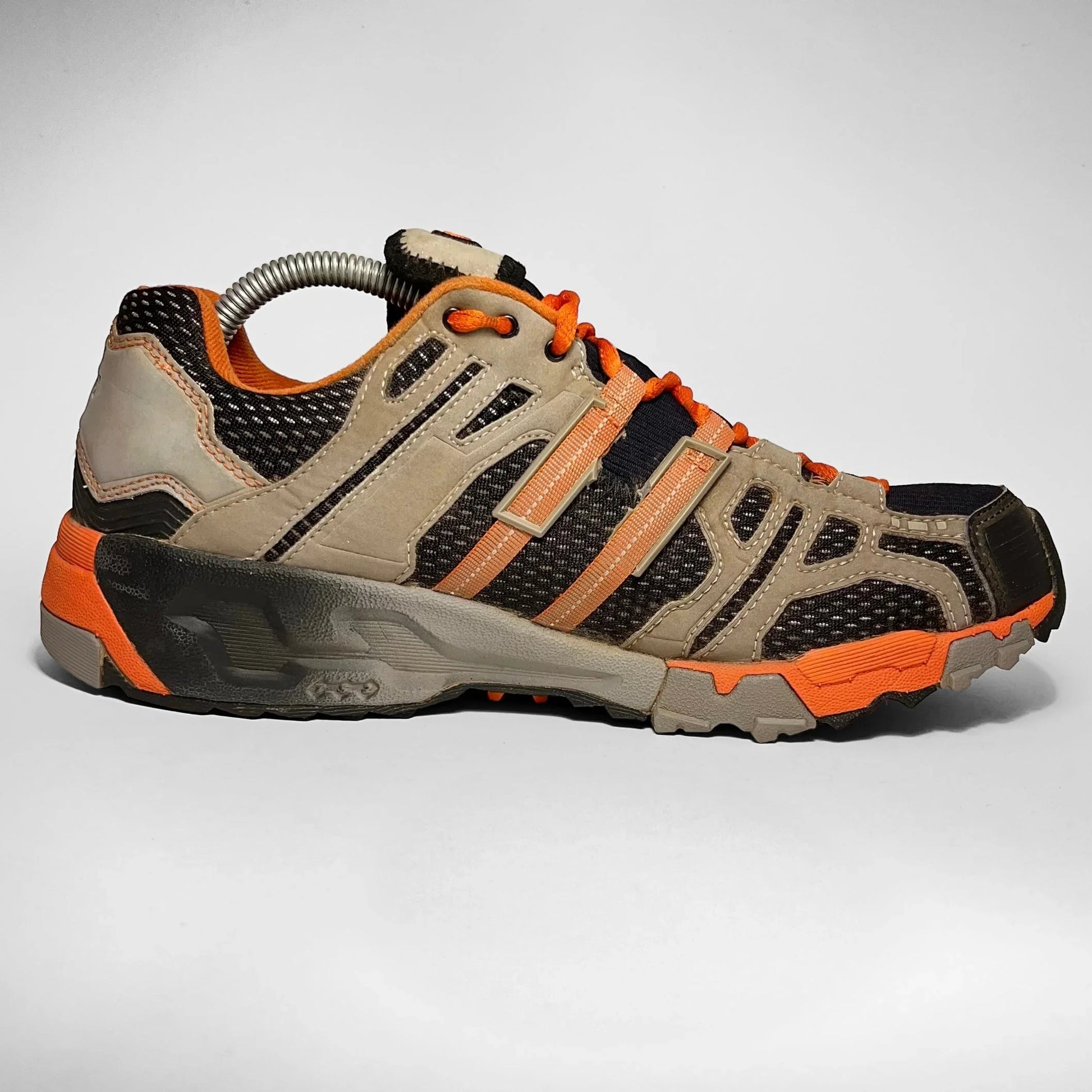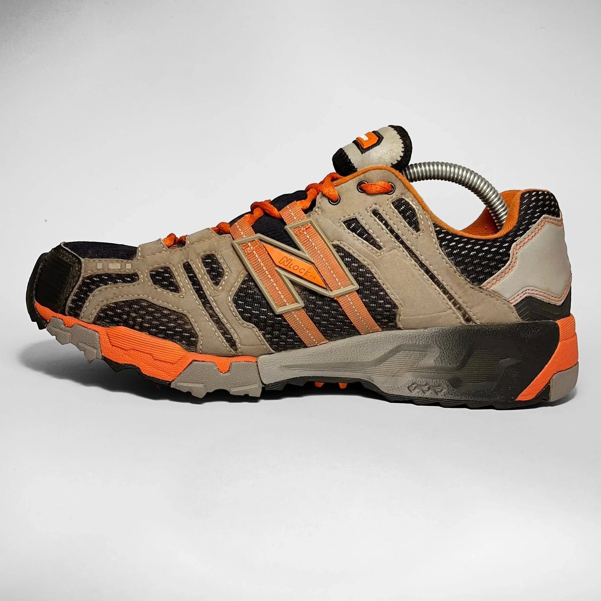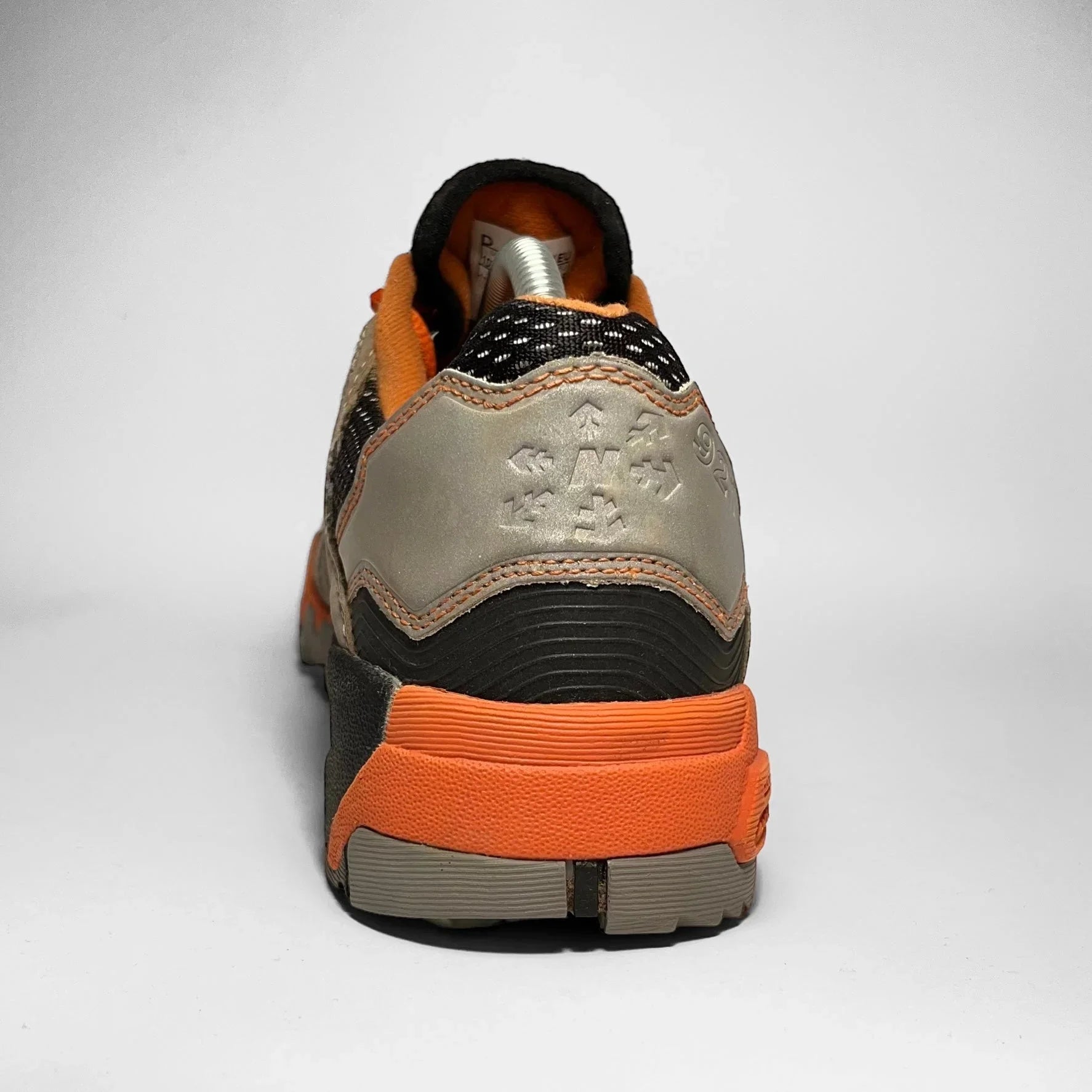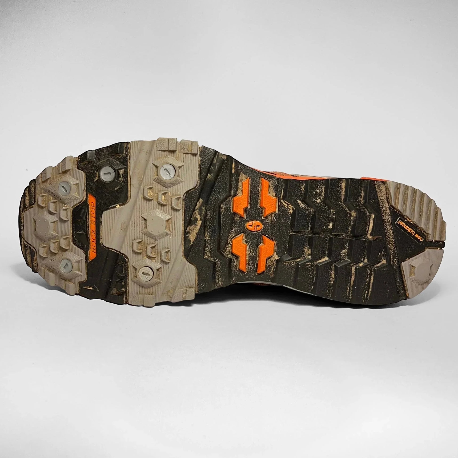 A dual layered mesh body in black and silver hints, soft grey panels with reflective details also seen on heel and tongue, orange stitching, rubber branding on tongue, mudguard, and mid-soles, N-lock cotton belt securing the orange laces which can be hidden in the pocket, and replaceable spikes.