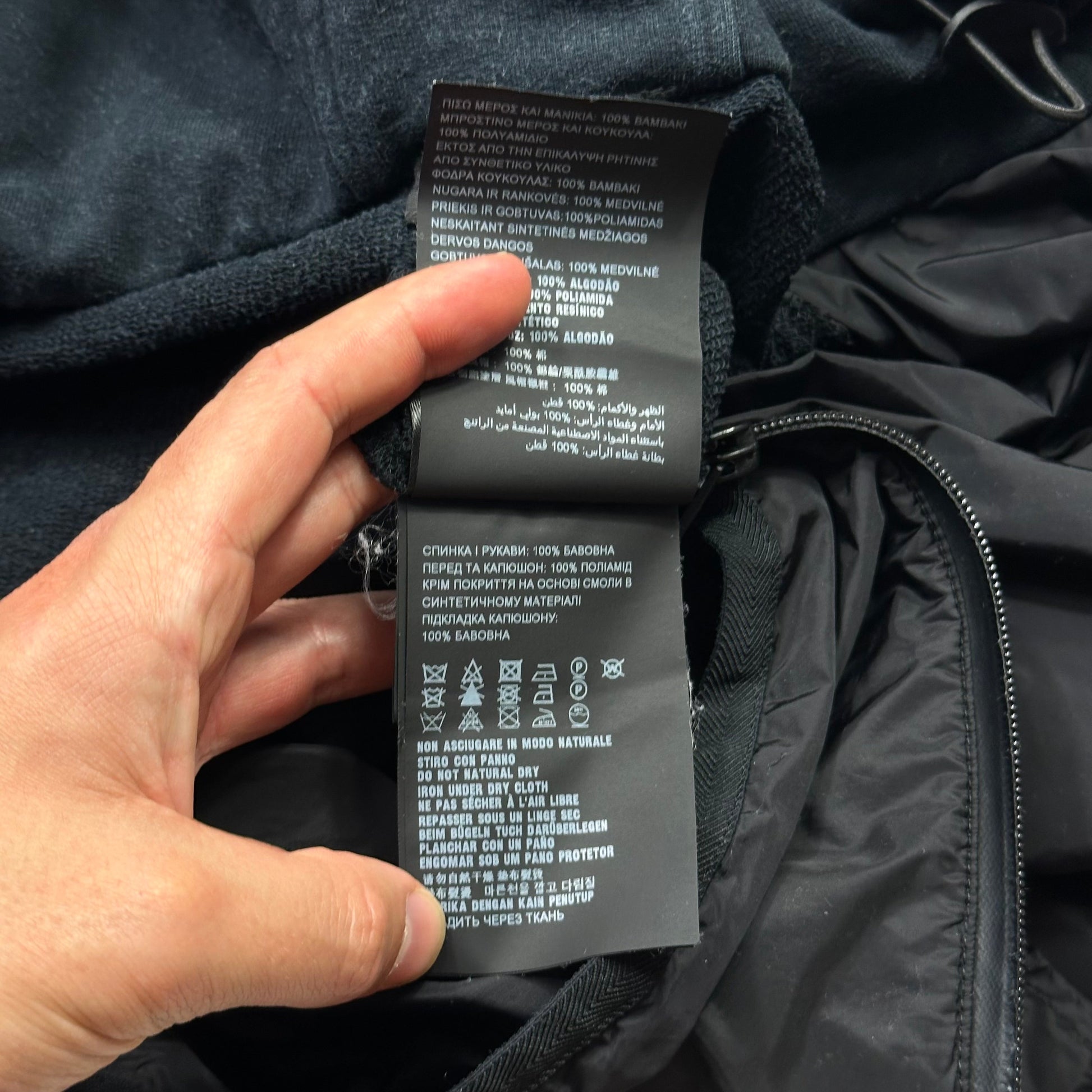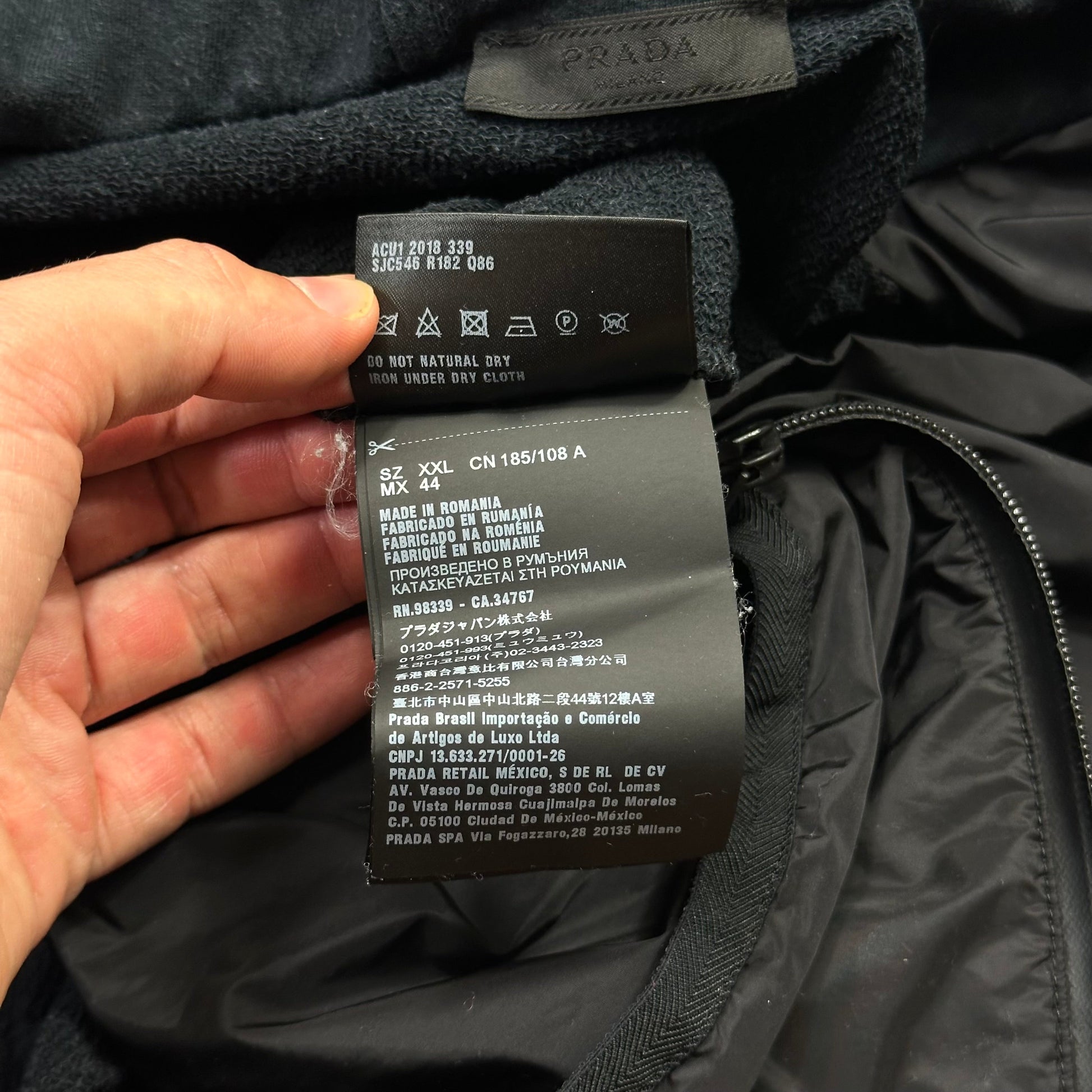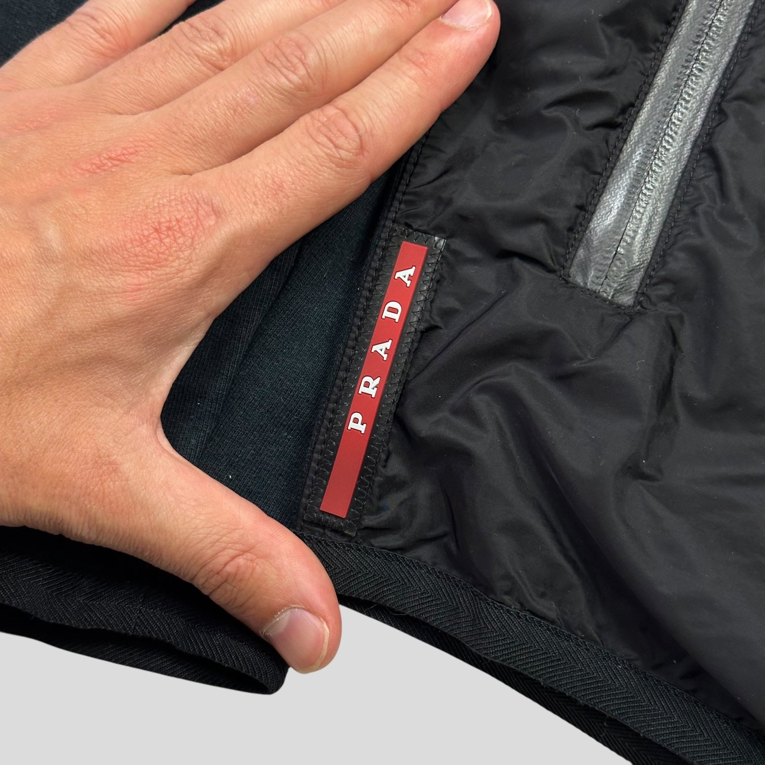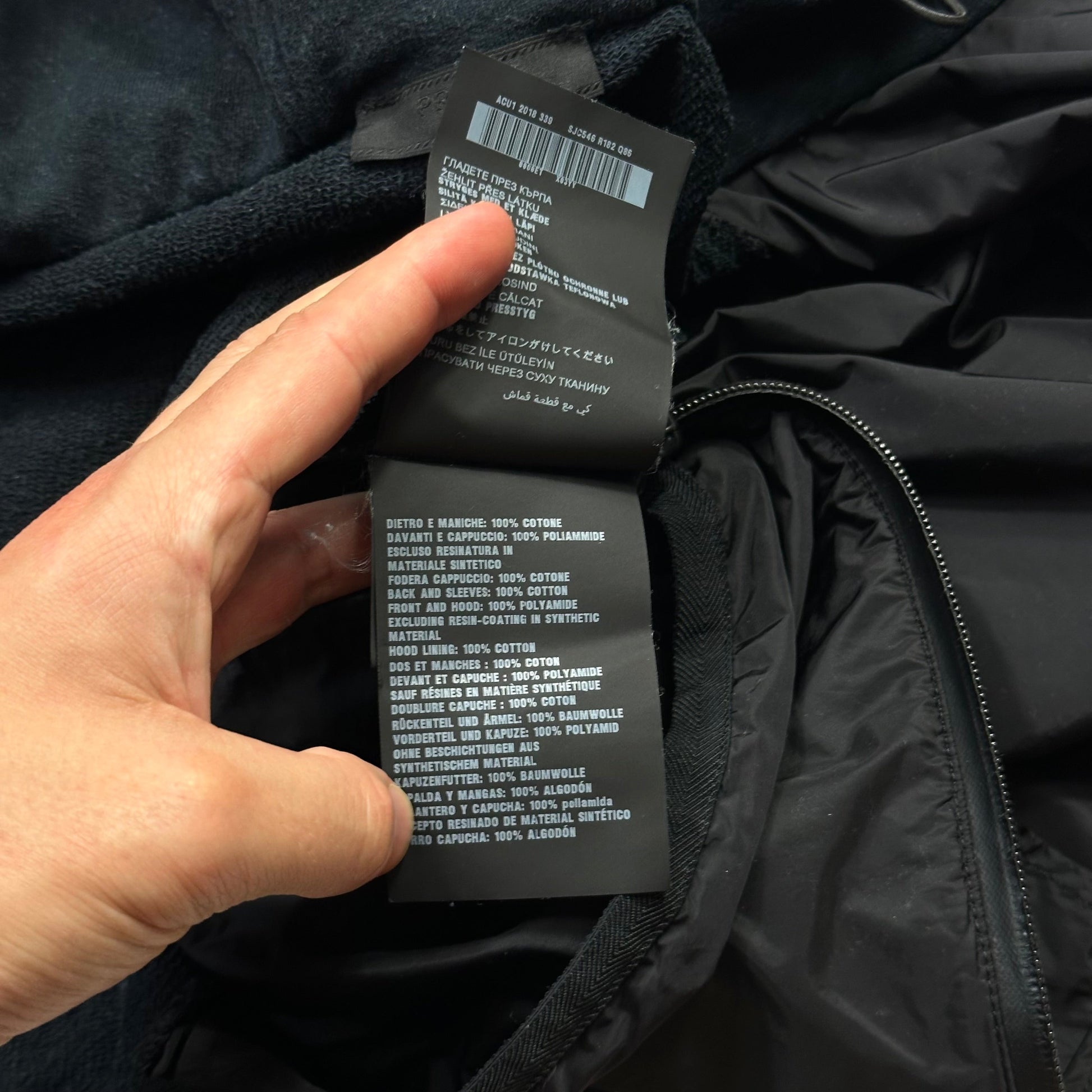 Prada Milano Mainline 2018 Red Tab Linea Rossa zip up nylon panelled cotton hoodie jacket, nylon is a lovely black resin coated material that catches the sun, cotton panels are a dark navy, laminated waterproof zips, hand pockets to front.