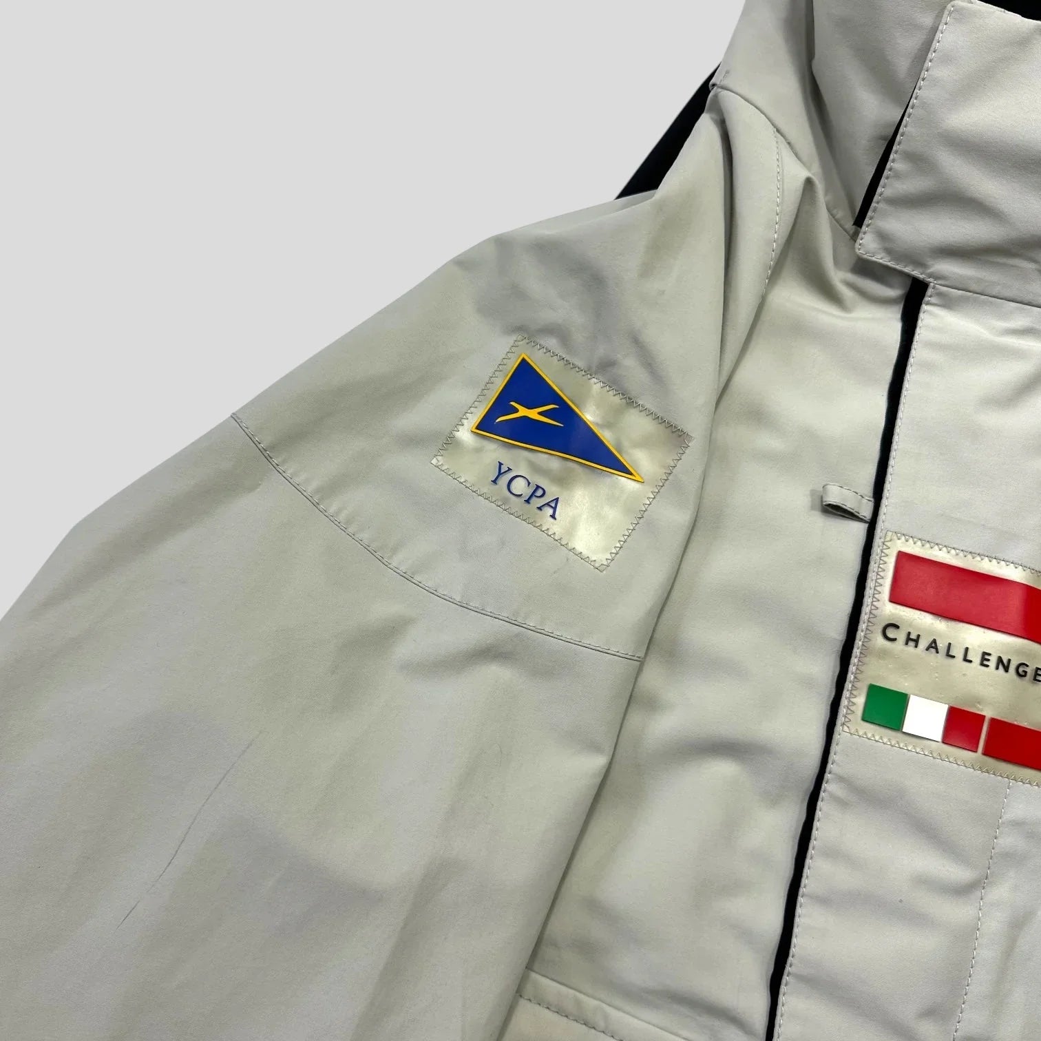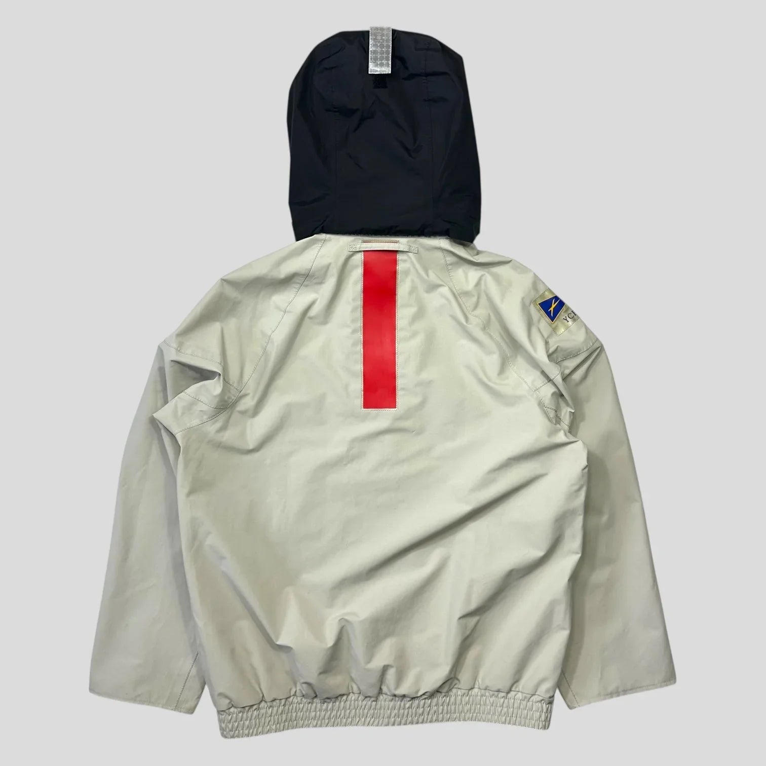 The ‘YCPA’ patch on the arm is representative of the Yacht Club Punta Ala team. There are small differences between this and the version released to the public after the competition, such as slanted pockets, larger chest patches, a velcro reflective strip on the hood and the inclusion of the competition name on the logo.