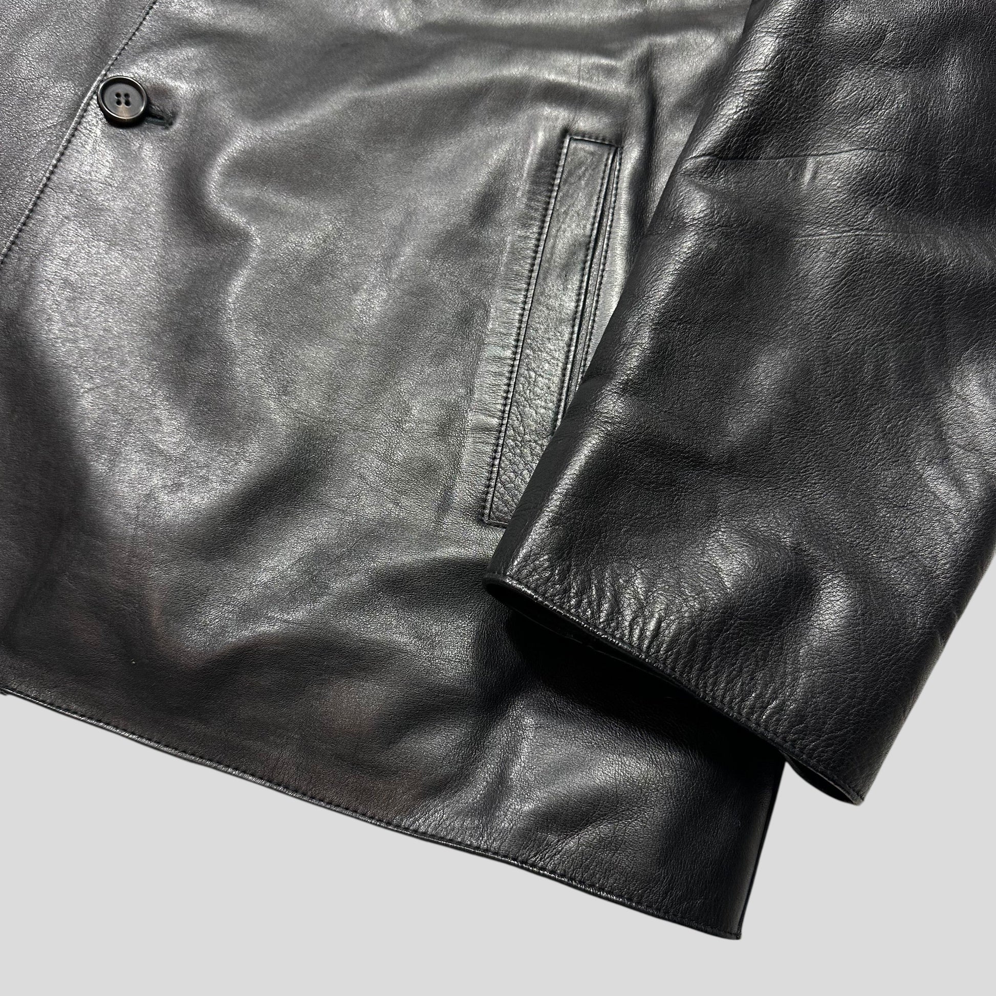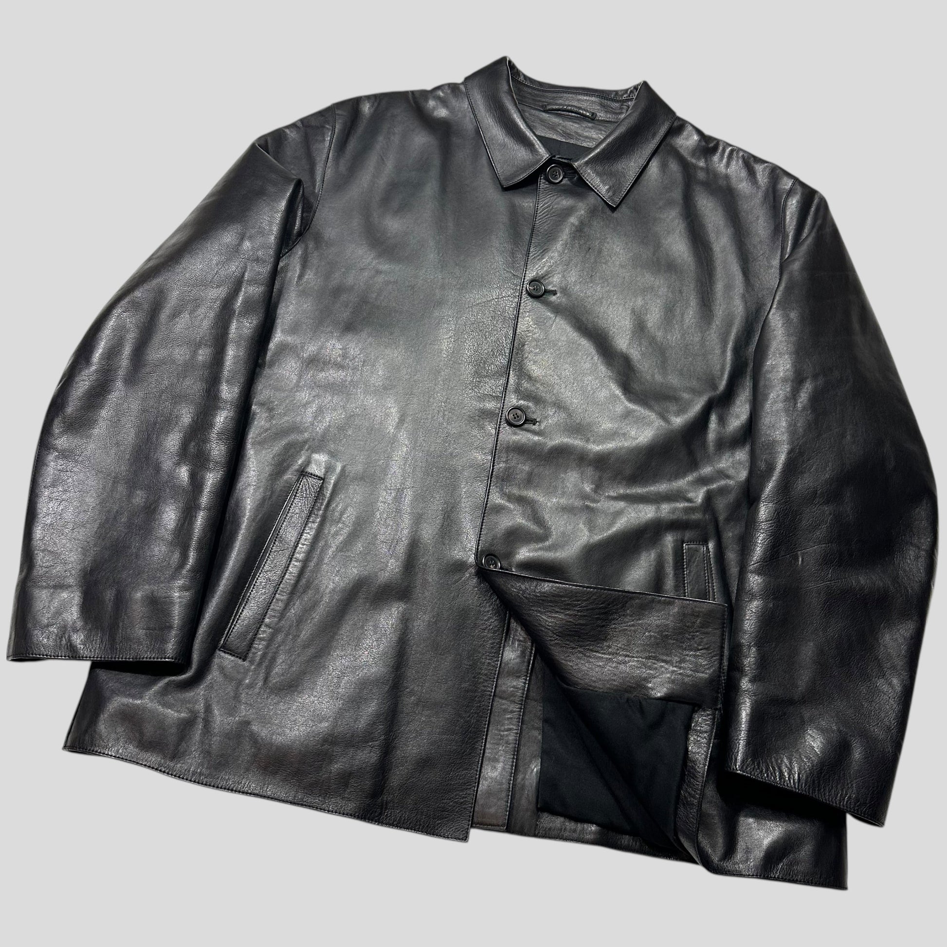 Extremely rare Prada Milano mainline Fall Winter 1998 Lambskin Full Grain Leather super soft and buttery supple leather chore / car coat, incredible piece, lined with a wool body and rayon sleeves, super warm yet wearable almost all year round.