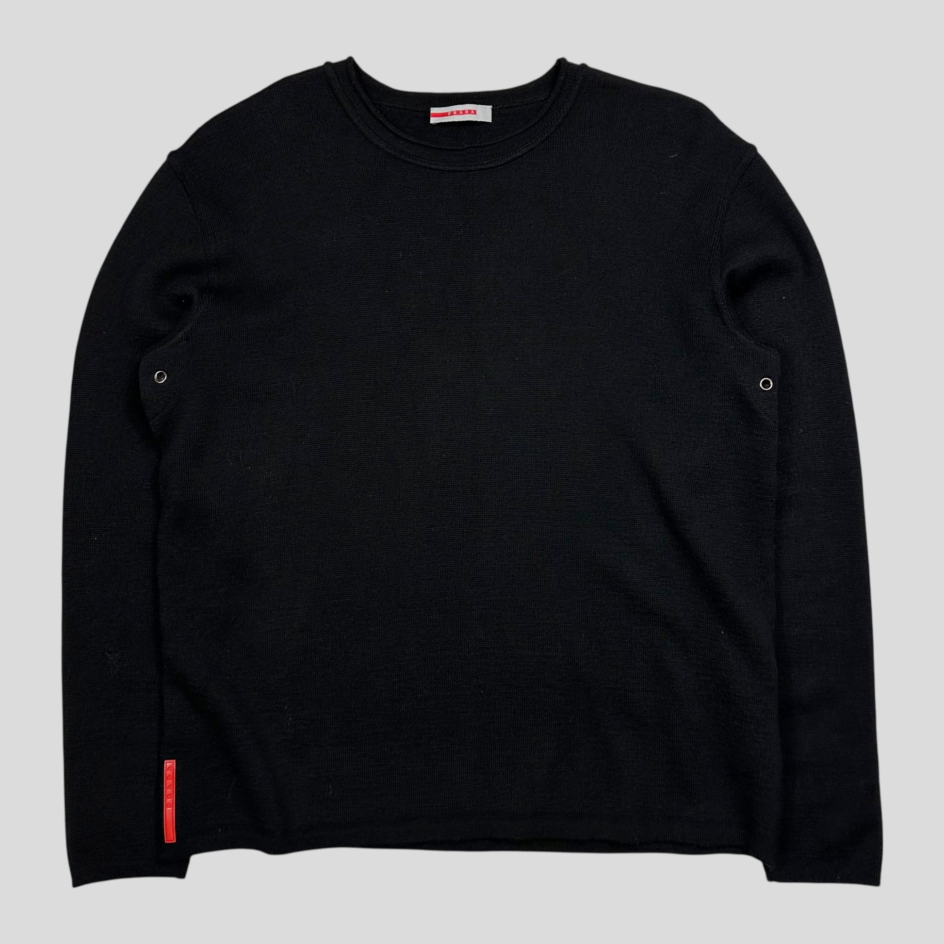 Prada Sport 2006 black waffle knit crewneck thick wool, made in Italy, cozy and warm, red sport logo to hip, nylon backed ventilated pits.