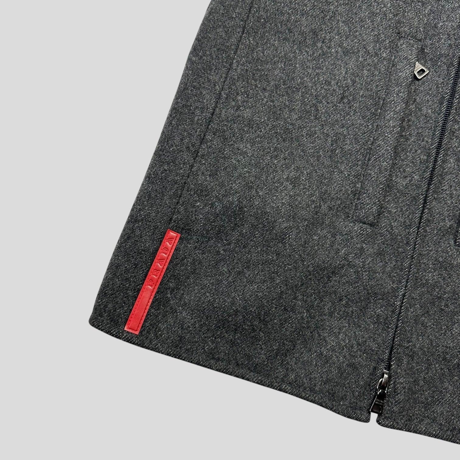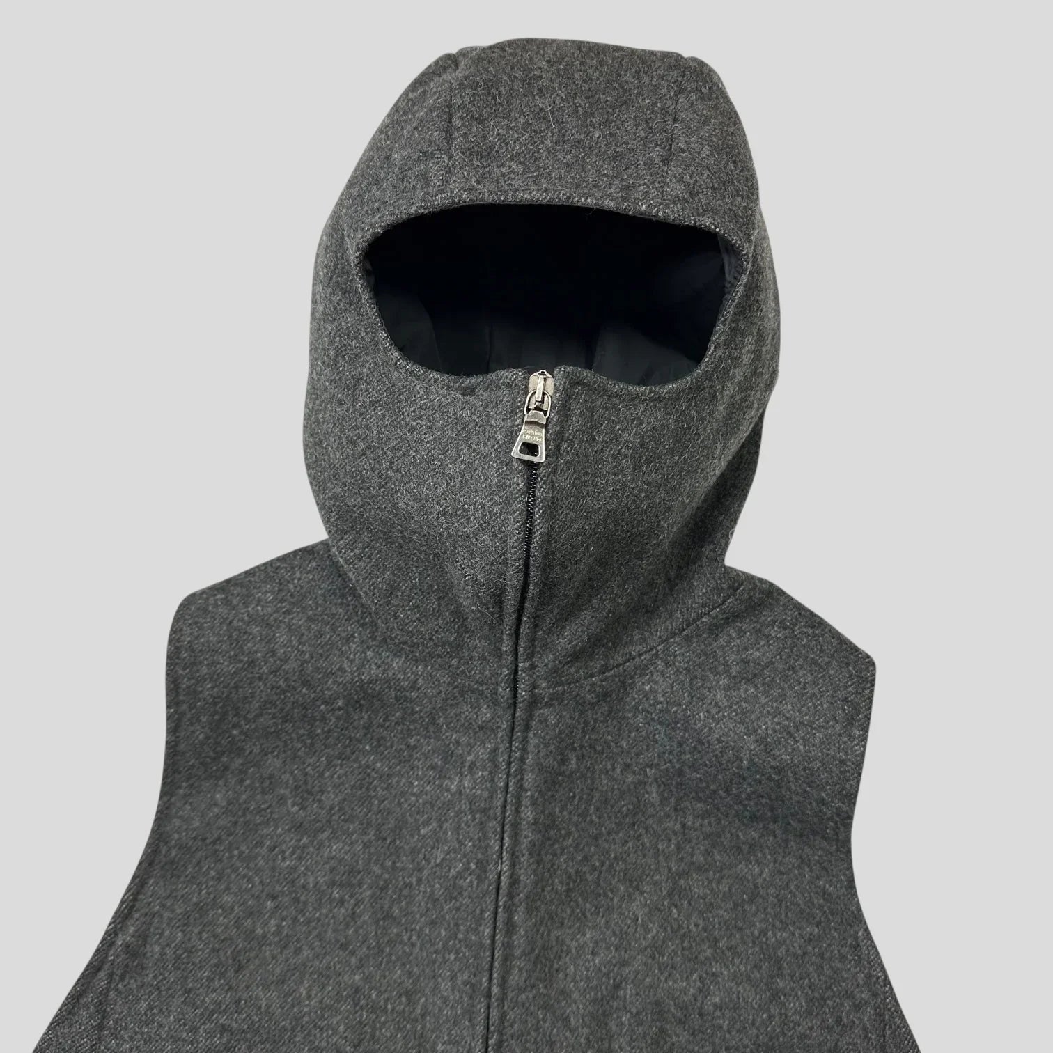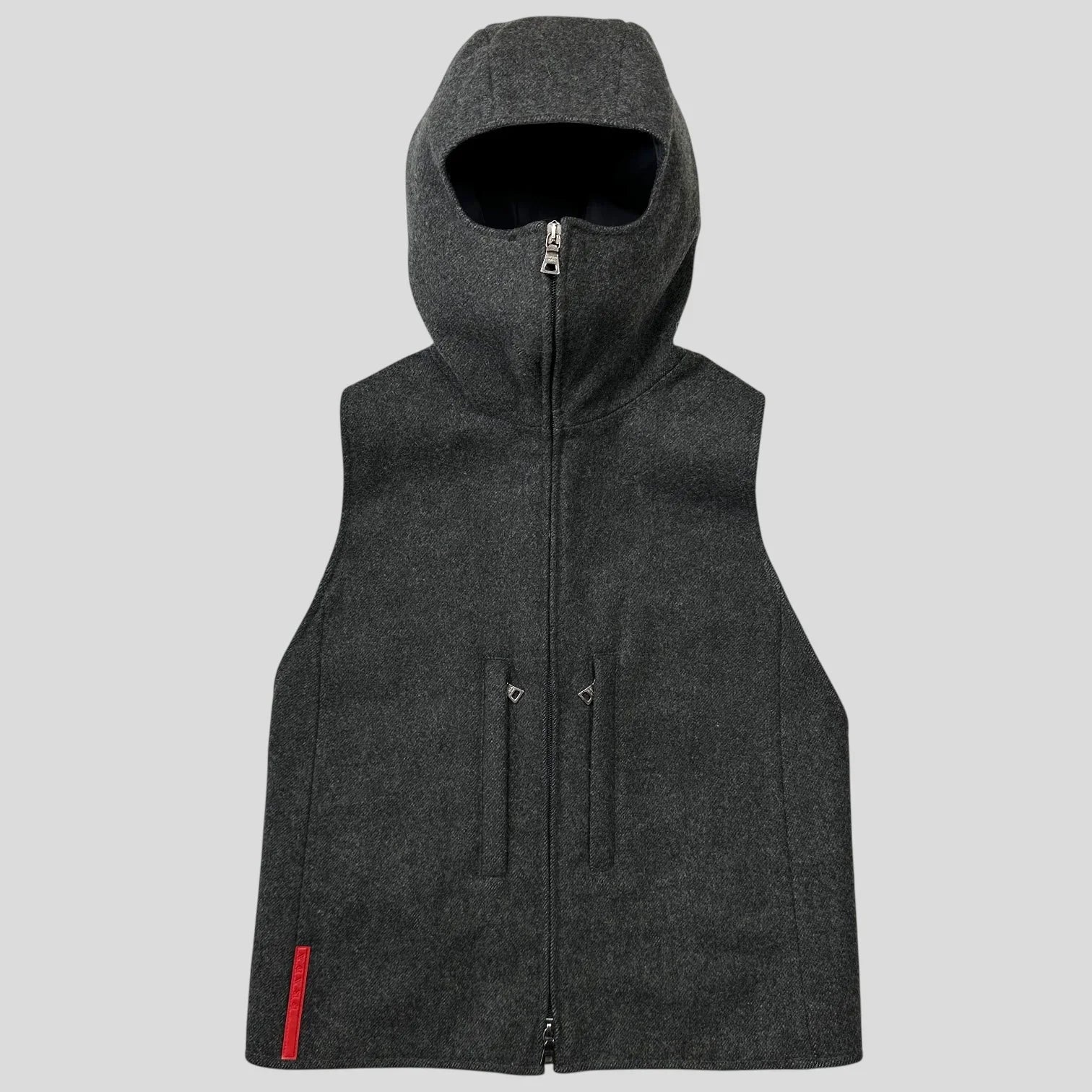 Extremely rare Prada Sport fall winter 1999 Ninja Hood Vest Gilet with reflective 3m adjustable lightning strap open back harness, constructed from grey virgin wool this is likely the rarest iteration of this vest, peaked face cover ninja hood, red logo tab to hip, twin zip chest pockets, nylon lined.
