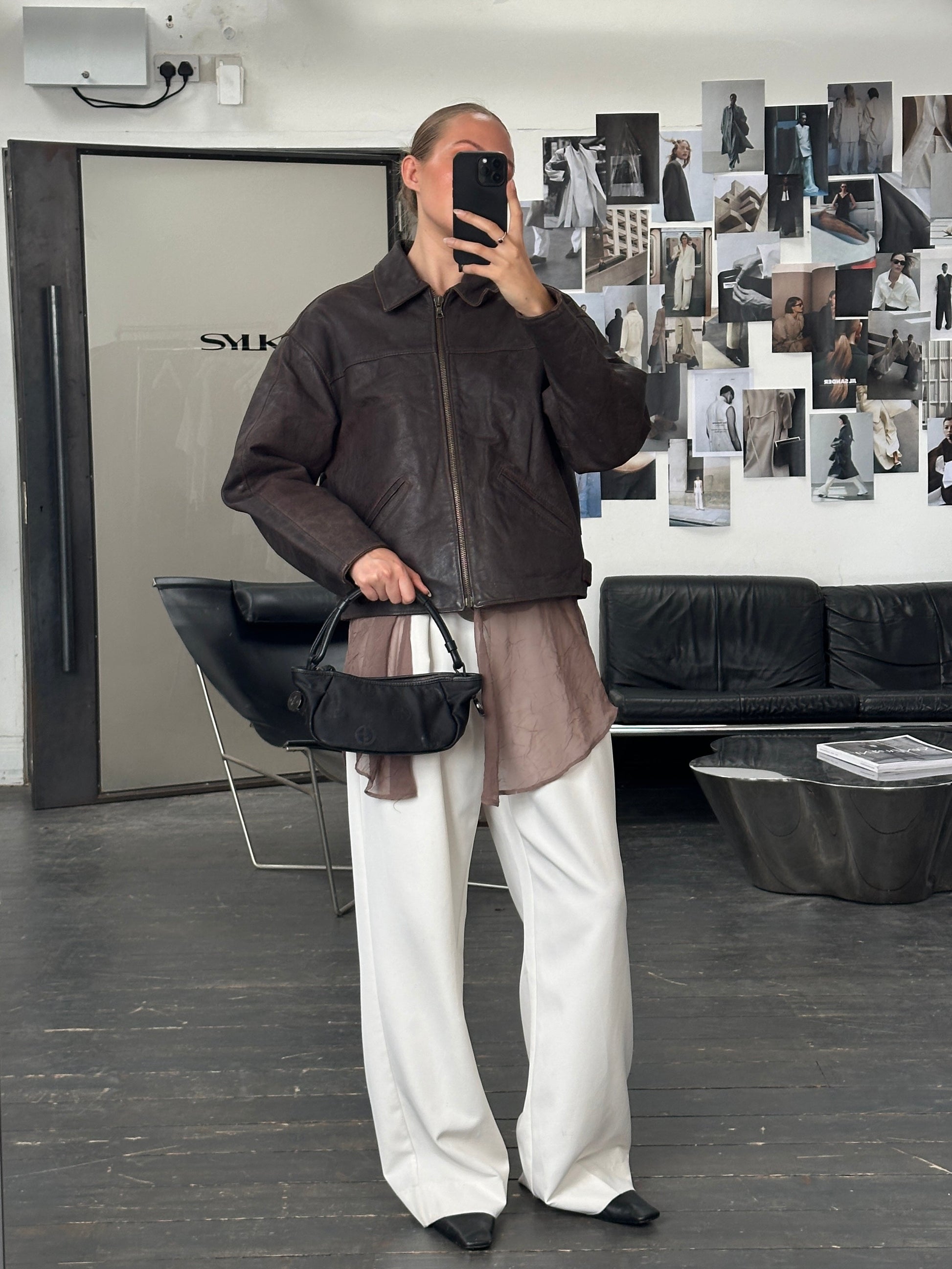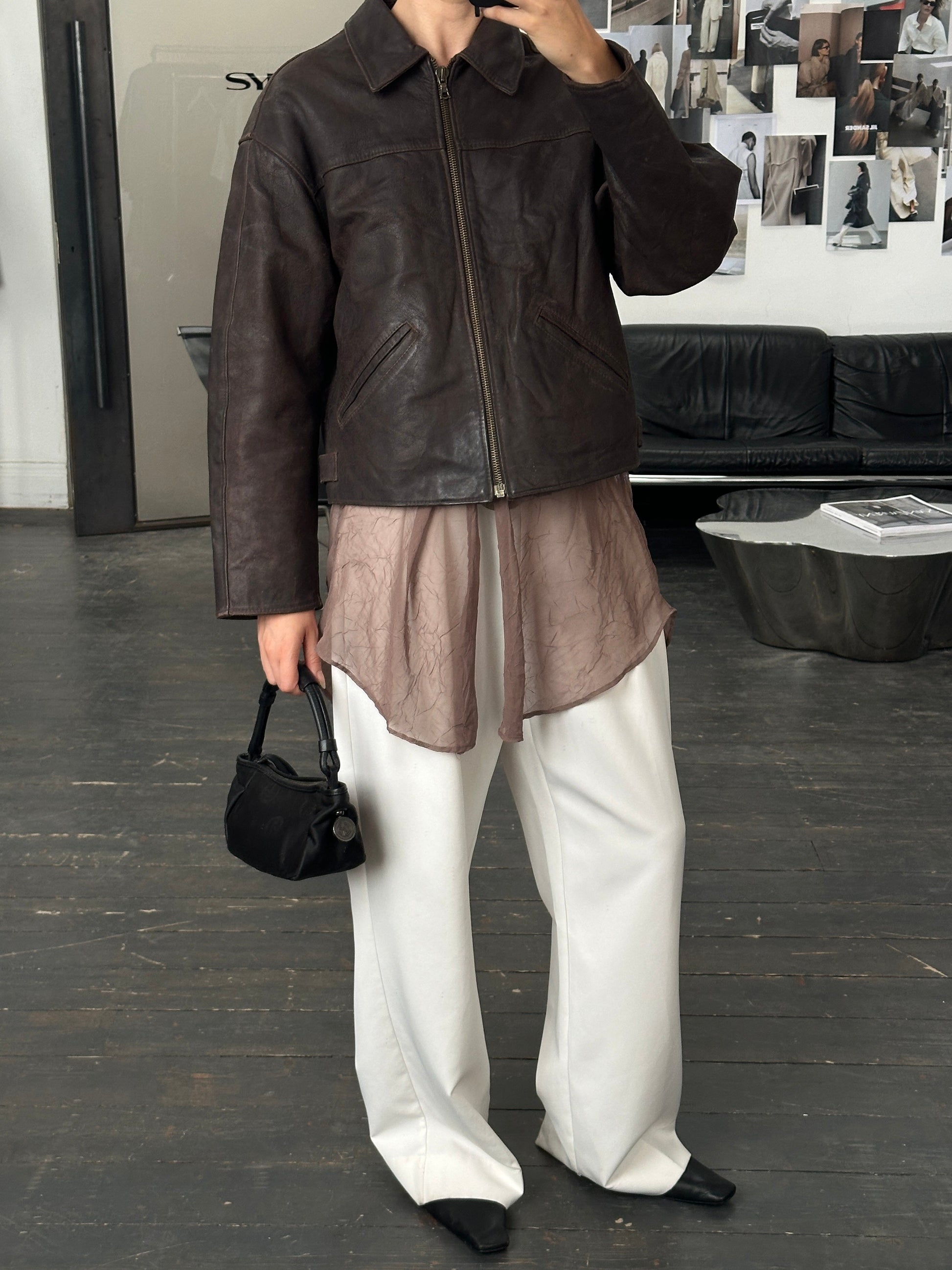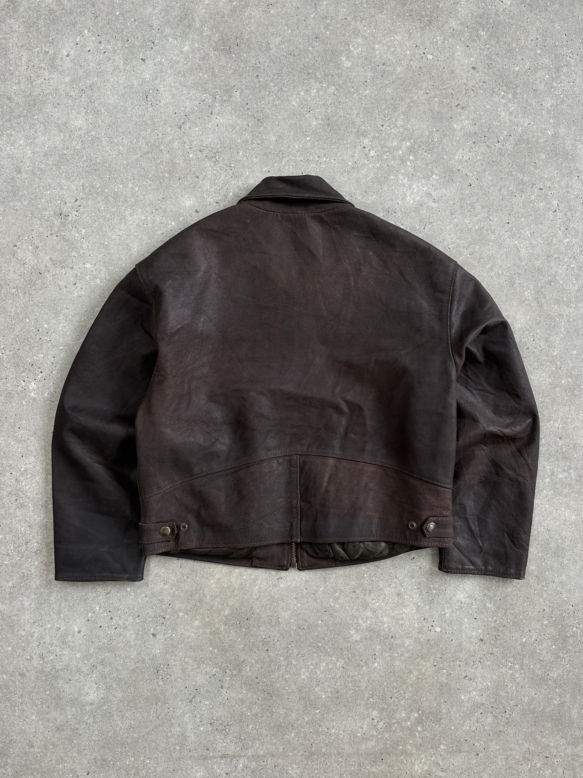This timeworn vintage Italian jacket is crafted in genuine leather with a light quilted lining, welted pockets, and brass hardware. A light boxy cropped fit.  A true piece of 70s–80s Italian leather heritage.