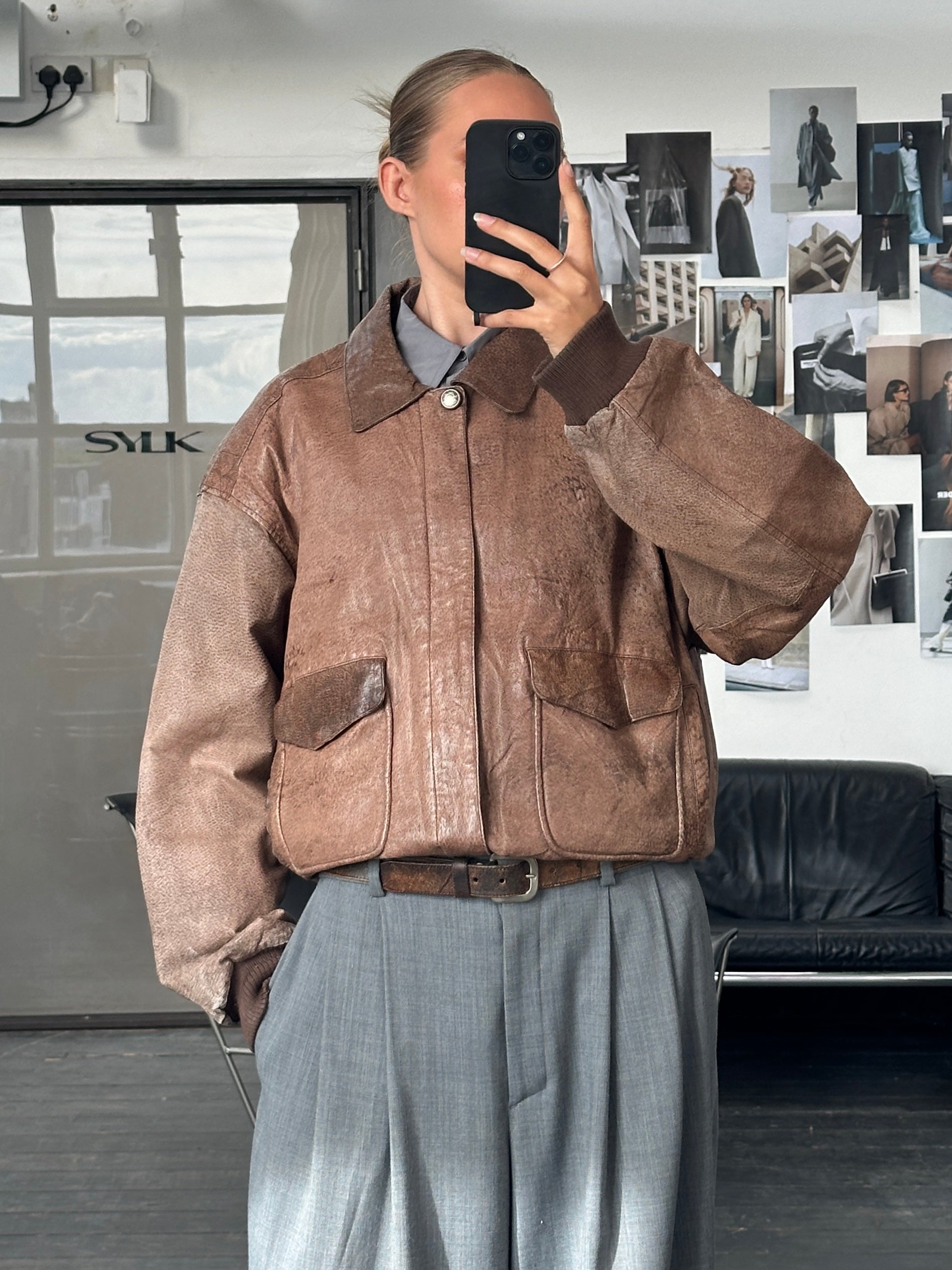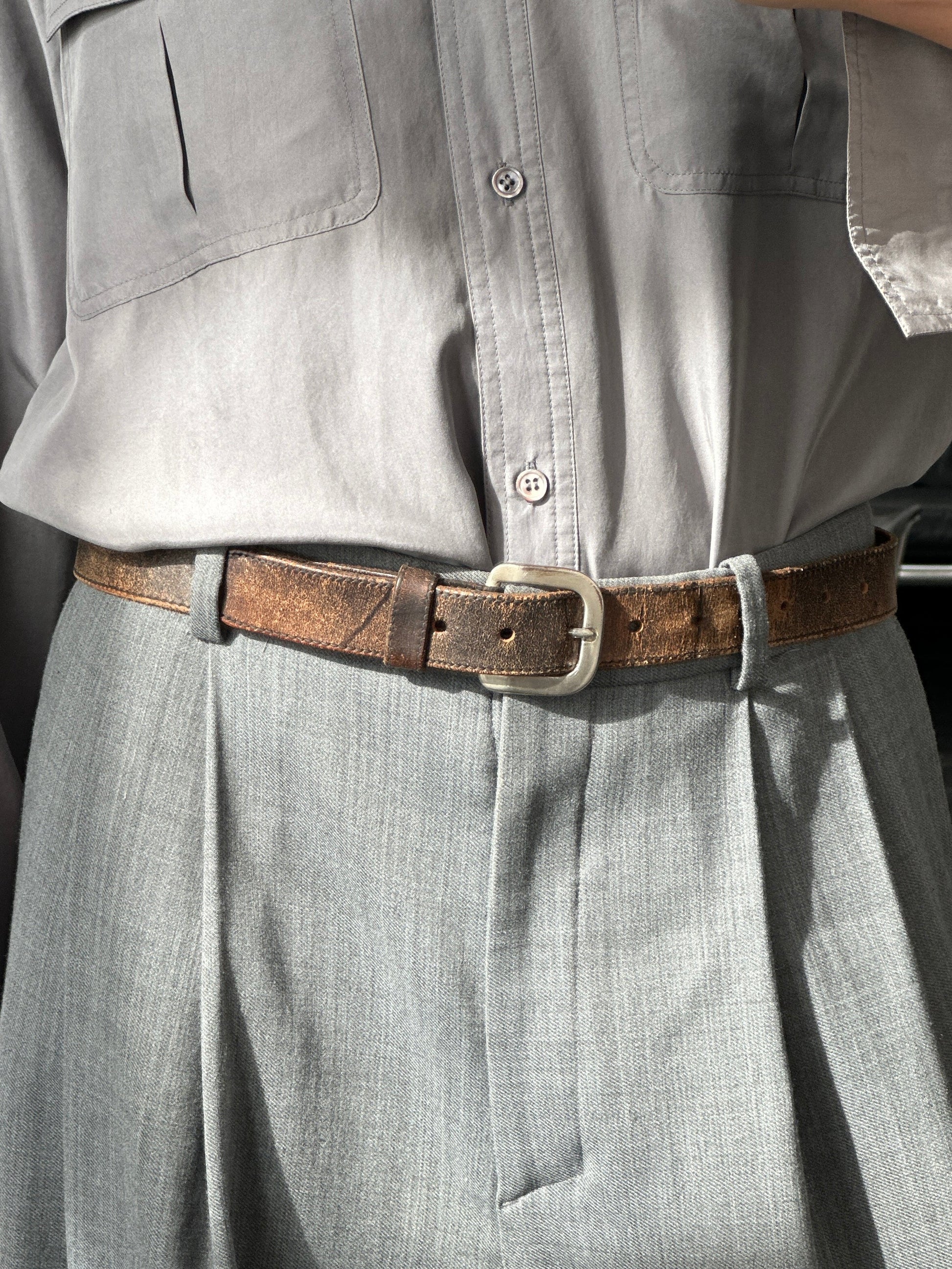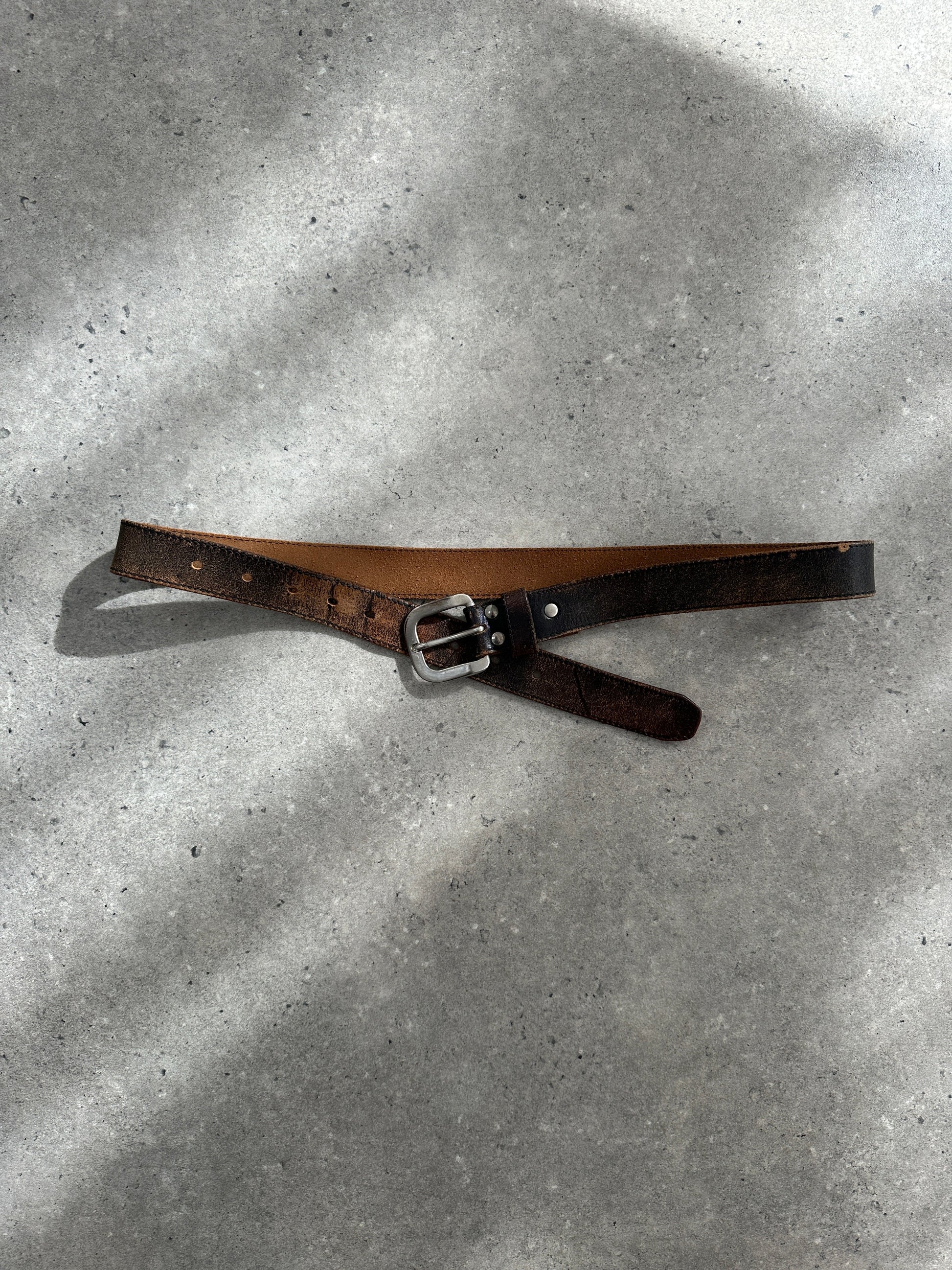 Vintage distressed leather belt with silver tone buckle and natural patina. A timeless utilitarian accessory, carrying decades of wear that adds to its unique character.