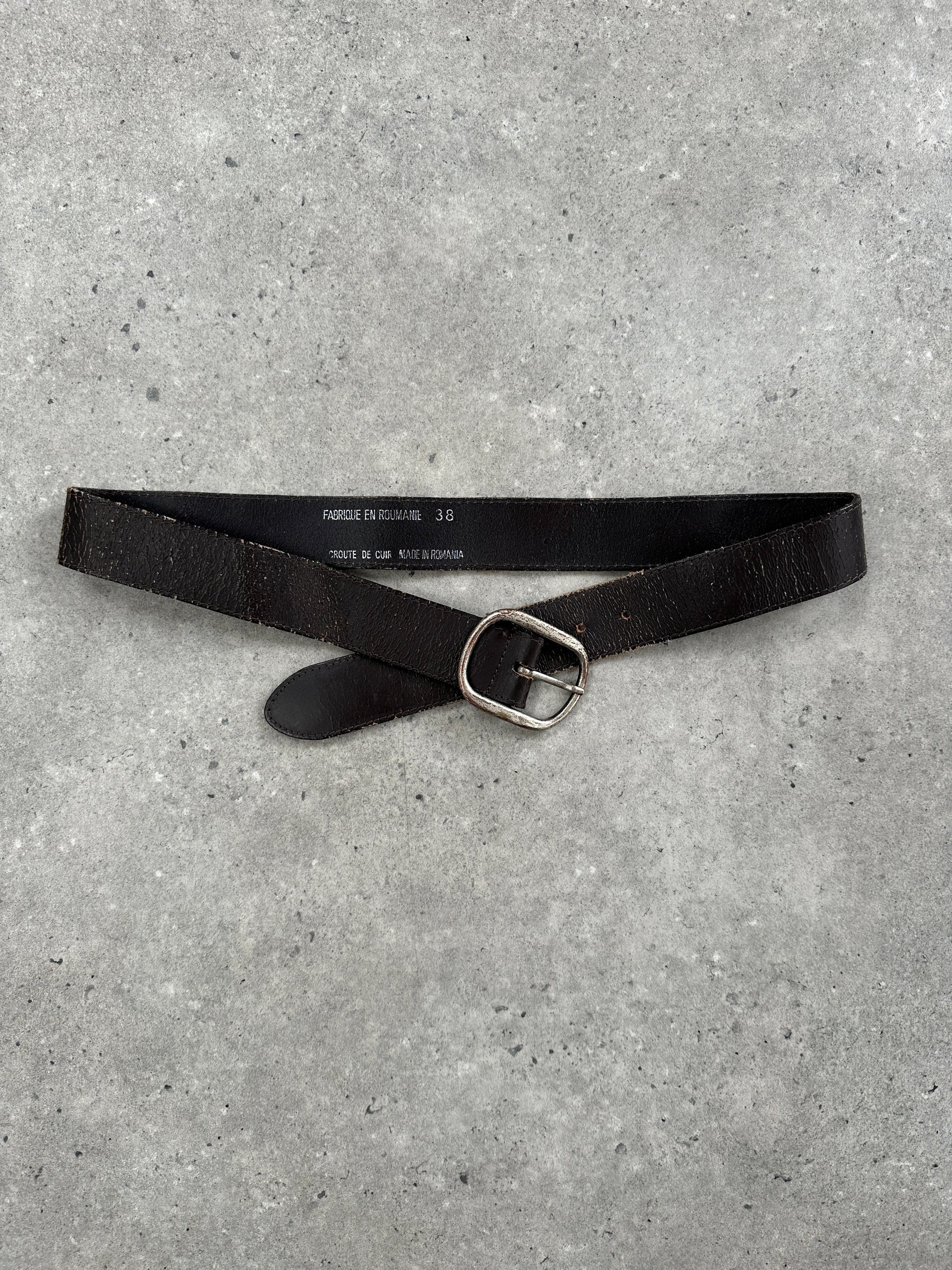 A rugged Romanian-made leather belt, finished with a distressed silver buckle and naturally worn-in patina.