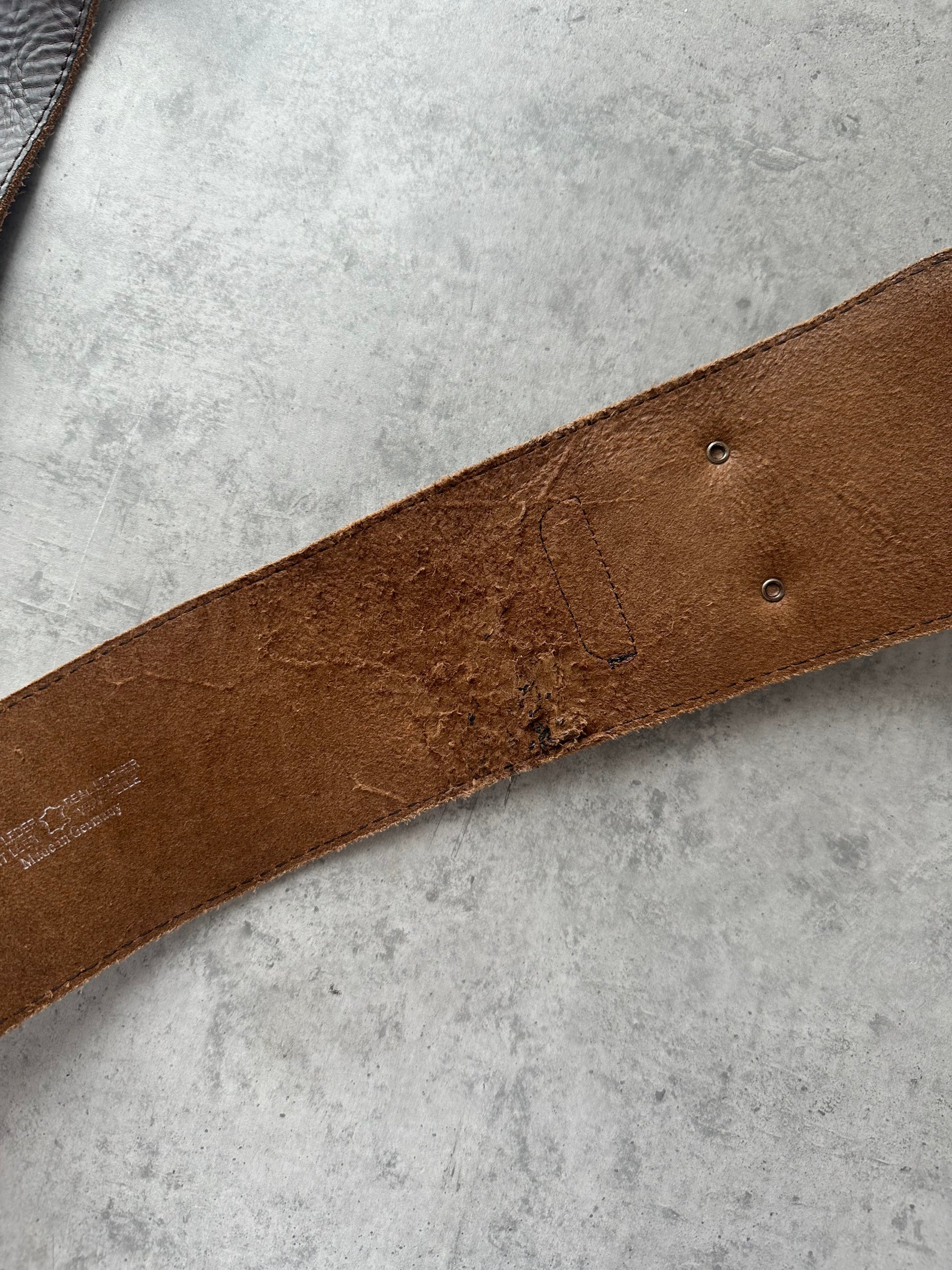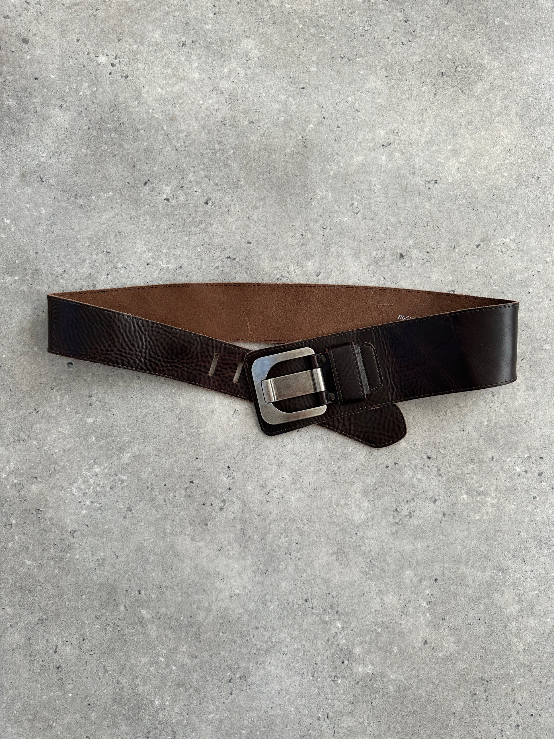 A structured German-made wide leather belt by Bernd Götz, crafted in grained dark brown leather with a bold industrial buckle for a cinched waist silhouette.