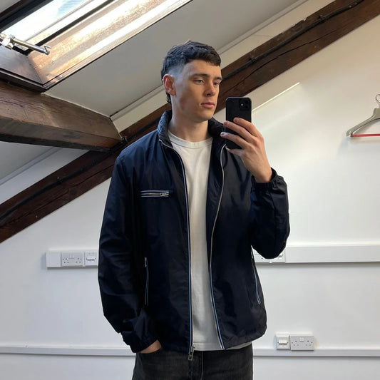 Produttore:ajpg_shopPrada Navy 2015 Contrast Stripe Zip Concealed Hood Nylon Windbreaker Jacket