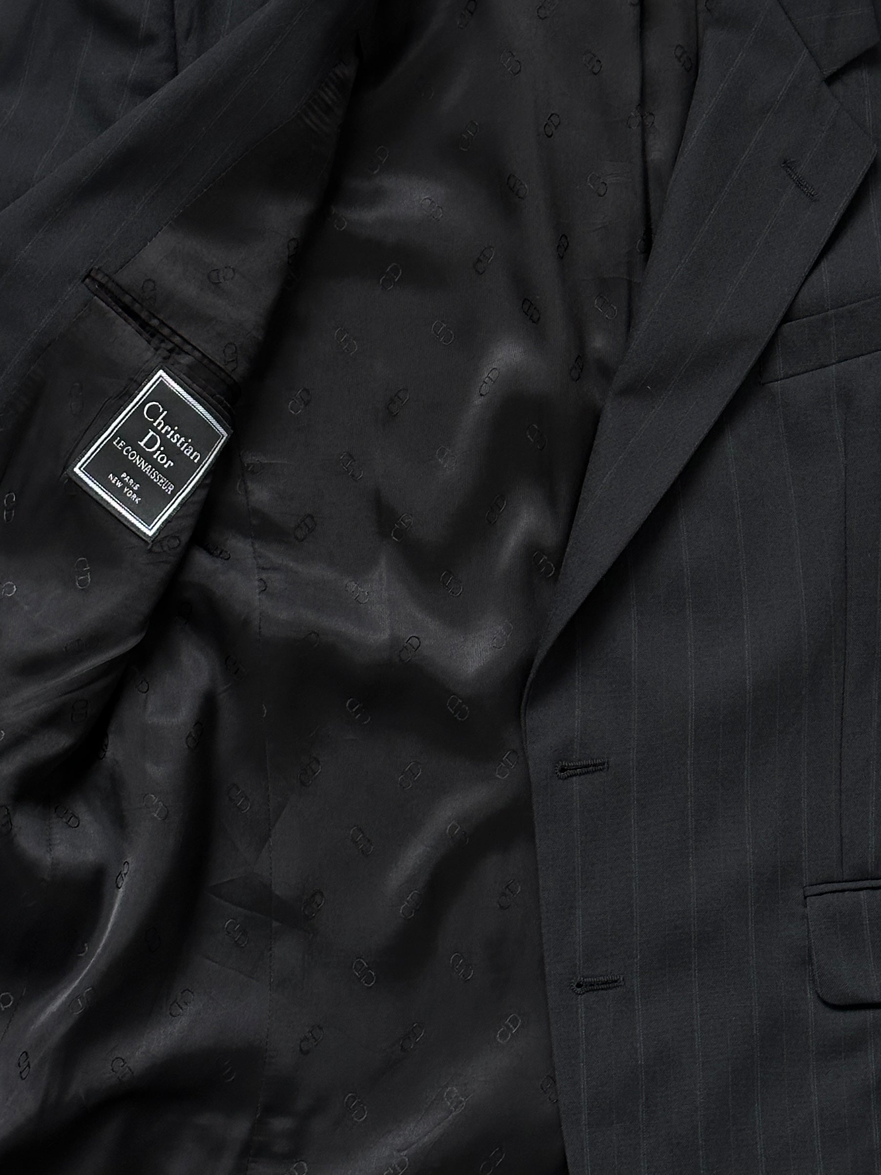 A tailored 1990s vintage Christian Dior Le Connaisseur blazer in classic black with fine vertical stripes and a subtle CD monogram lining throughout. Cut with a structured shoulder and clean single-breasted silhouette, offering a sharp formal profile with understated designer detailing.