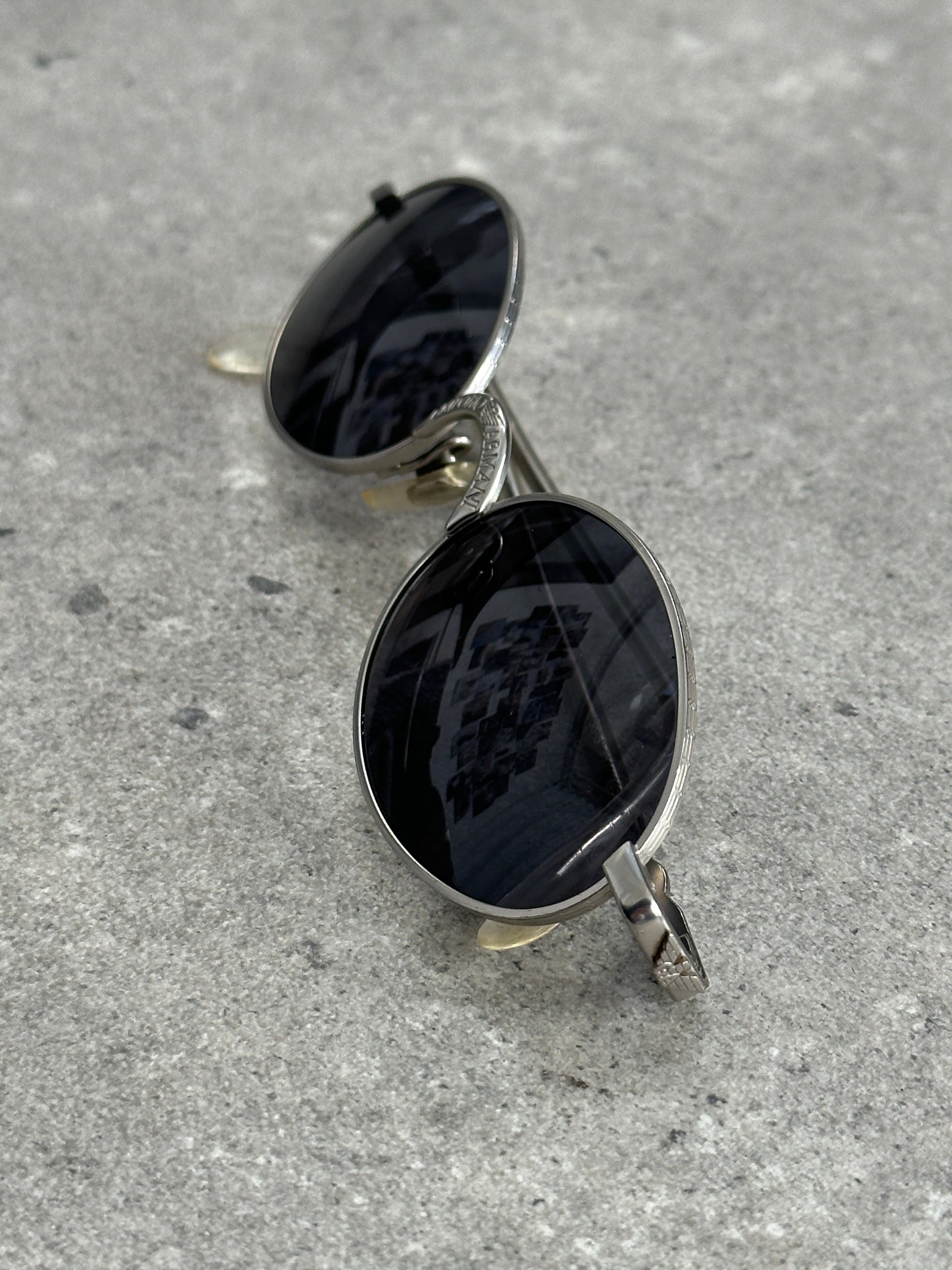 Minimal oval metal sunglasses with engraved Armani branding - a sleek late 1990s Emporio Armani classic.