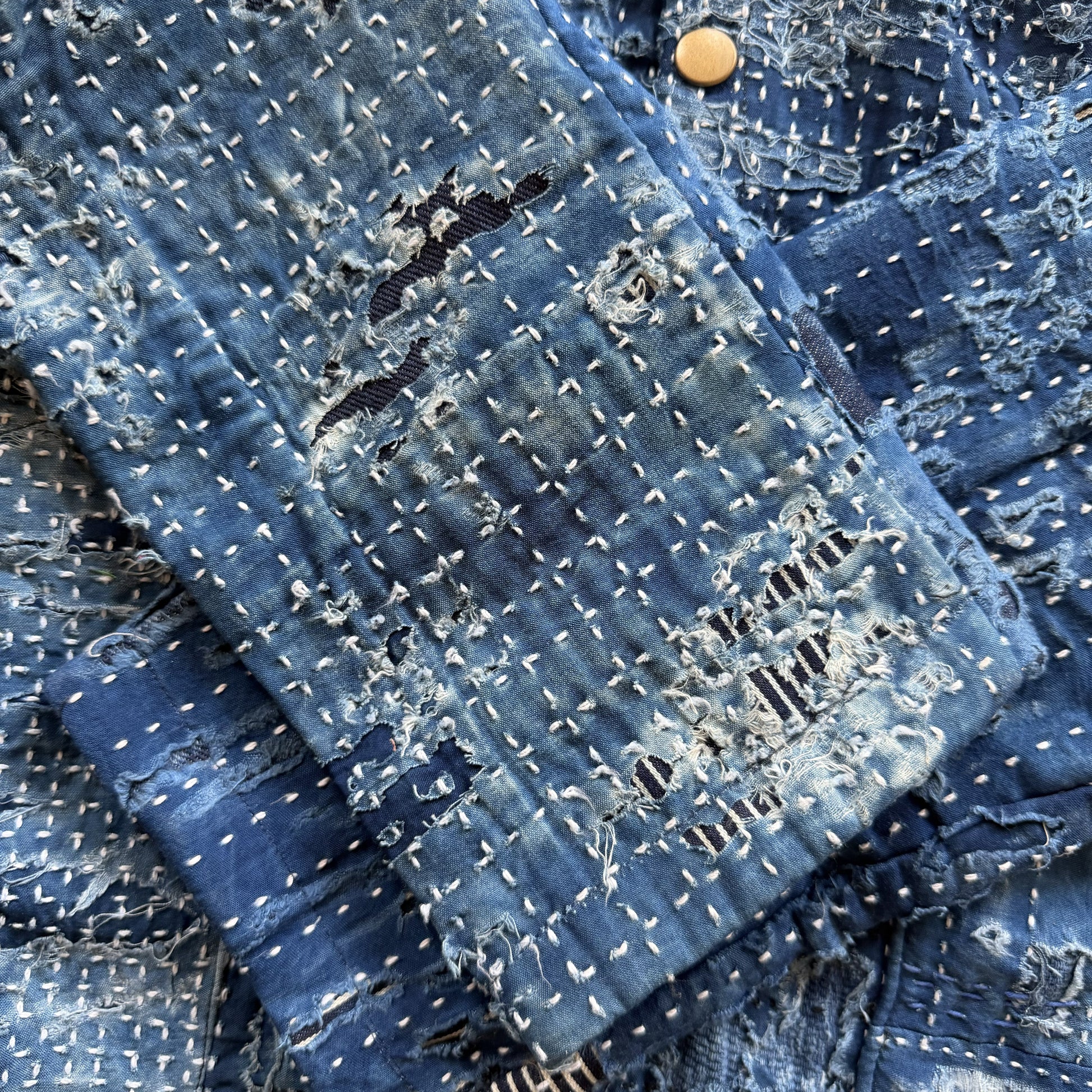 Japanese Boro Sashiko Distressed Collarless Box Denim Jacket