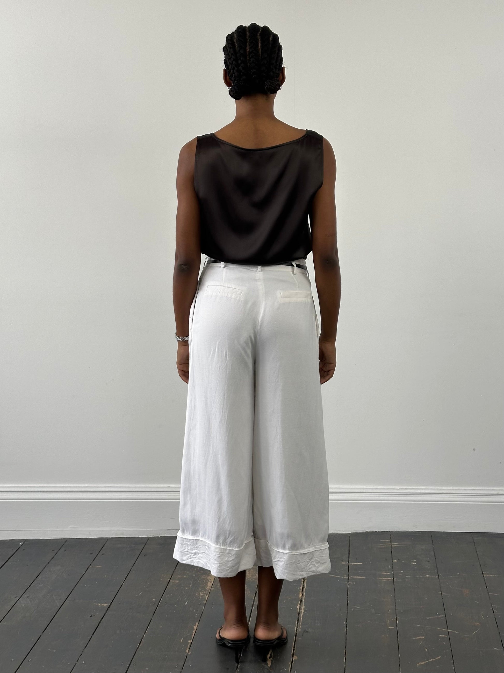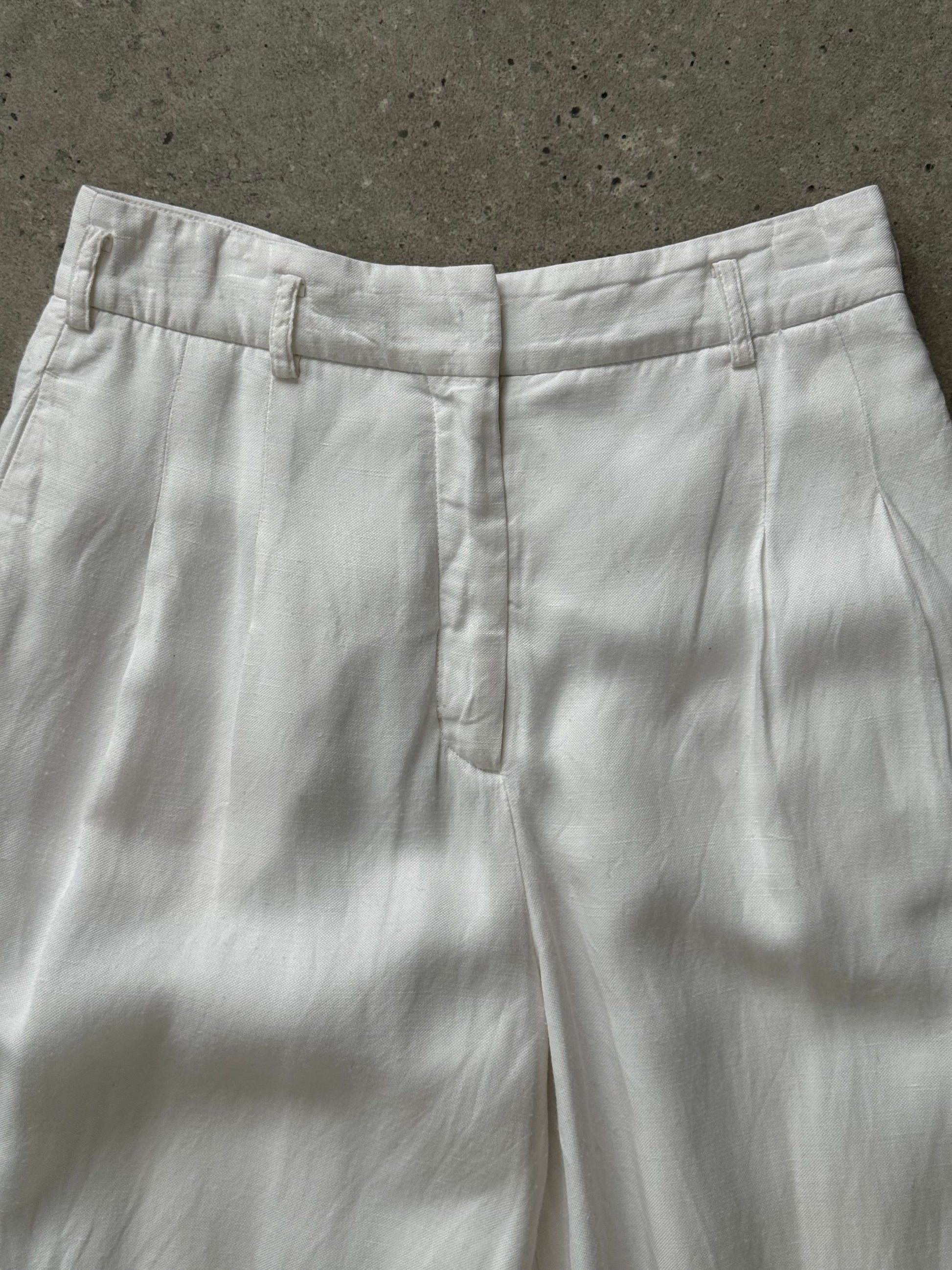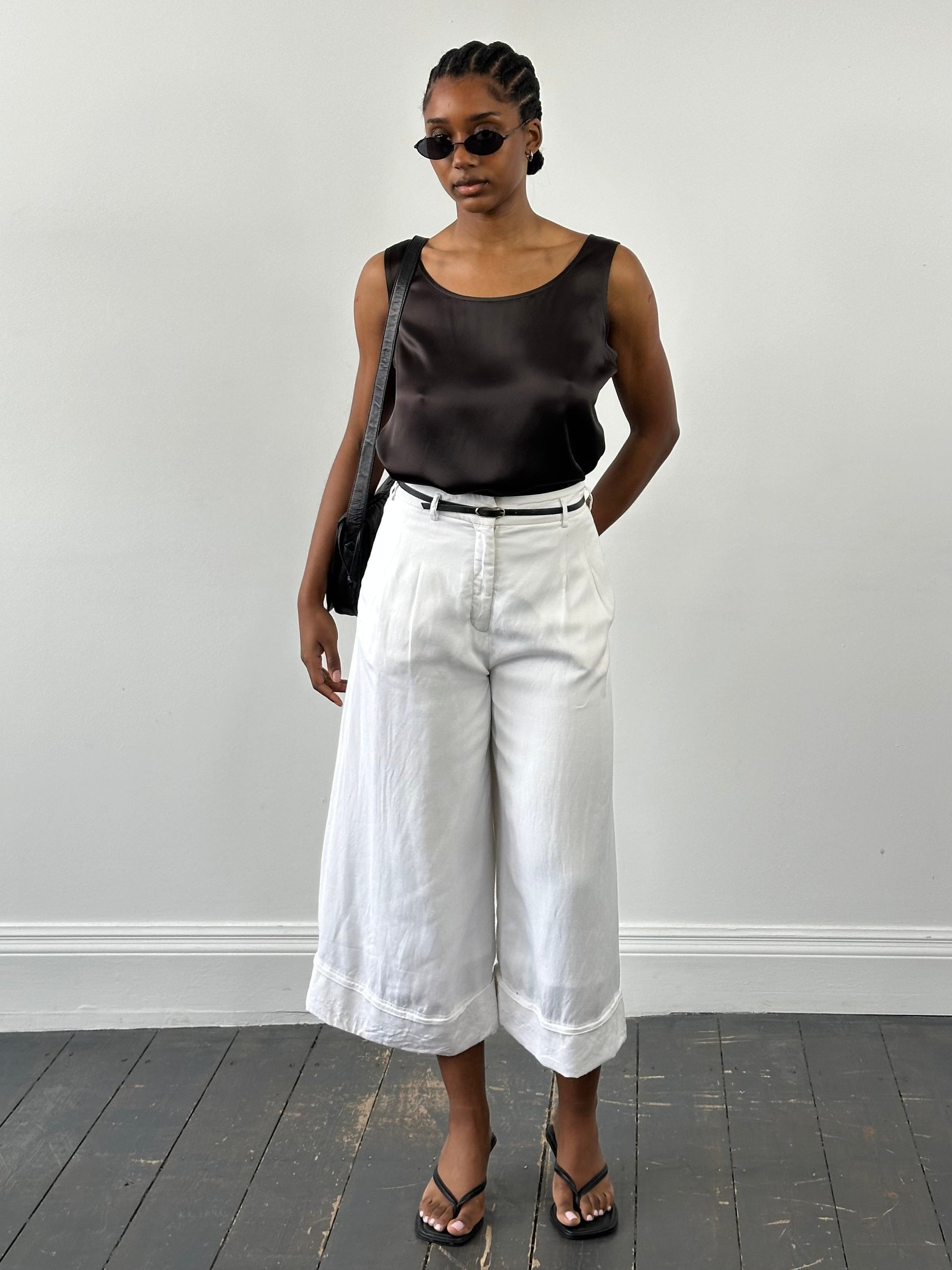 A vintage 1990s pair of wide leg culottes in a soft white tone with a lightweight, structured feel. Designed with a clean waistband, belt loops, and front pleats, creating a relaxed and fluid silhouette.