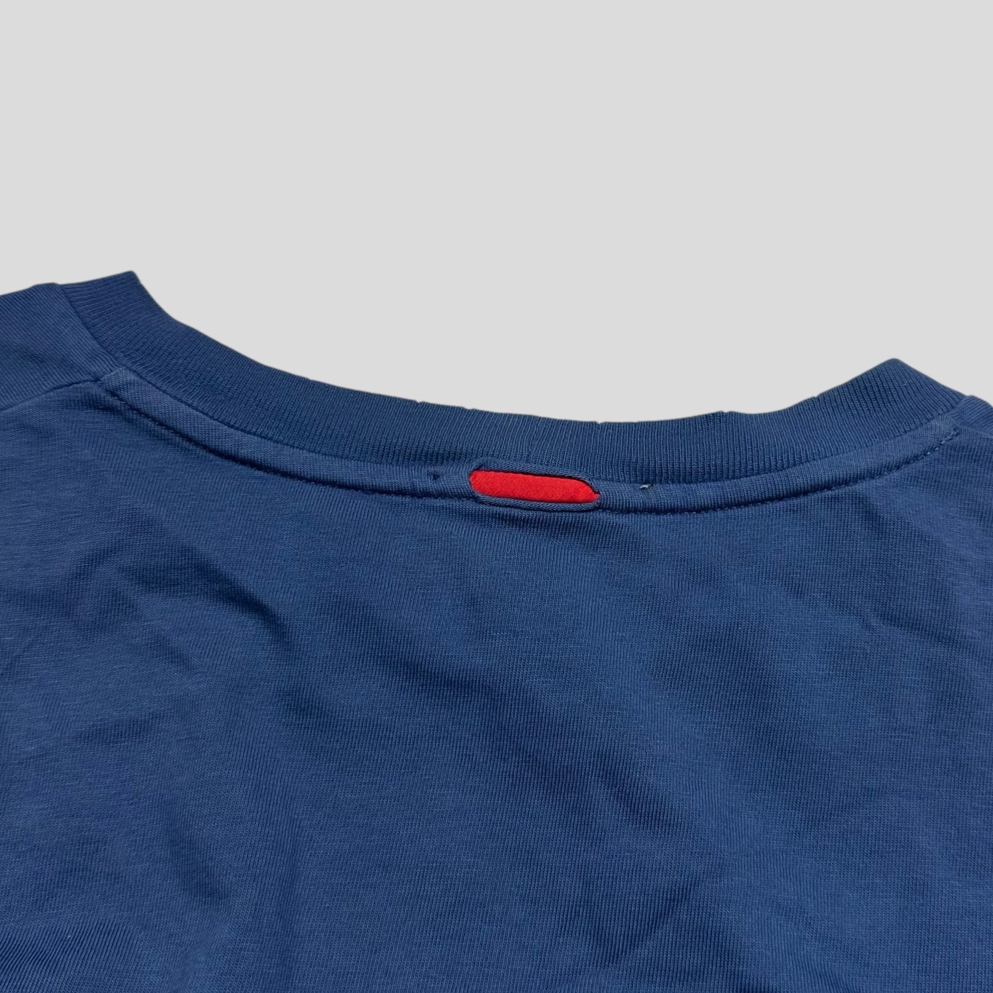 Prada Sport royal blue longsleeve with unique distressed surfing embroidery, red Prada sport logo on the back neck, hip and on the surfboard.