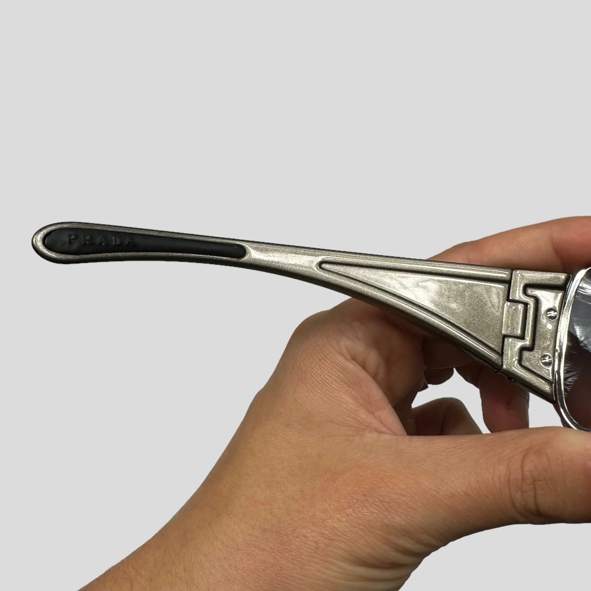 Rare pair of Prada Sport sunglasses, wraparound frameless shield lens with metallic grey arms finished with the Prada Sport Luna rossa red tab logo, UV protective smoke grey lenses.