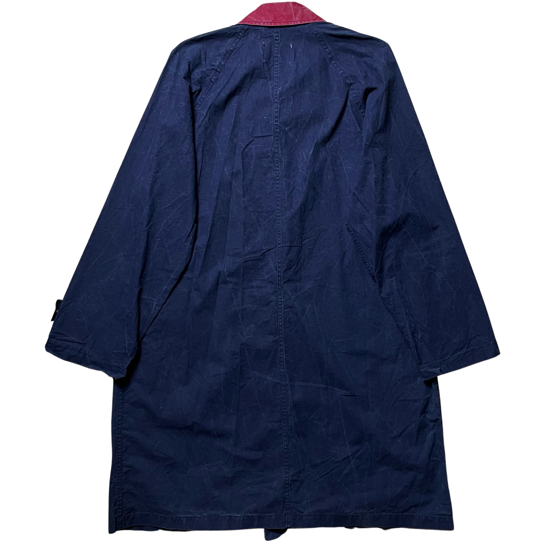 Designed by Massimo Osti. First season Isola Di Pietra Macintosh style jacket made from the iconic Tela Stella fabric in a Midnight blue/Scarlet red colour way. Contrast coloured collar, dress flap style patch pockets. Metal tin push through buttons feature throughout. Complete with cuff placement hand stitched patch.