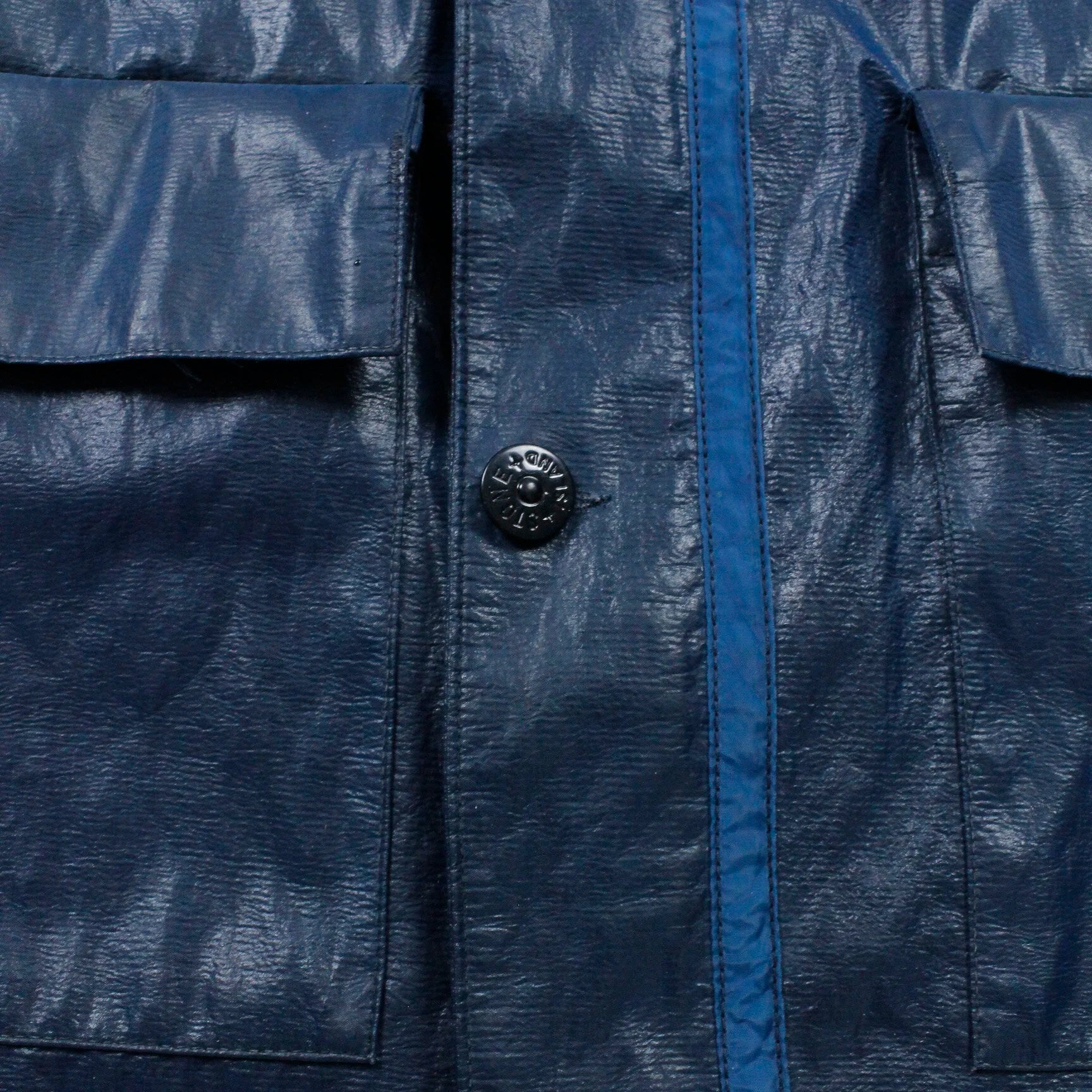 Paul Harvey designed ultra-light mesh in transparent nylon monofilament applied to polyester jersey with a polyurethane coating on the internal face, fine ribbed cotton tape covering the seaming pattern throughout. Full zip and embossed push through button fastening. Concealable stow away hood function, hidden by a single layer nylon mesh. Two large patch pockets with Velcro closure. Garment dyed using a double recipe, cotton for the fabric accessories and nylon for the monofilament fabric on the outer layer. The contrast of the internal base material creates an iridescent effect to the finished garment.