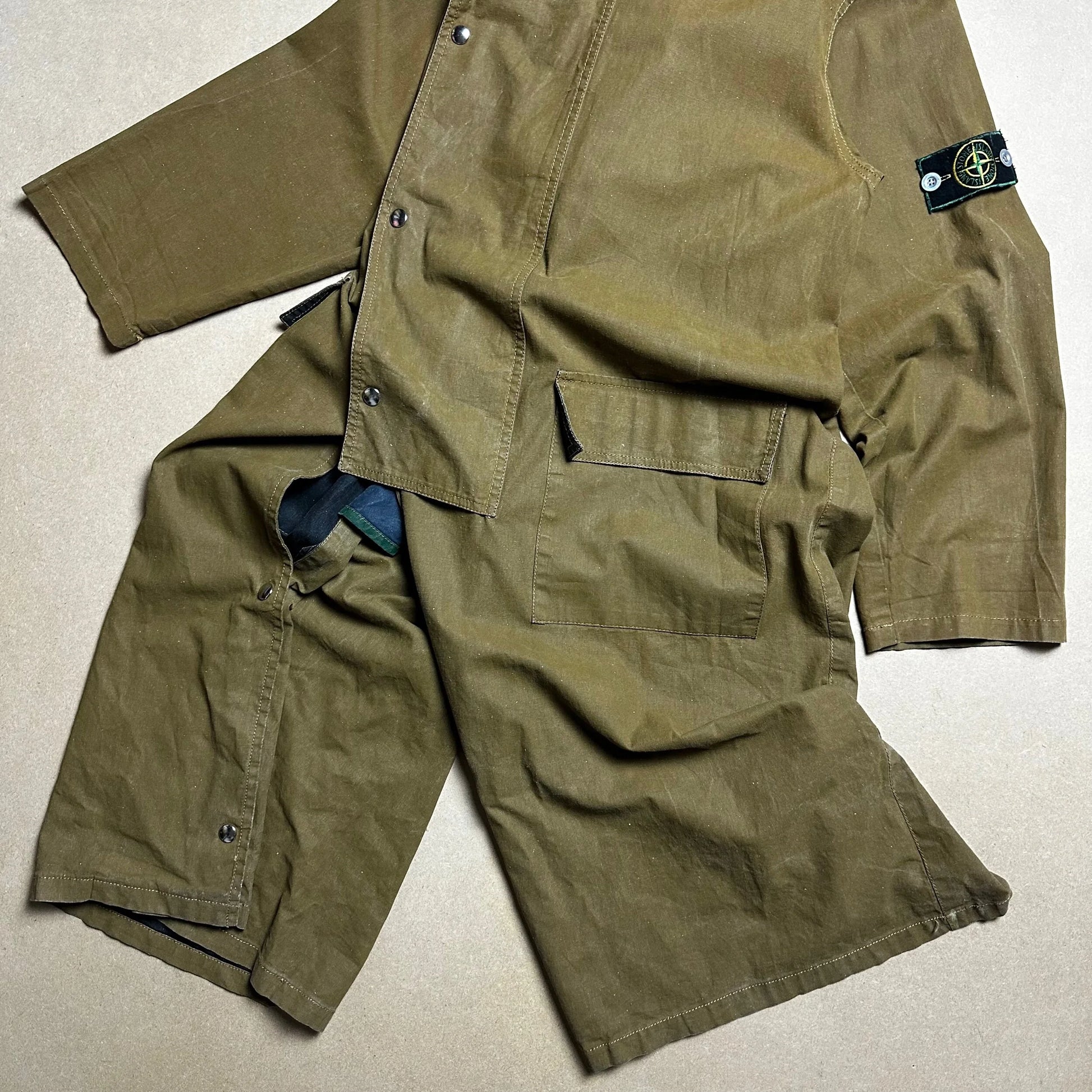 Designed by Massimo Osti. From the brands first season. Tela Stella multi tonal fabric. Trench coat duster style construction with semi transformable hem. Wide spread collar. Split hem with pleated centre.flap closure patch pockets. Dual track press stud closure. Hem can be transformed into shorts for use of motorbike riding.