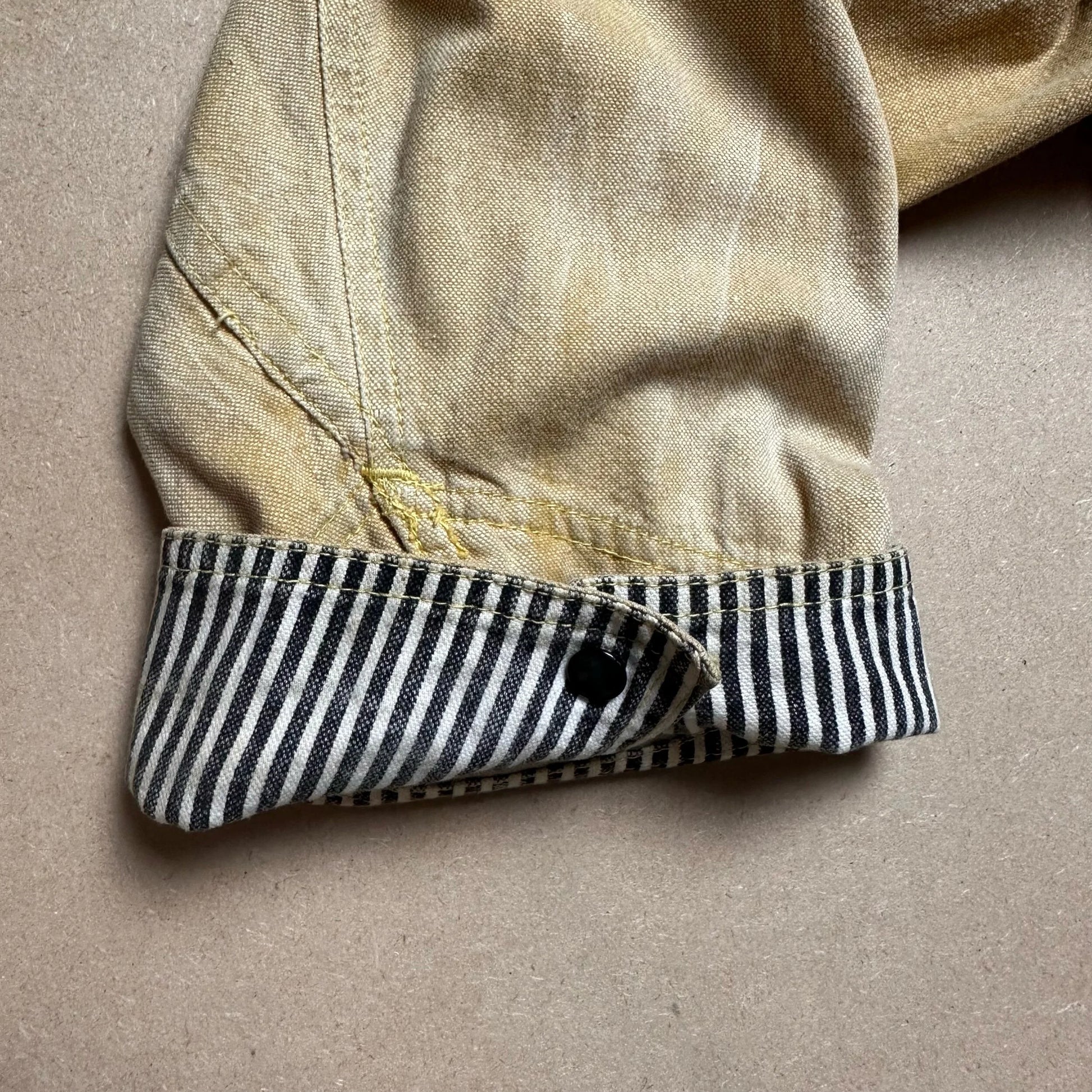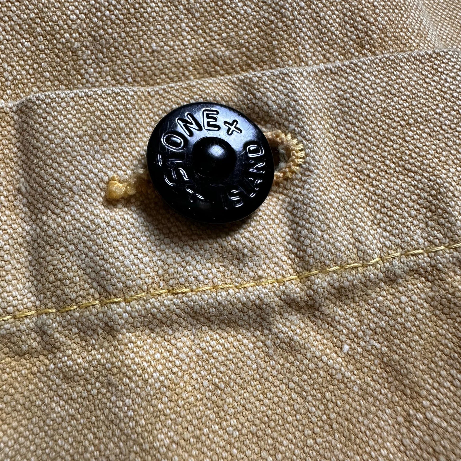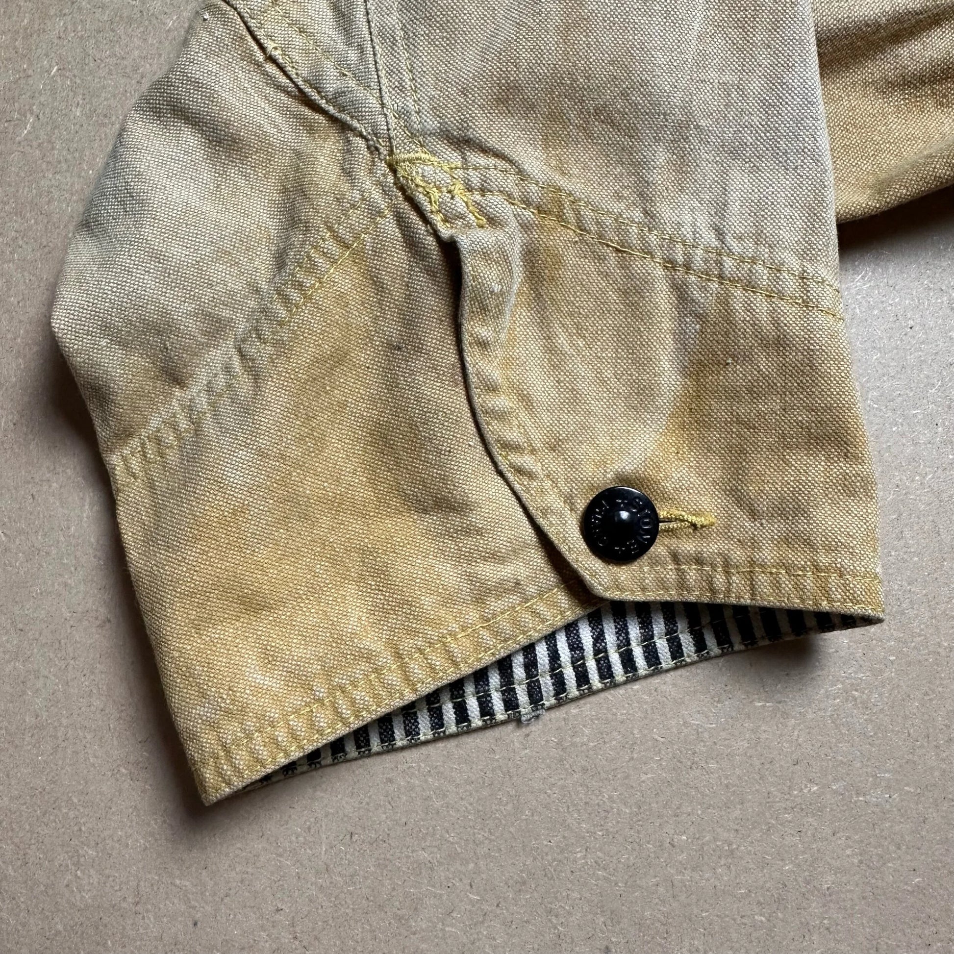Designed by Massimo Osti. Cropped fitting carpenter jacket in an enzyme wash denim. Over-dyed in a Honeycomb Yellow colour. Striped internal cuffs and collar. Dual patch pockets with engraved button closure. Complete with an iconic square patch.