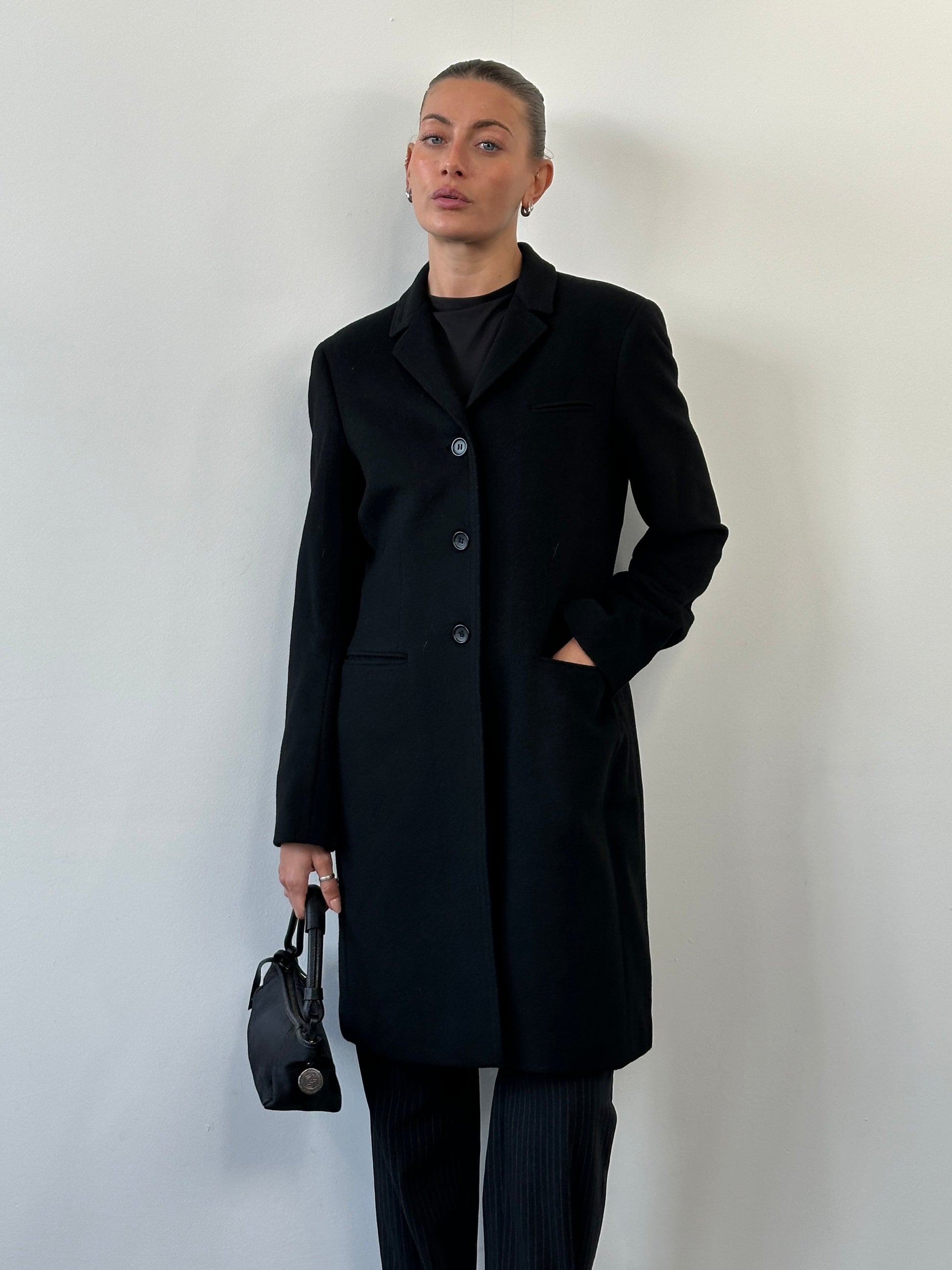 Vintage Italian black 1990s lightweight coat crafted in Italy from a fine wool and cashmere blend, offering a clean single breasted silhouette with understated tailoring. A refined, minimal piece designed for easy layering with a soft structured drape.