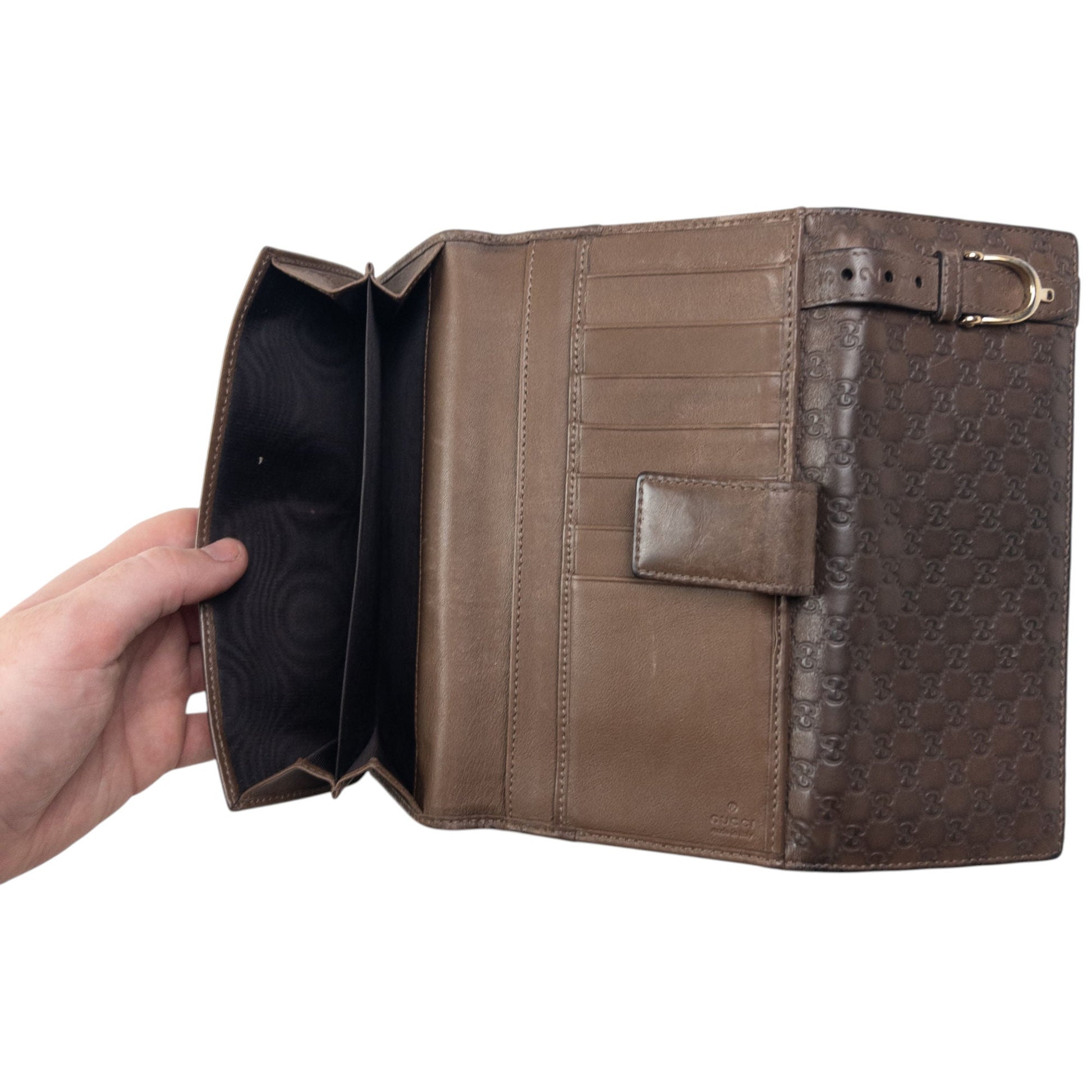 • Other info: Brown colour, embossed monogram logo pattern, buckle detail, minor general wear as seen