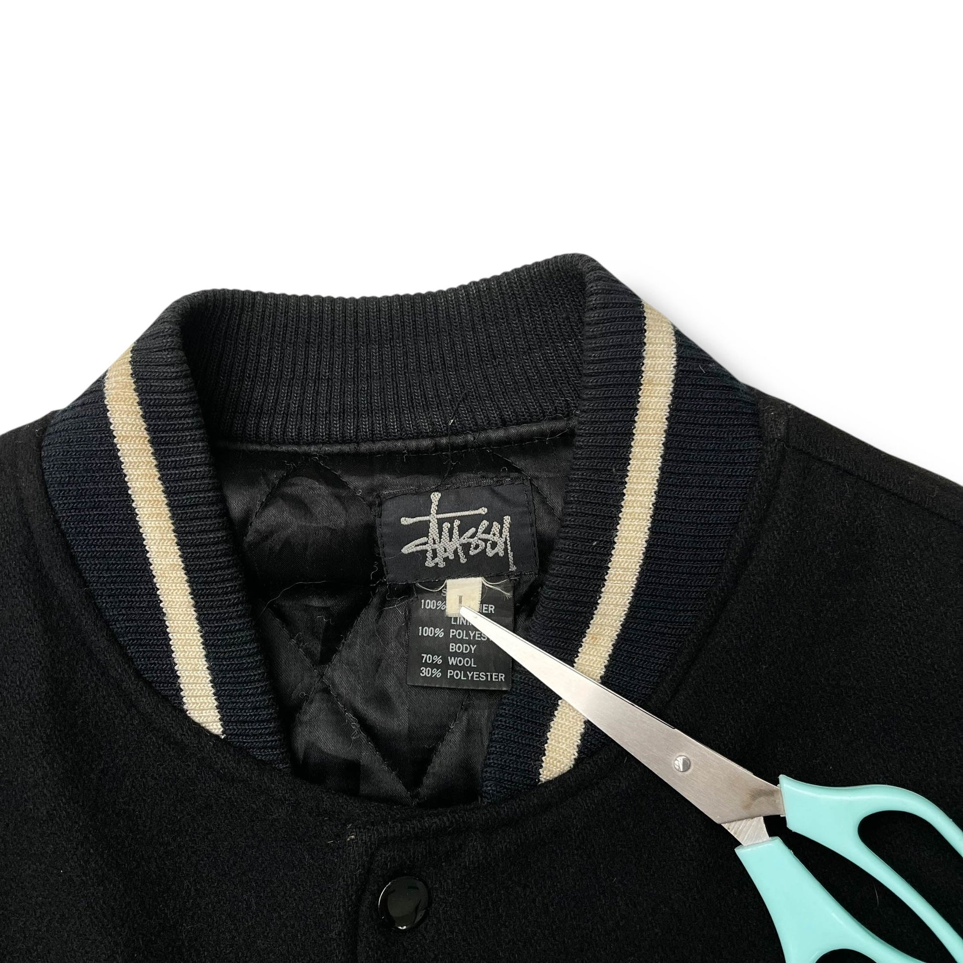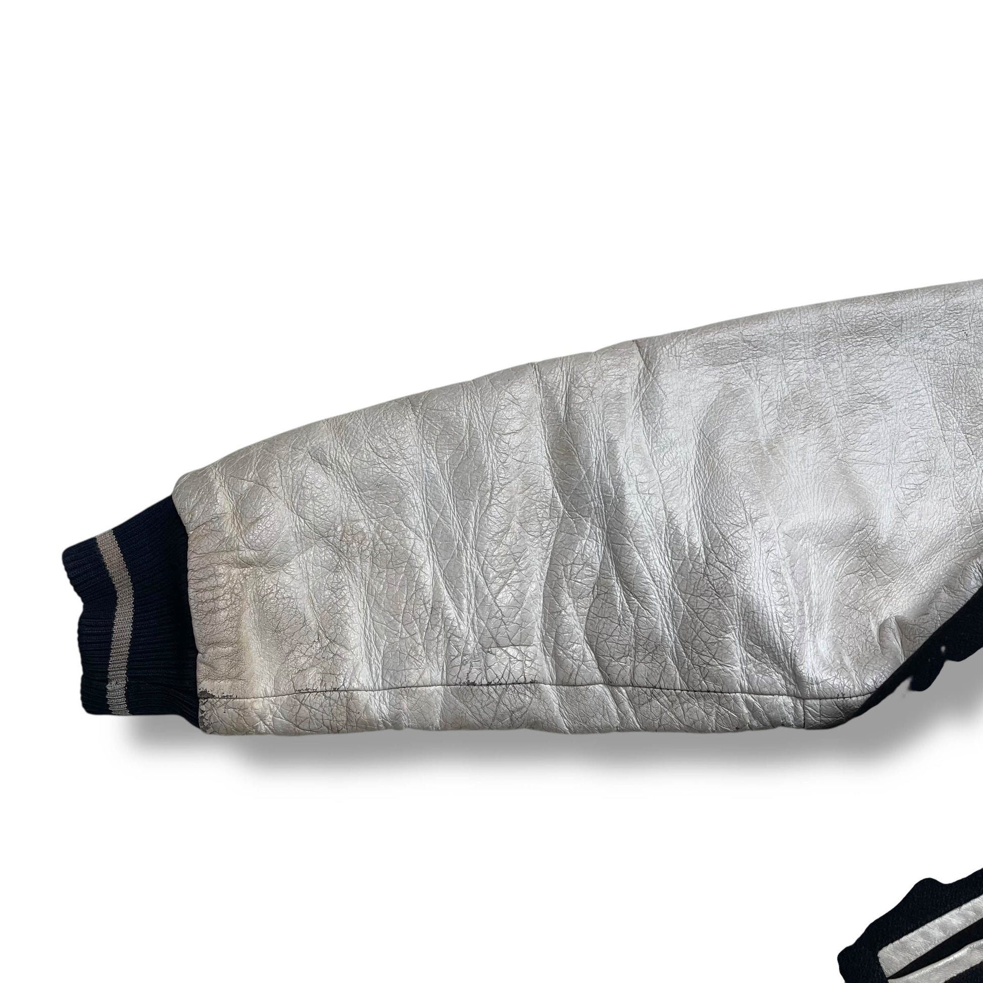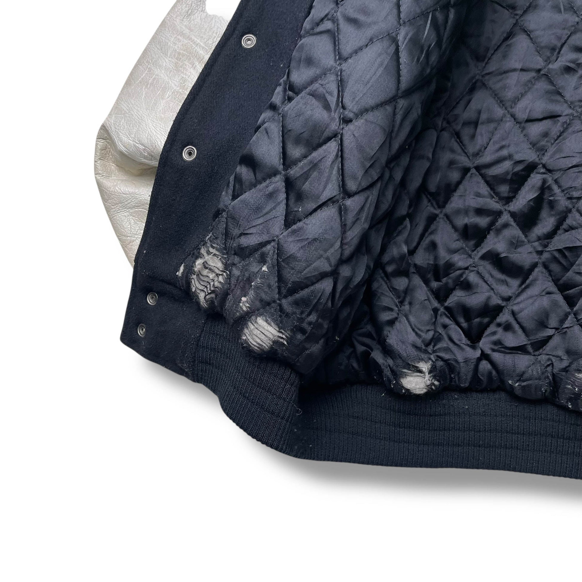 - Flaws - Leather arms have a fair amount of creasing and wear - Mark on the bottom hem and logo - Wear on the inside