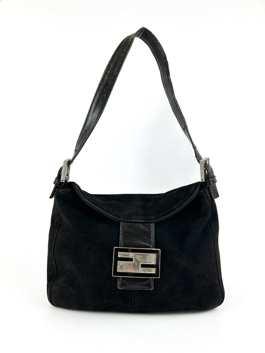 Vintage Fendi Black Suede Mamma Baguette Shoulder Bag