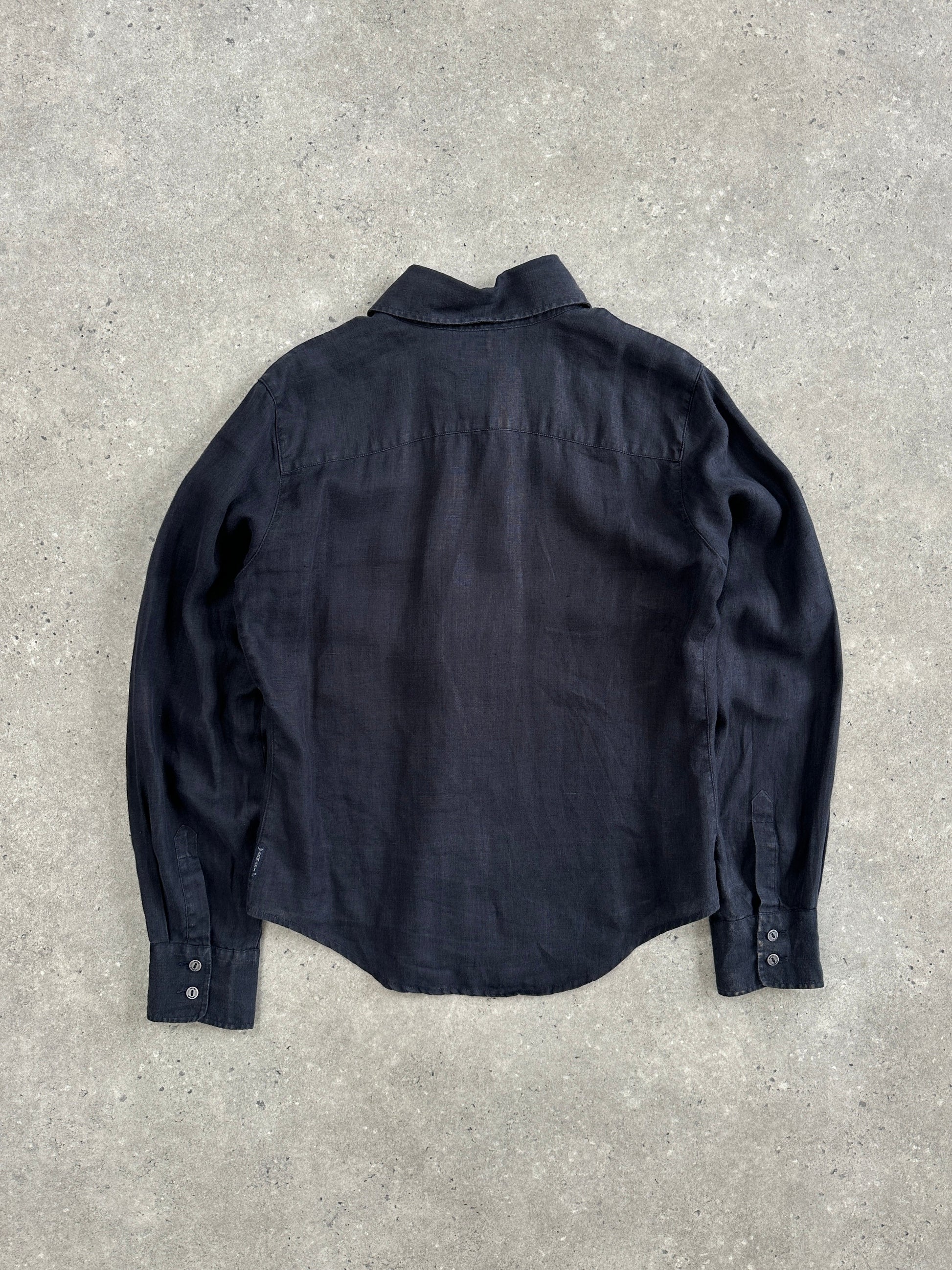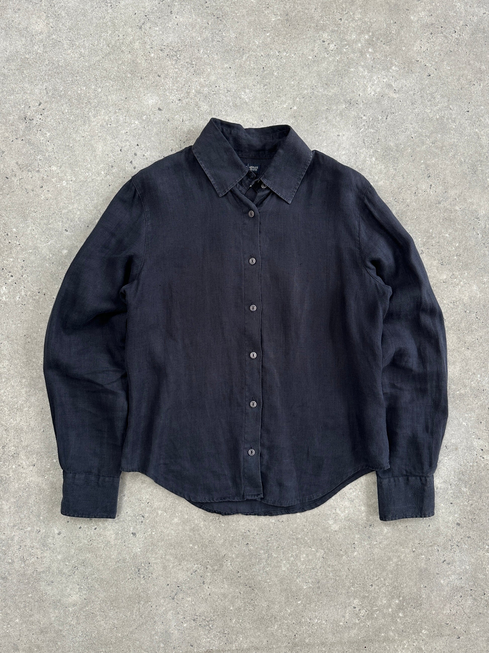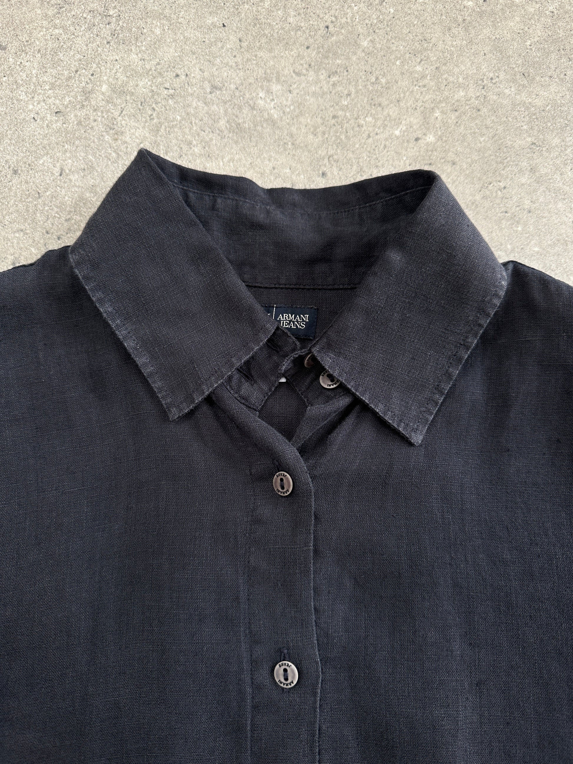 A breathable pure linen shirt in navy by Armani Jeans, crafted in Italy with a relaxed silhouette — effortless refinement for transitional dressing.