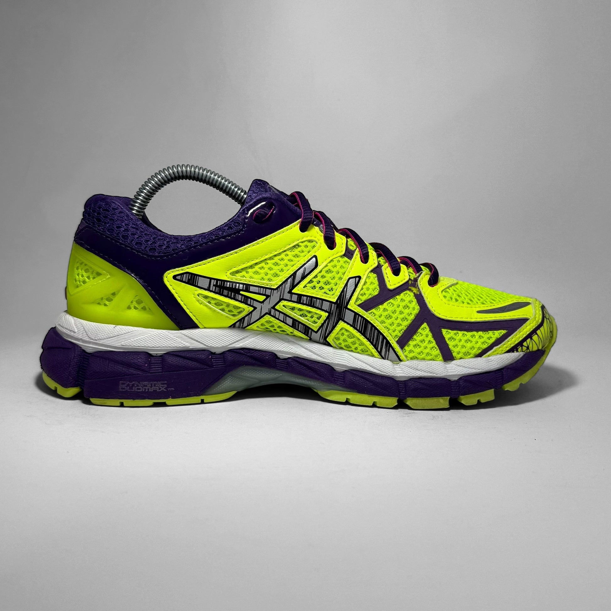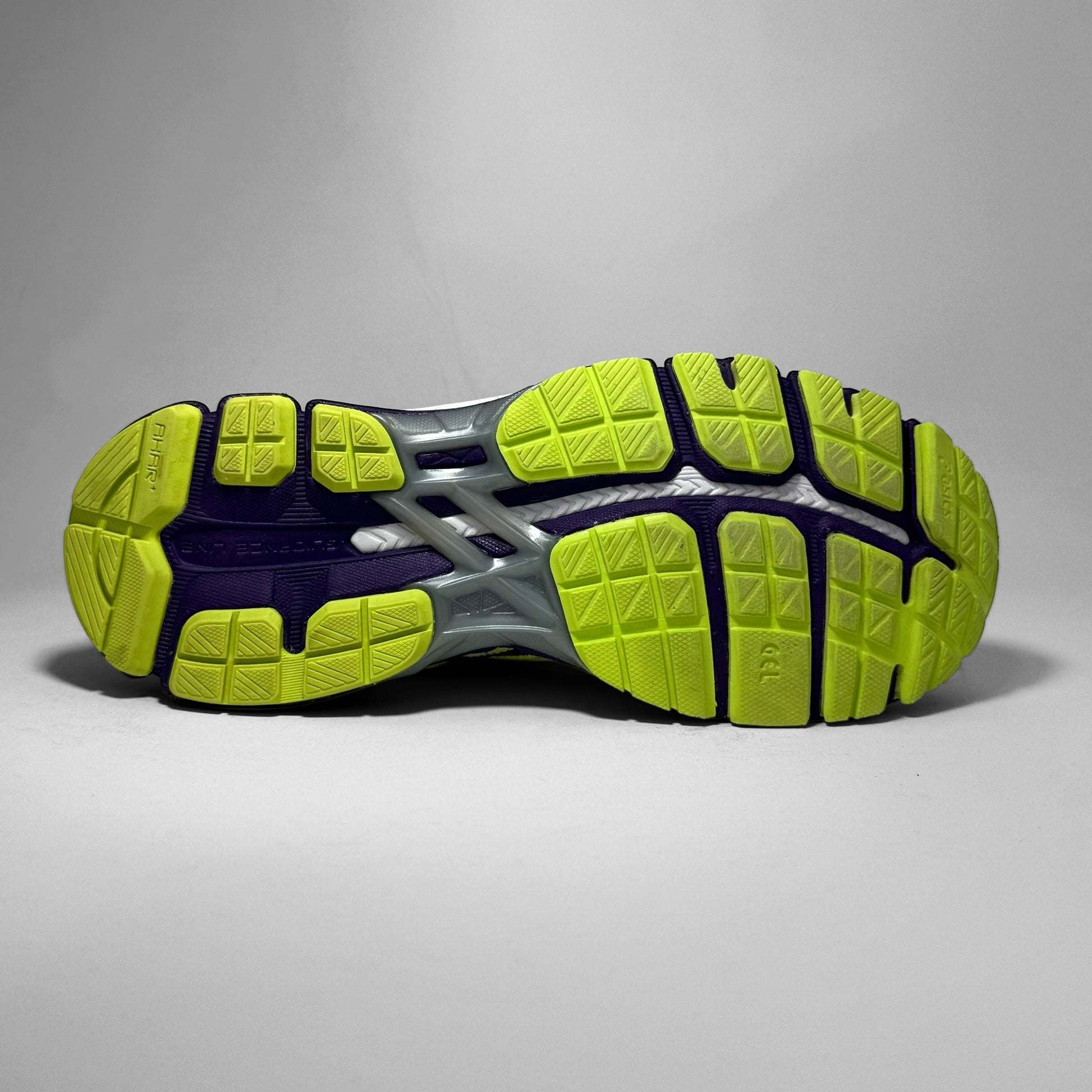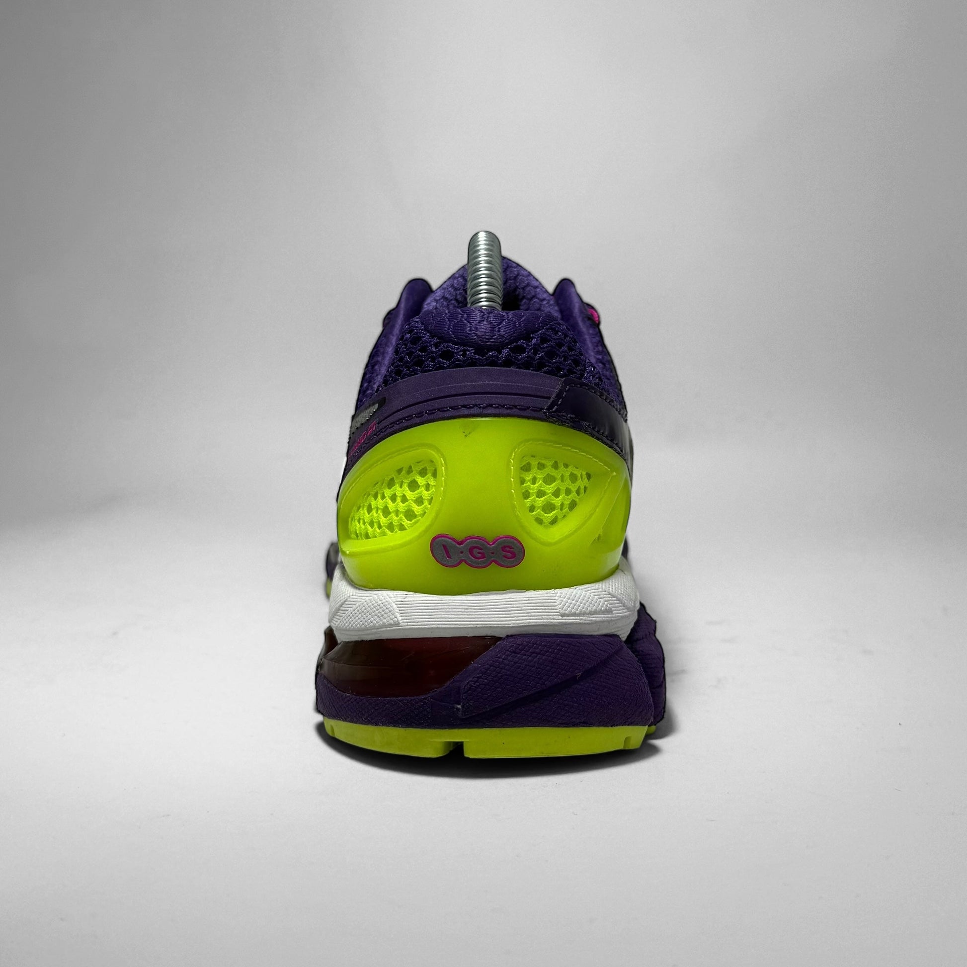 Contrast neon and purple popping colours in combinations of mesh, suede panels, detailed logo and gel-units. Bright purple detailing such as script branding and outlined laces.