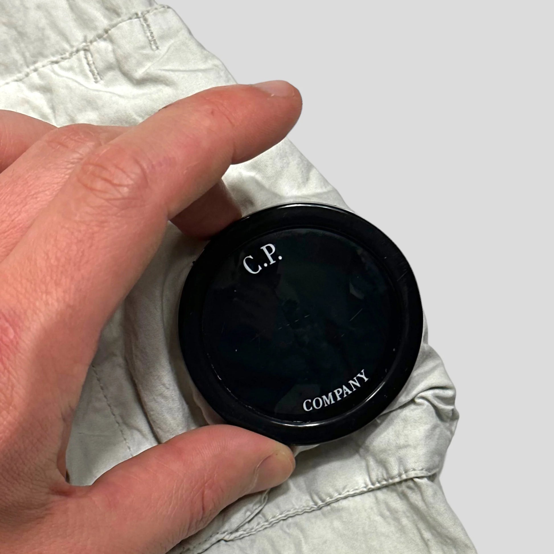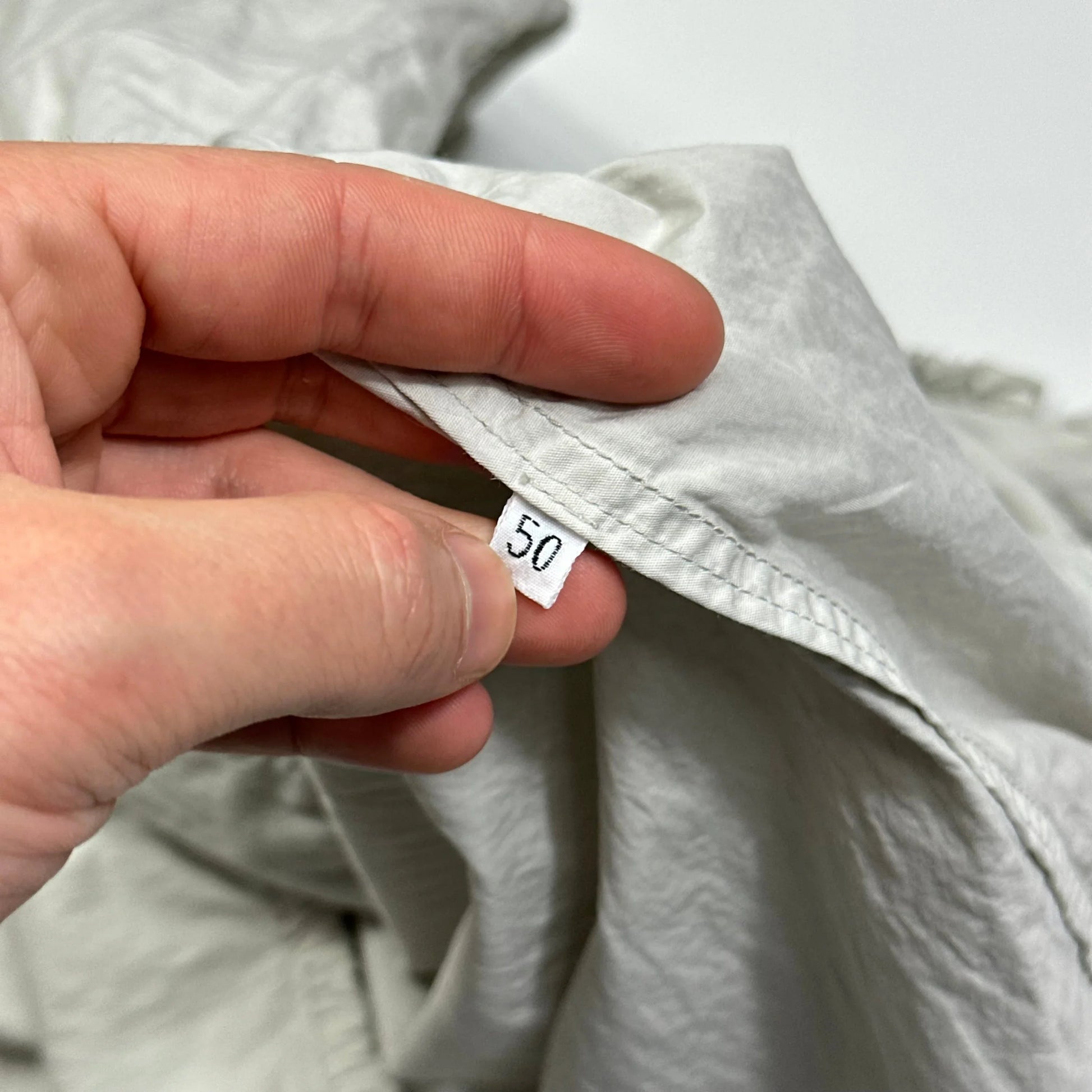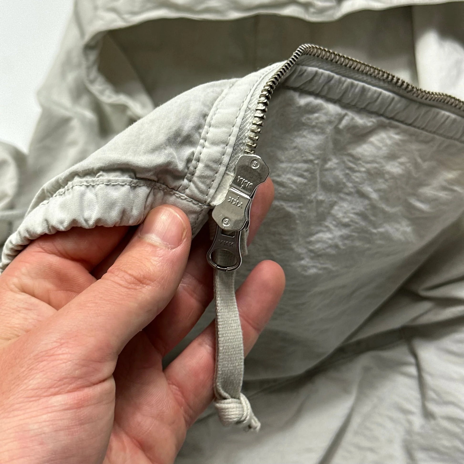 Beautiful Stone White / Light Grey CP Company Lightweight Jacket, constructed from a cotton and nylon shimmer blend which catches the light beautifully, exposed metal double zipper on the front with tonal CP Company zip pull, high neck for wind coverage, oversized C.P. Onocular goggle lens / watchviewer to the left arm pocket, dual zip pockets above the waist.