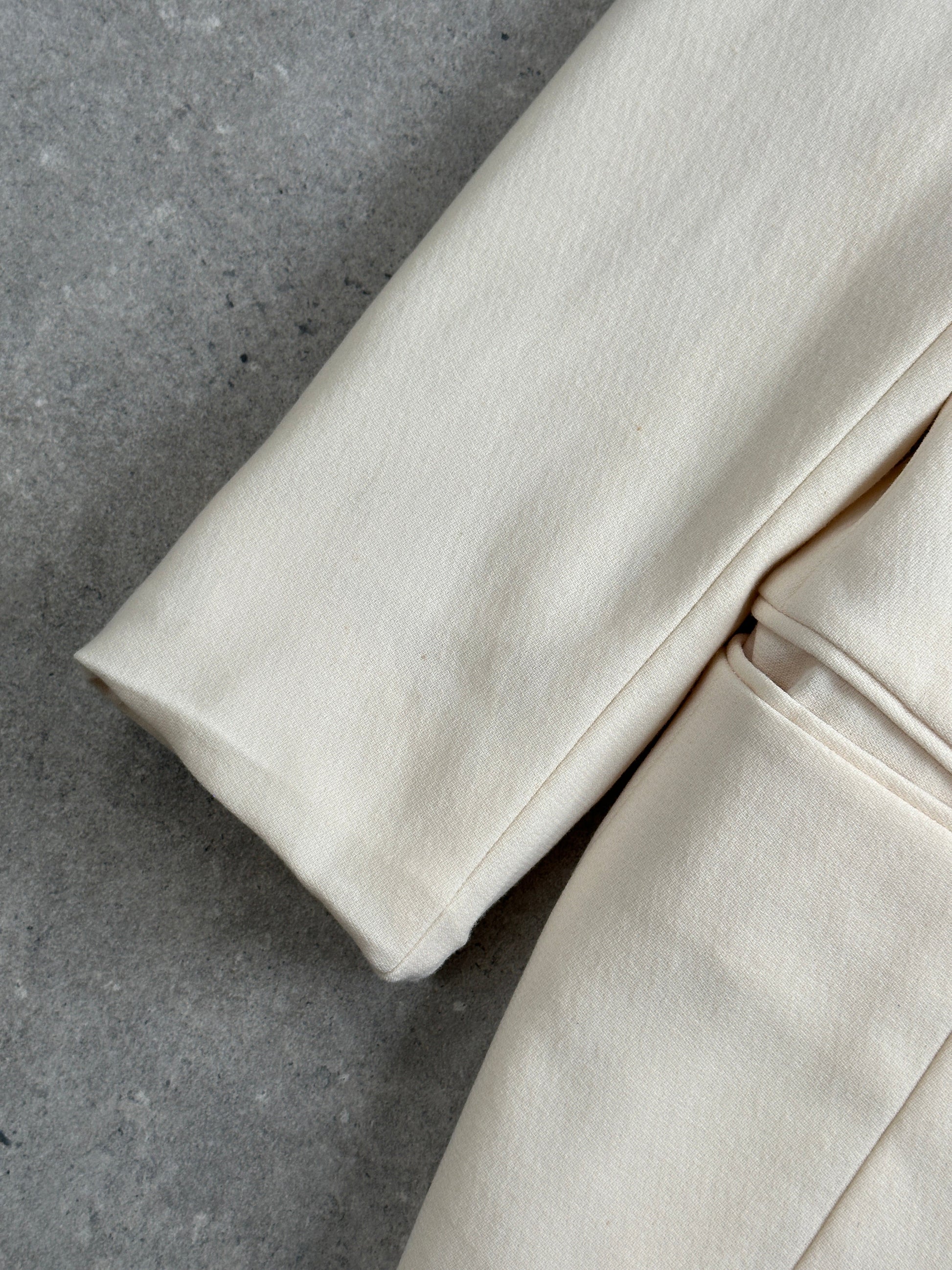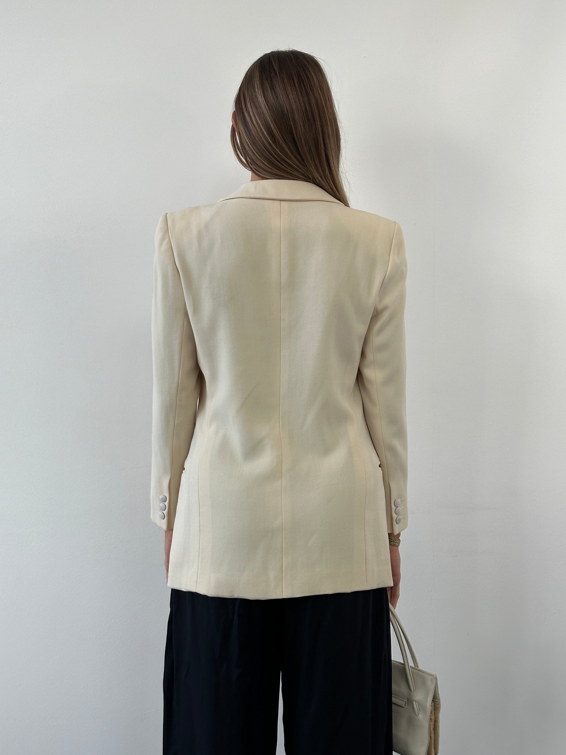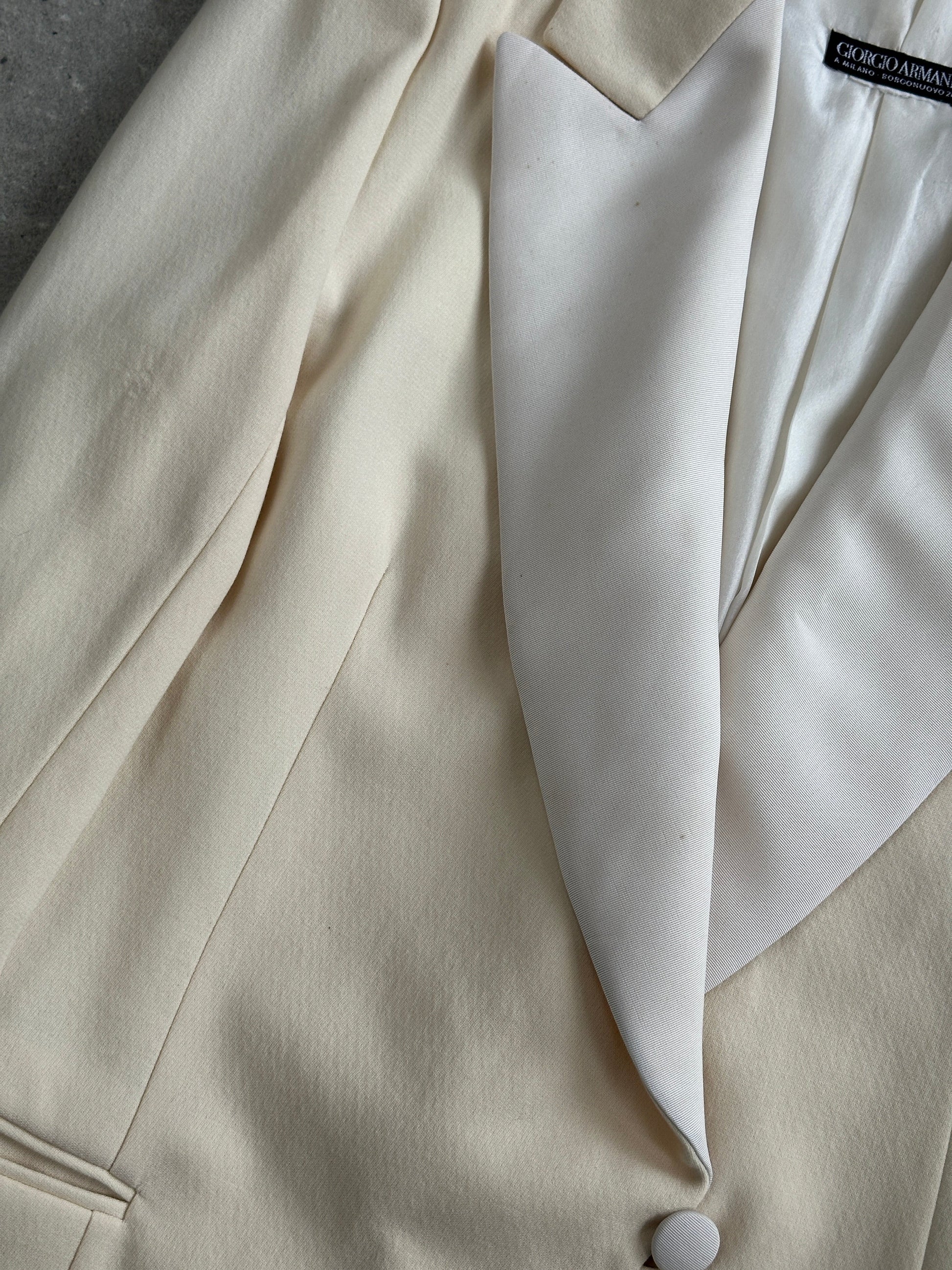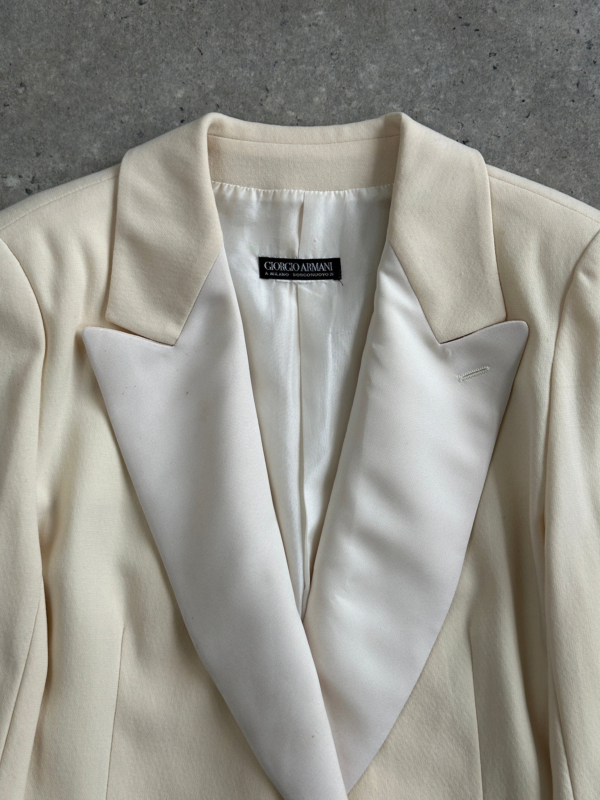 Elegant 1980s Giorgio Armani tailored blazer in a soft cream tone, featuring a dramatic satin shawl lapel and single-button fastening. A refined example of Armani’s minimalist evening tailoring, made in Italy under the Borgonuovo 21 atelier label.