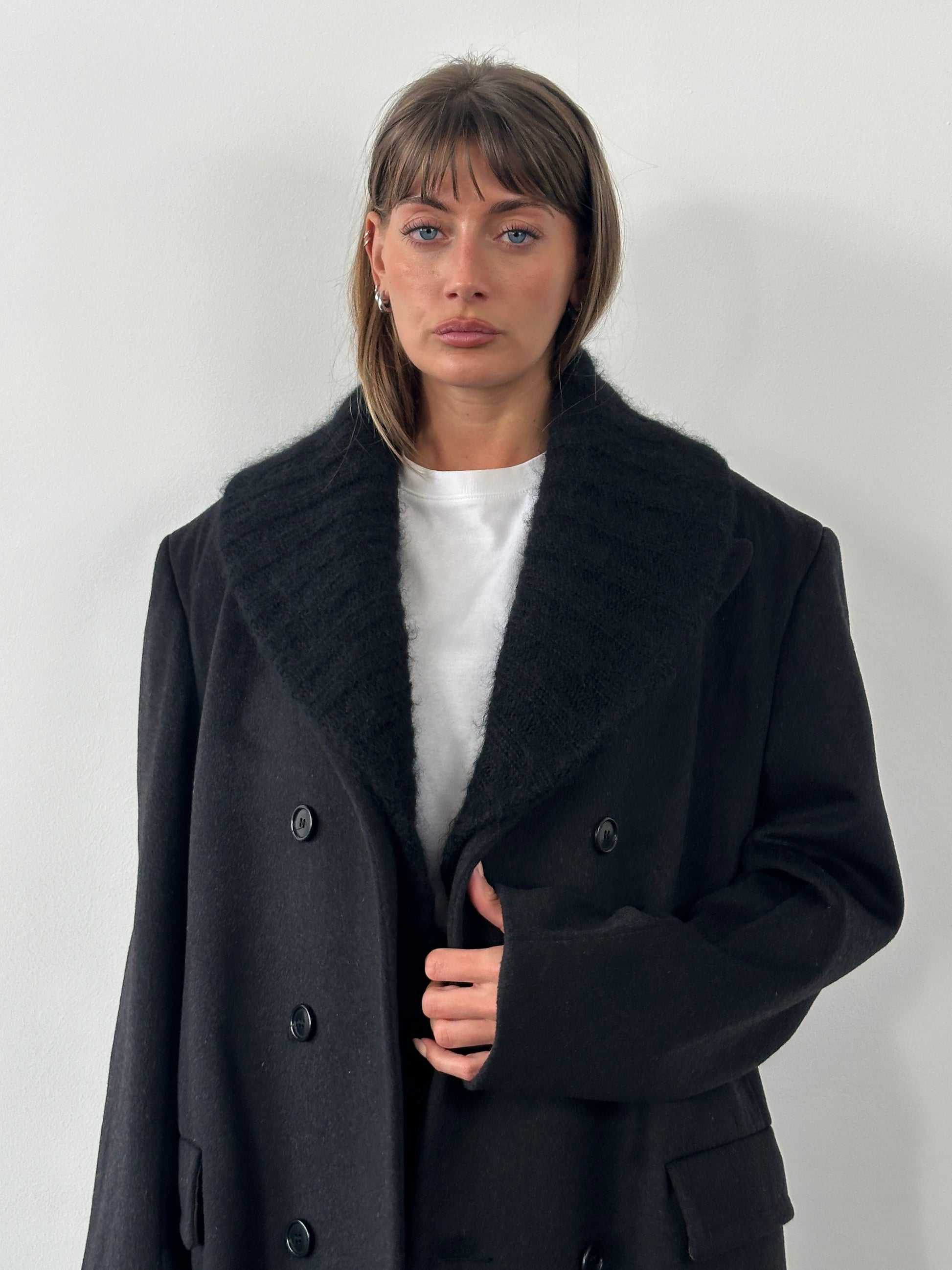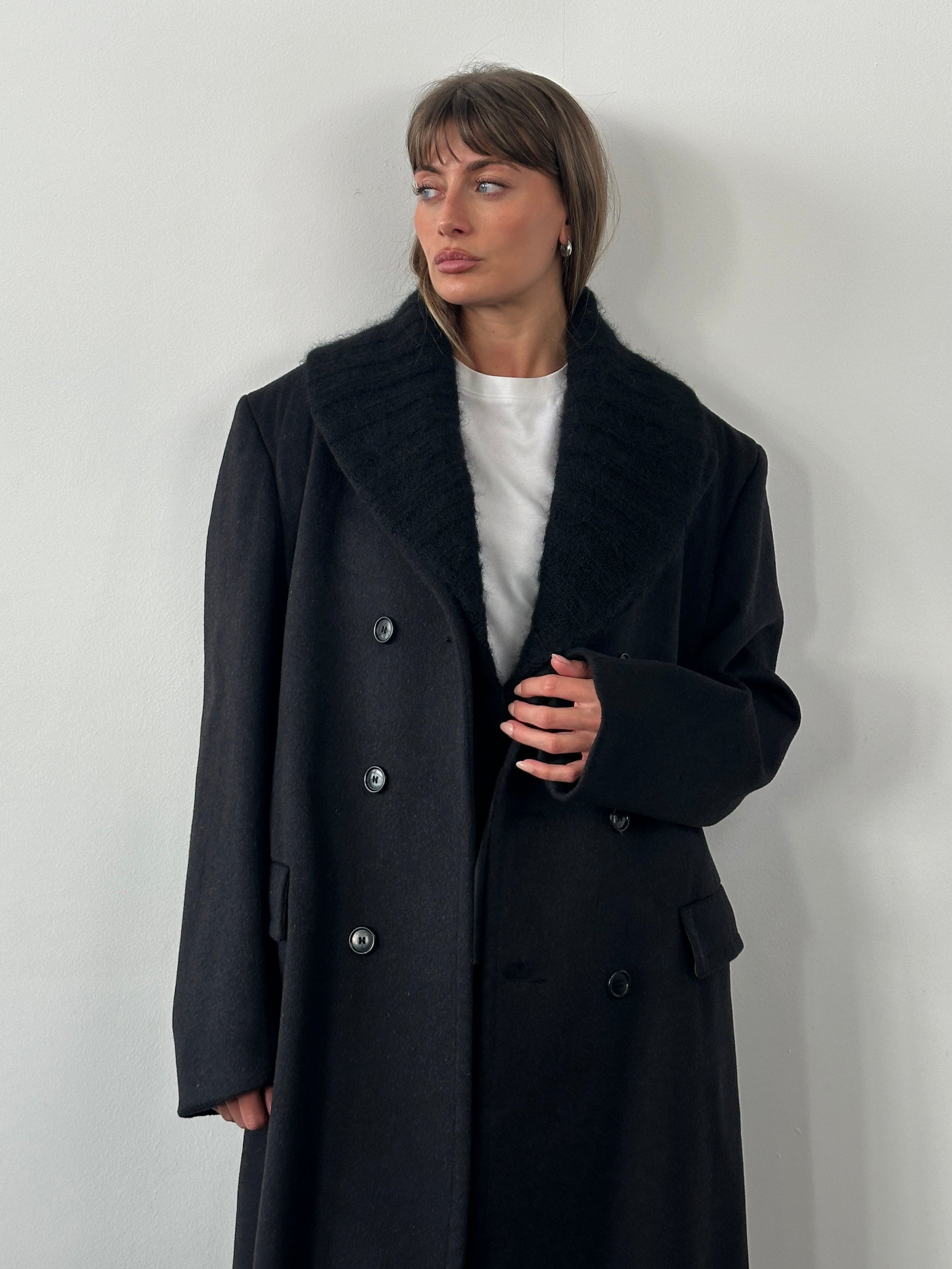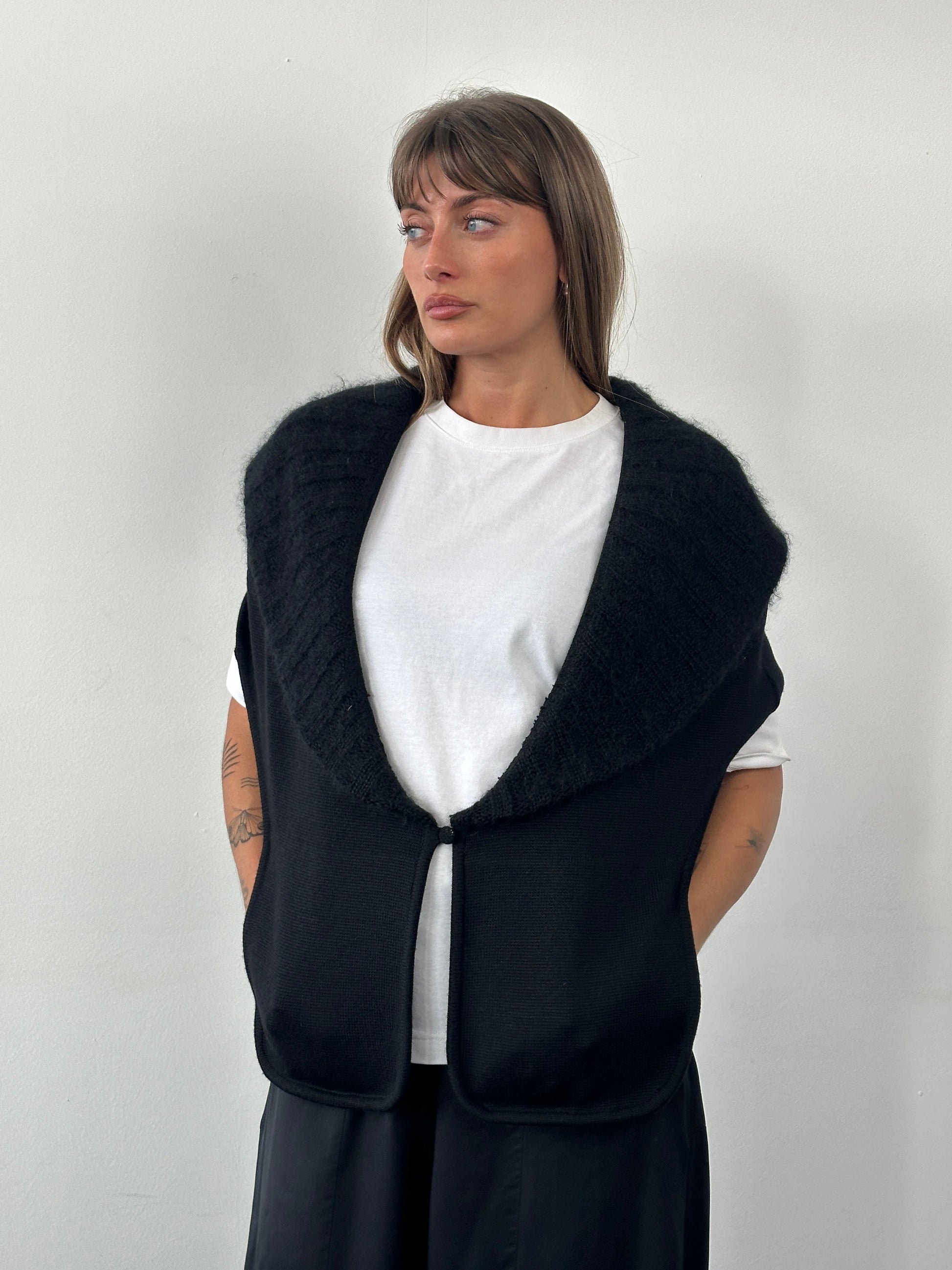 A black 1990s vintage knitted shawl scarf by Navona, designed with an open front, integrated hand pockets, and a soft ribbed collar detail. Crafted from pure extrafine merino wool with a smooth, lightweight handle and an easy drape through the body.