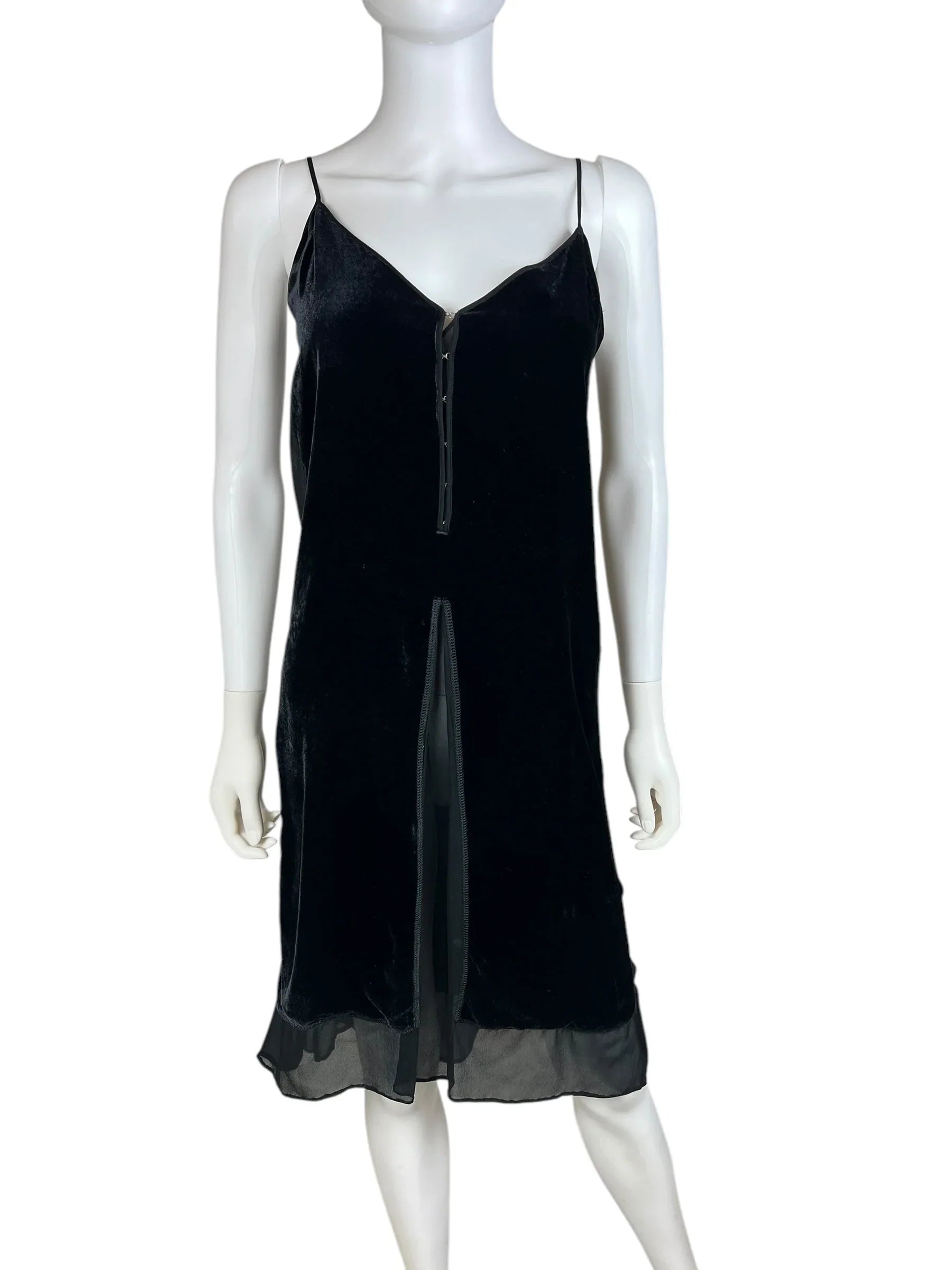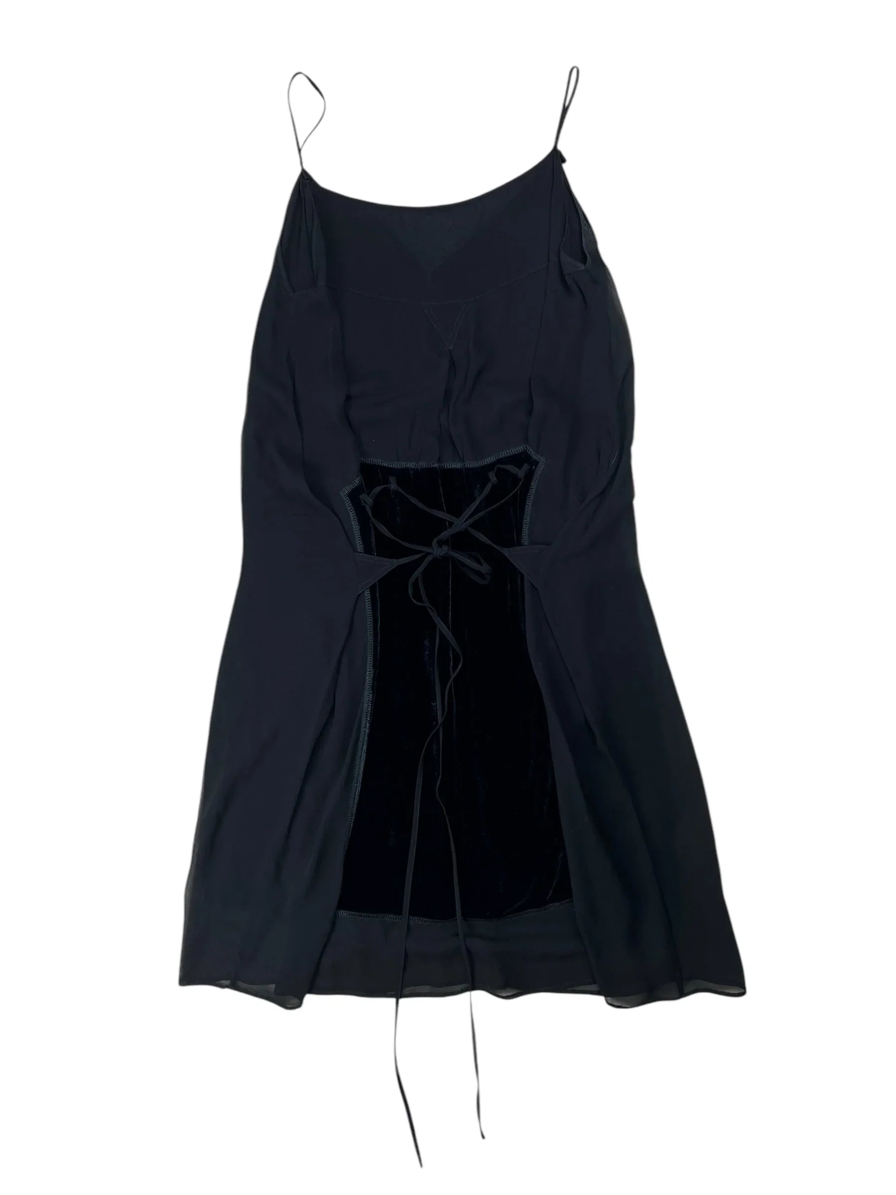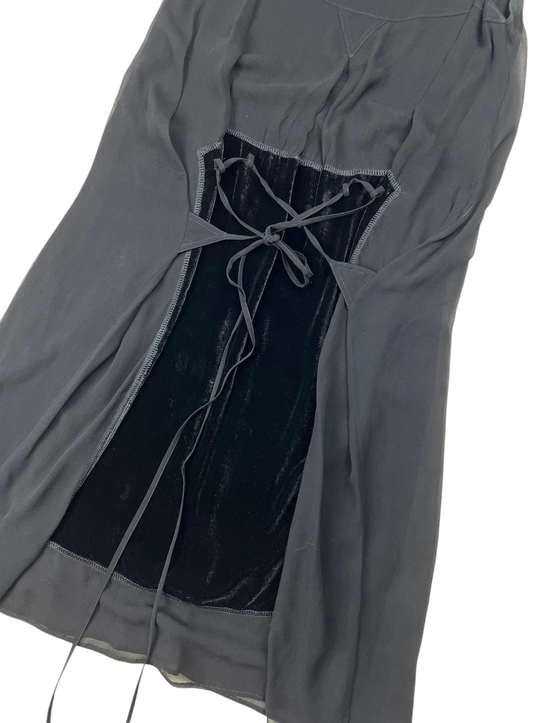 Mid 1990s Miu Miu black velvet sheer side panel dress with corset back detail and hook eye front. Size S (UK8/10). All details below:
