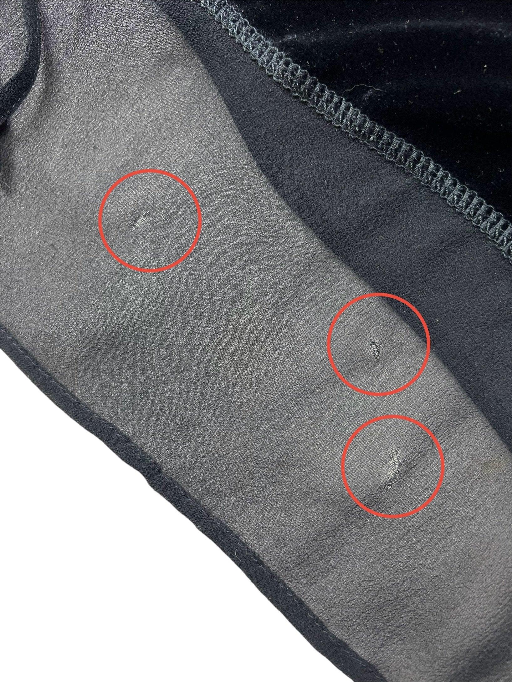 🐥 Condition is good overall with some small imperfections. Some white spots to front bottom central area - possible cleaning products that haven’t washed out and may come out after dry cleaning. They’re faint and not too noticeable. Three small holes along bottom hemline at the back of the dress - again very small and not too noticeable as dress wraps over at the back to hide these. A small pull on one strap as shown. Care label cut out some material unknown. Dry clean only.