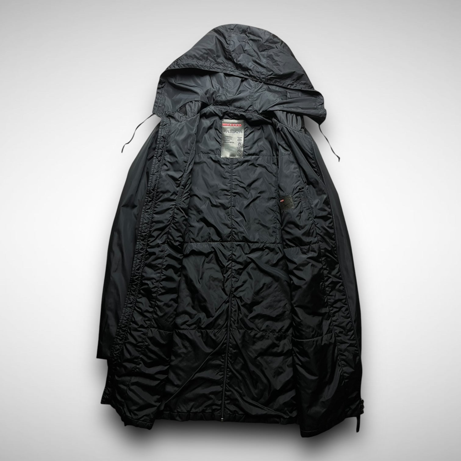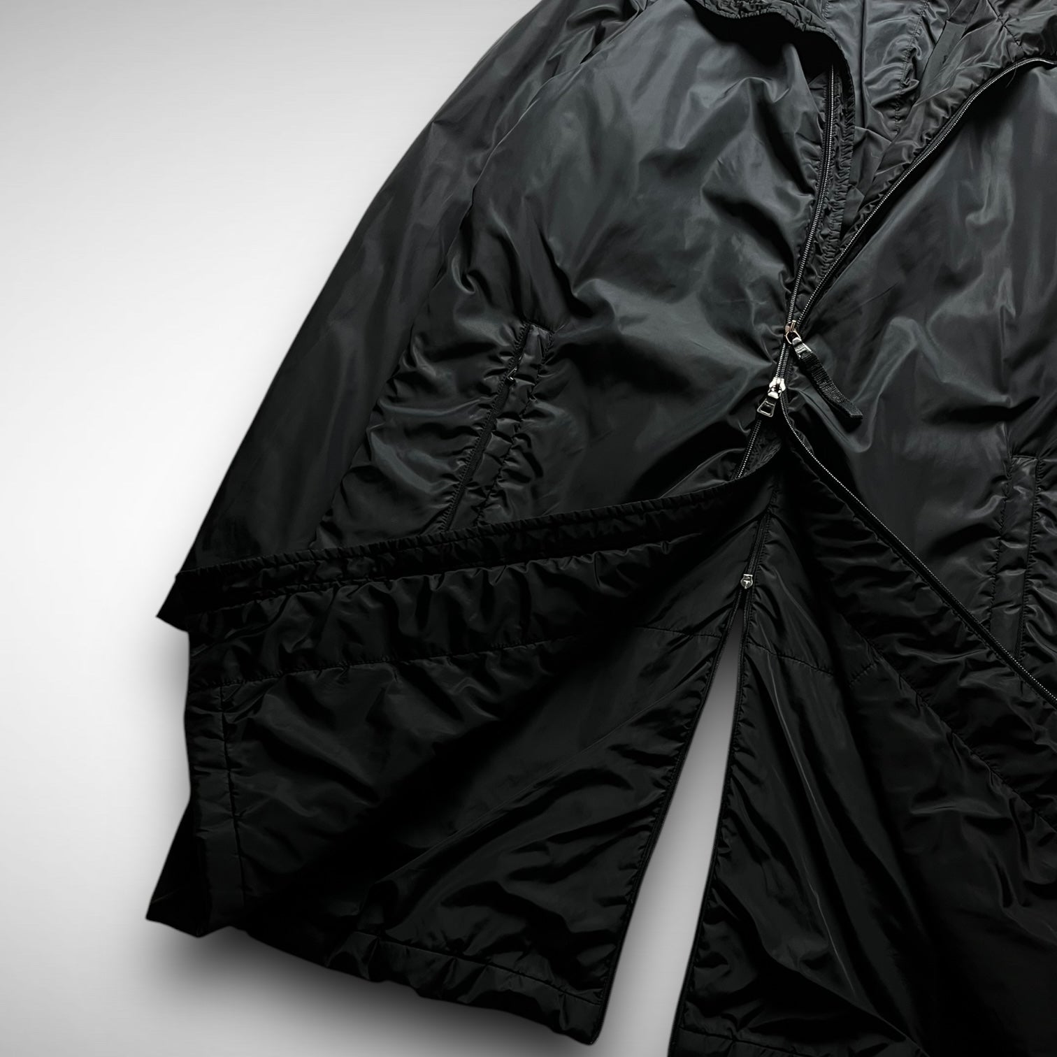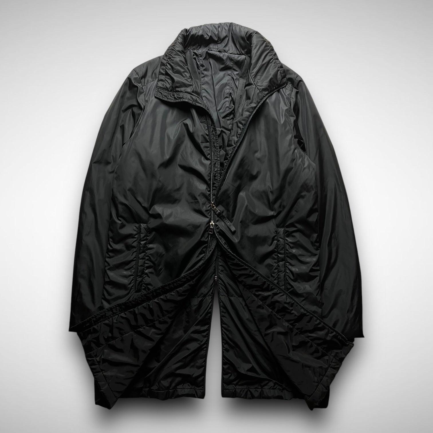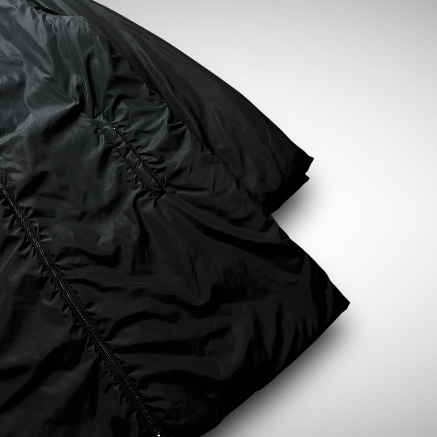 Constructed from the brand’s signature technical nylon with a subtle sheen and lightweight insulation. Features a two-way zip closure, elastic-cord adjustable collar, foldable and rope-adjustable hood, and ruched detailing along the seams for a refined utilitarian look including a zip at the tail for adjusted fit, style and comfort during biking.