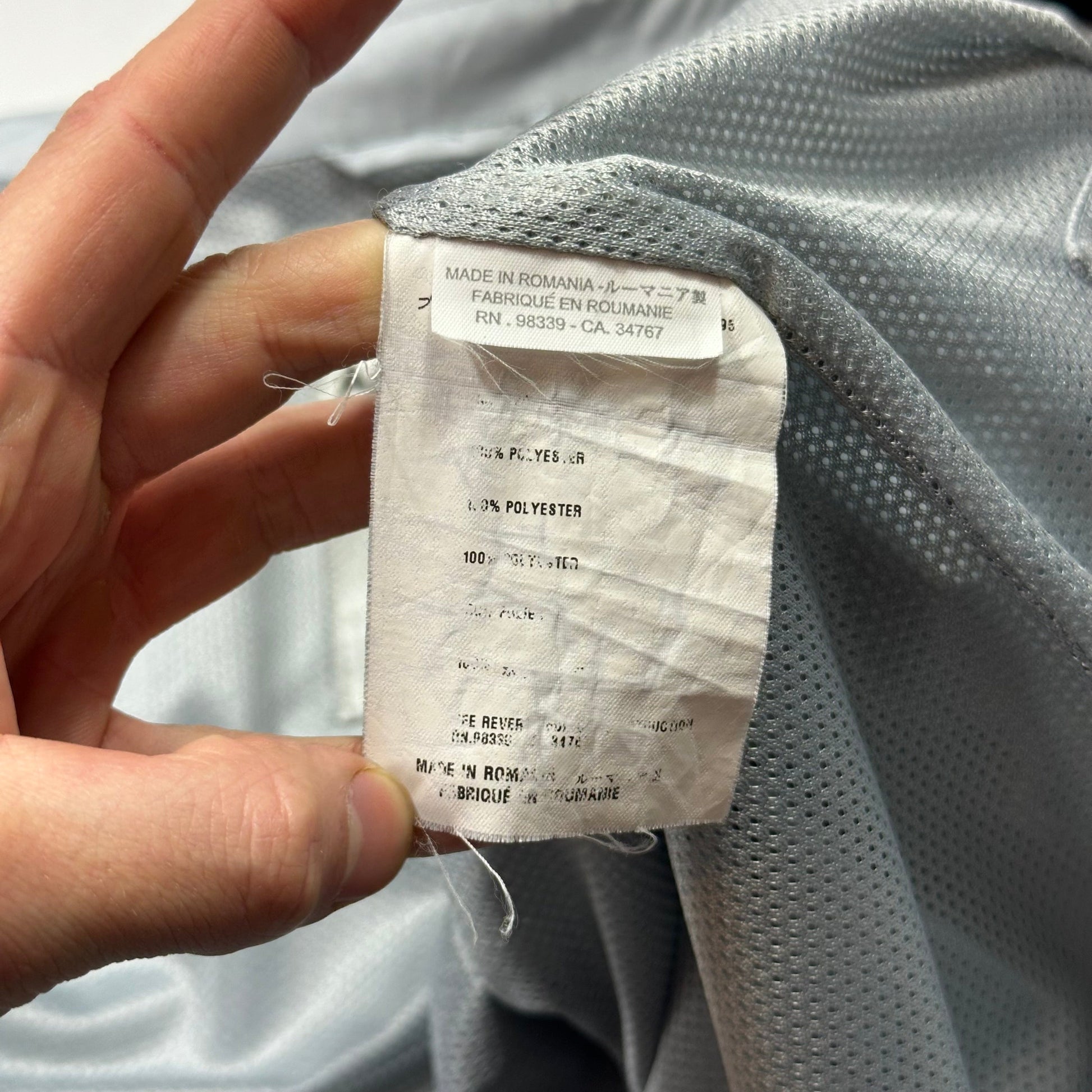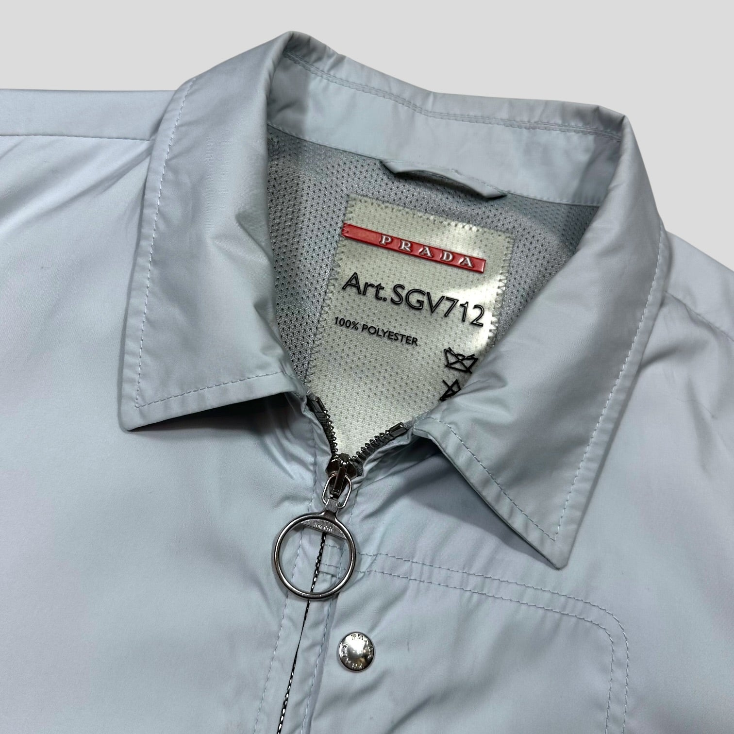 Very rare early 2000’s Prada Sport soft polyester nylon Harrington work jacket, unique metal branded button zip stash pocket to chest, Circular metal branded zip pull, inside is mesh lined for breathability with another slot stash pocket, ventilated back panel, lovely pale ice blue colourway.
