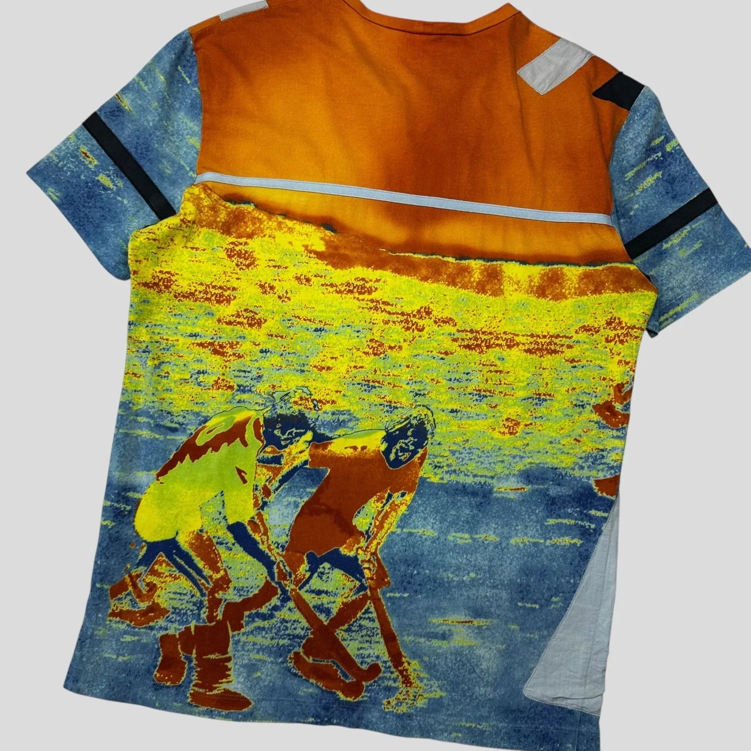 Extremely rare early 2000’s Prada Sport Thermal Heatmap print tee, thermal mapping of hockey players with overlayed patchwork appliqué curved panels and stripes.