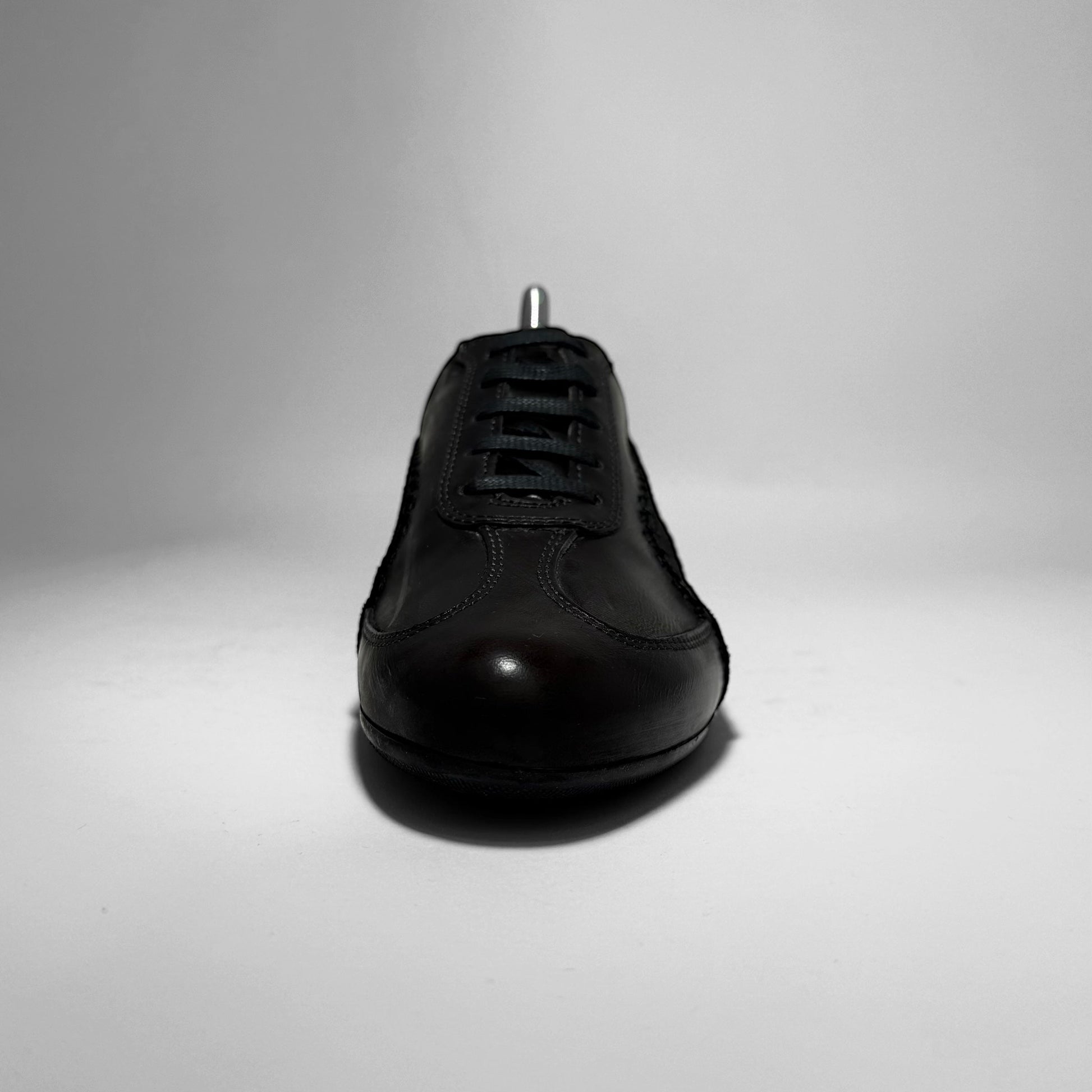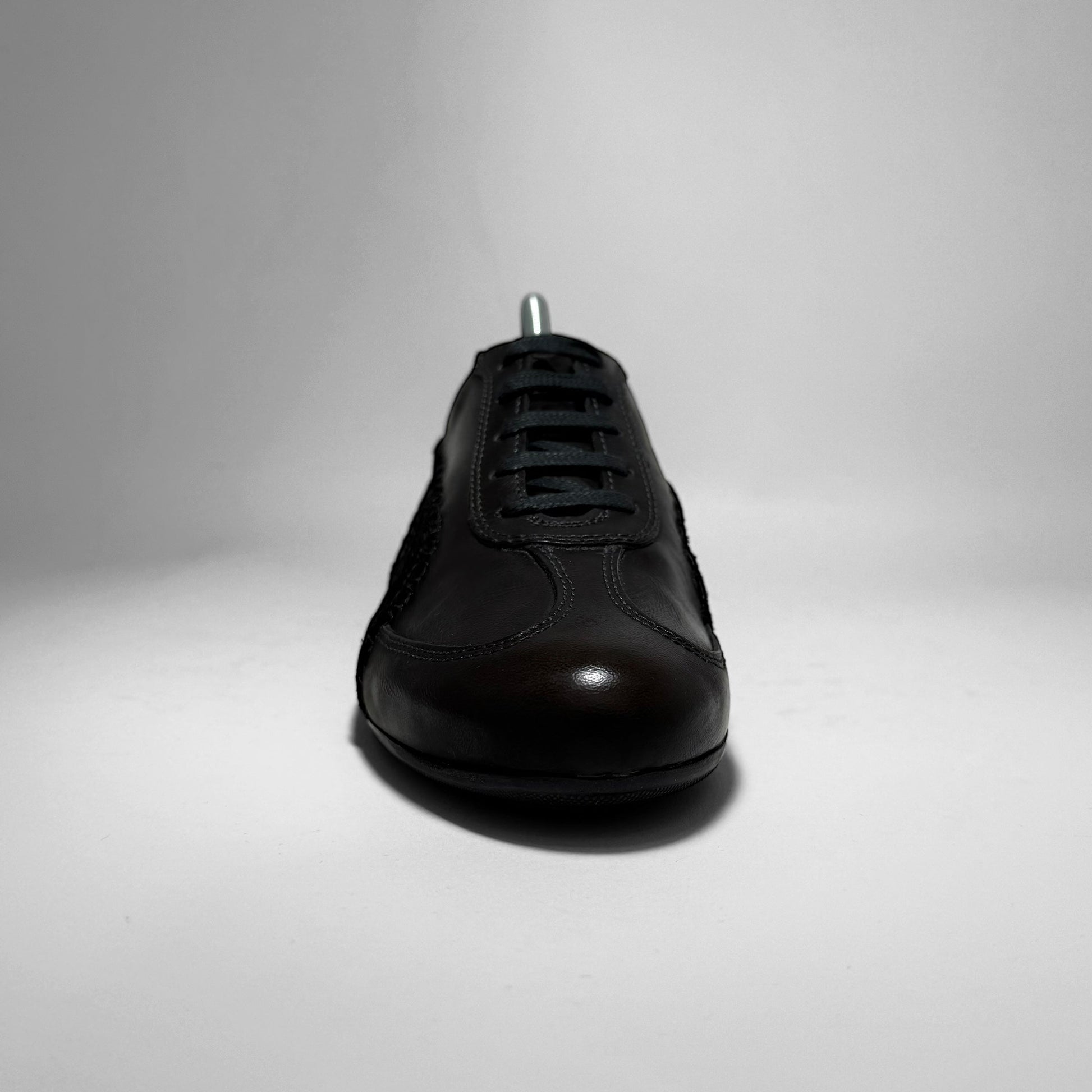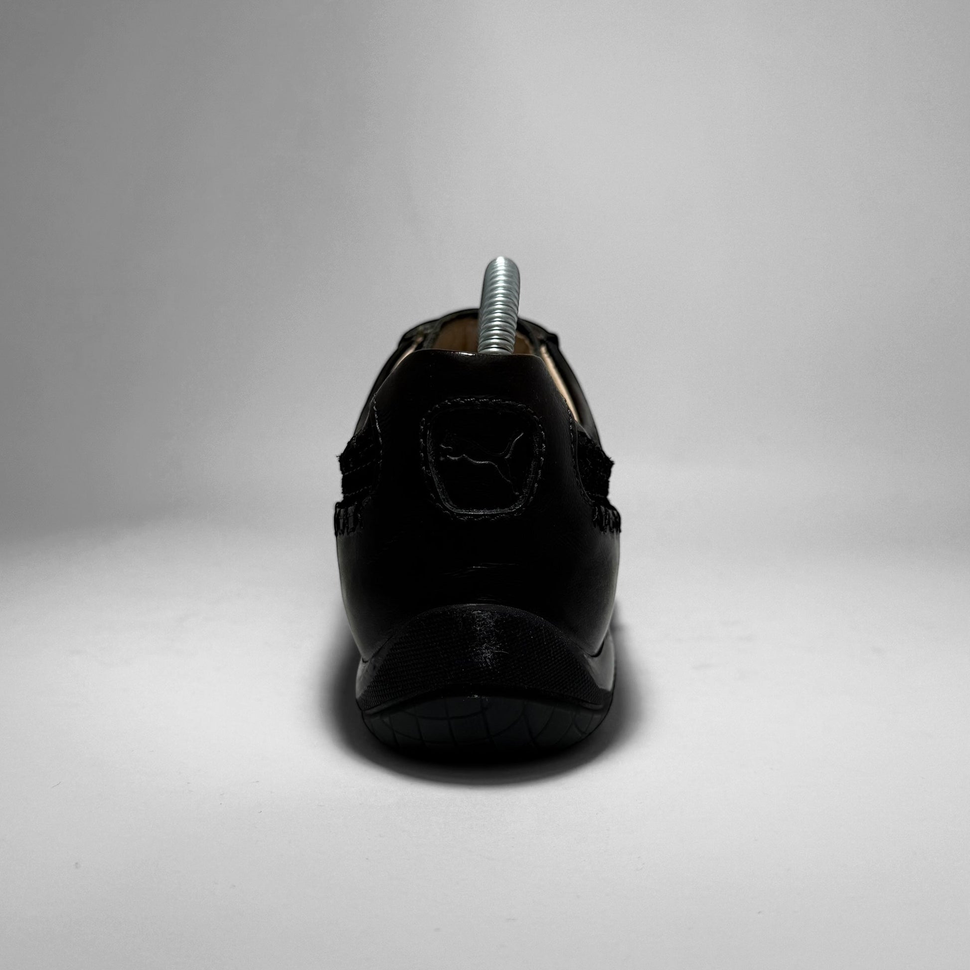 A premium reinterpretation of the Speedcat silhouette from Puma’s collaboration with Neil Barrett. Features a sleek all-black leather upper with tonal suede Formstrip and decorative whipstitching. Designed with a low profile, refined shape, and minimalist branding. Finished with a black outsole and contrasting white Puma logo underfoot. A luxury-driven design merging motorsport heritage with contemporary fashion.