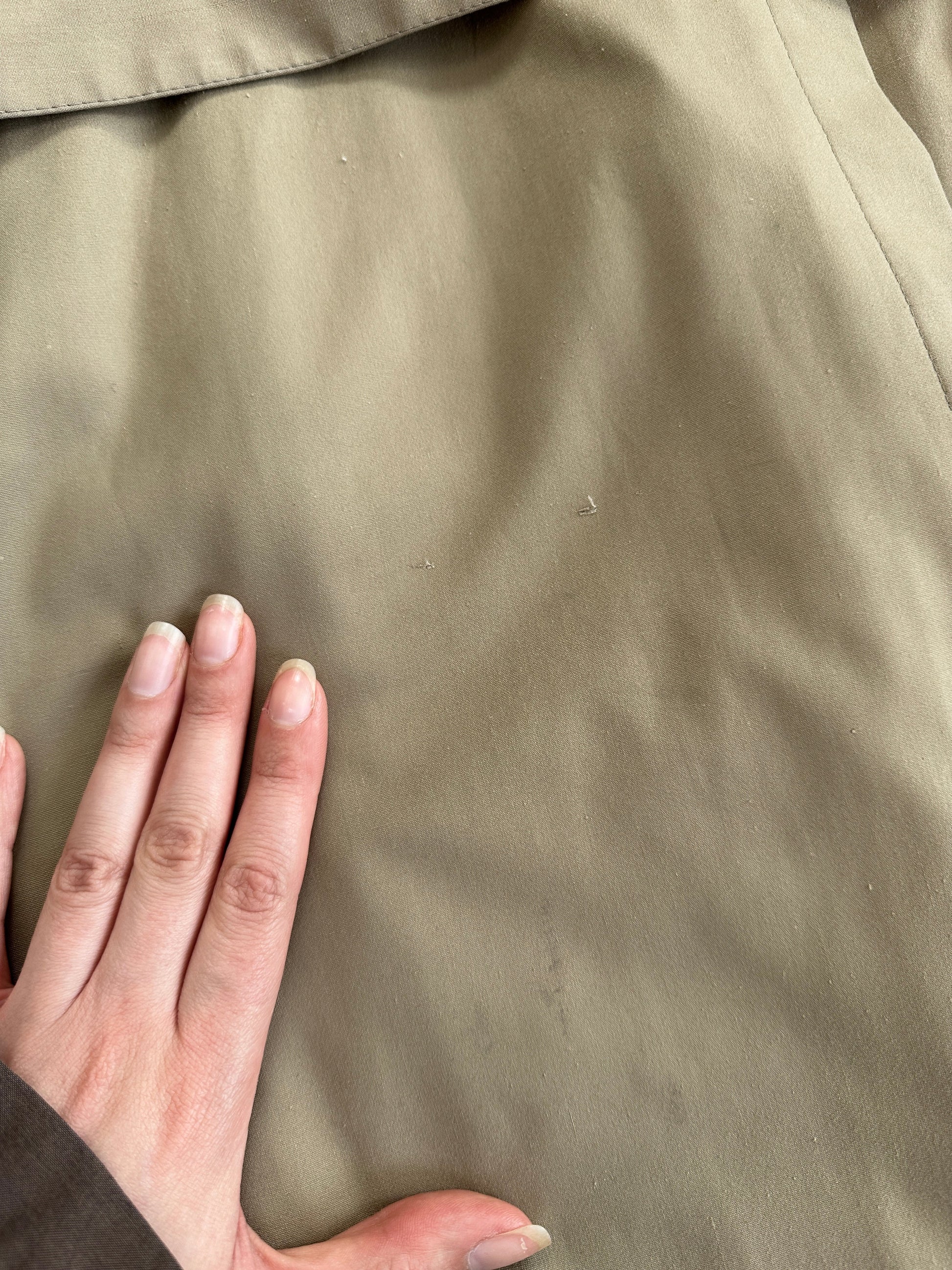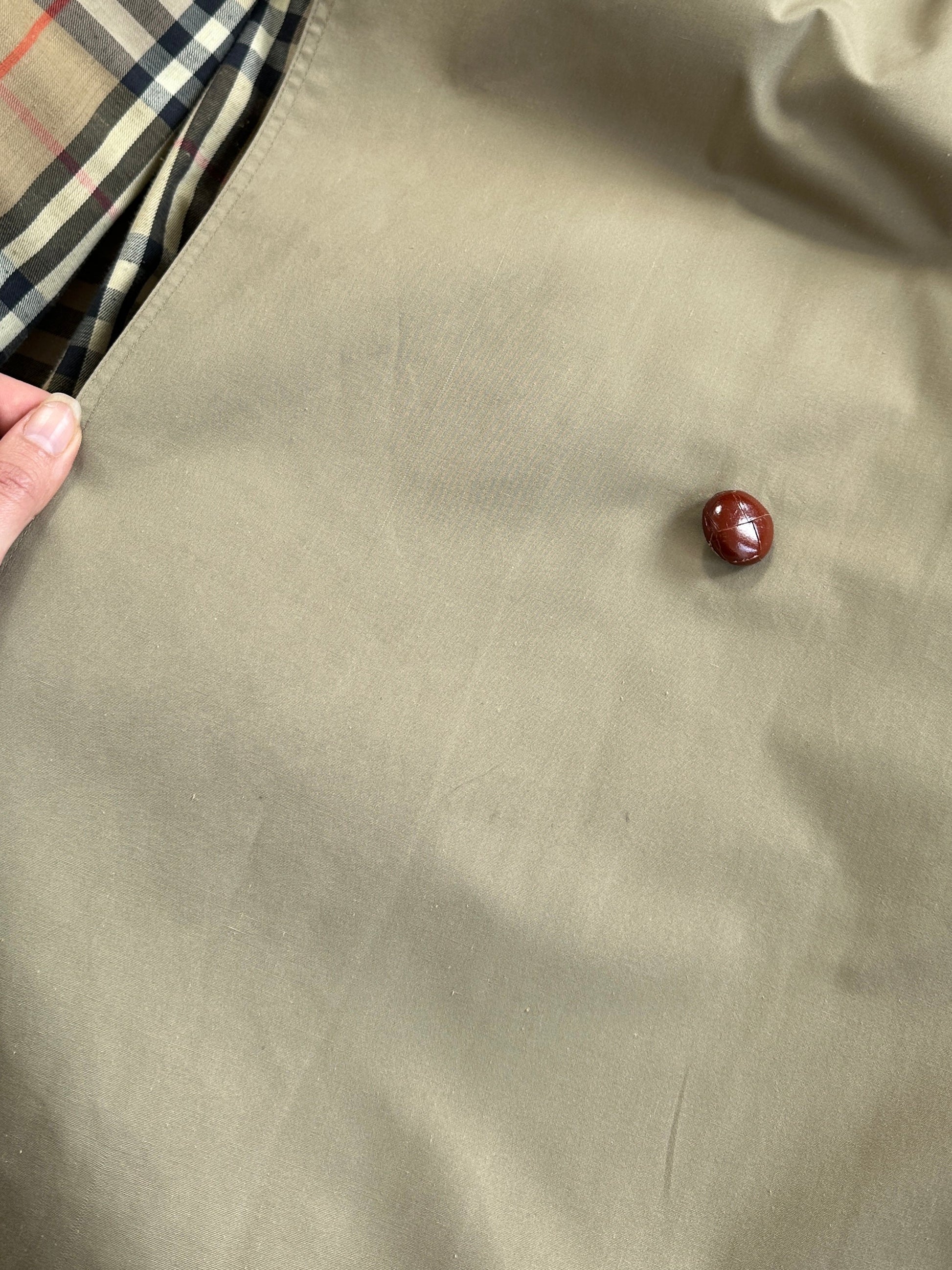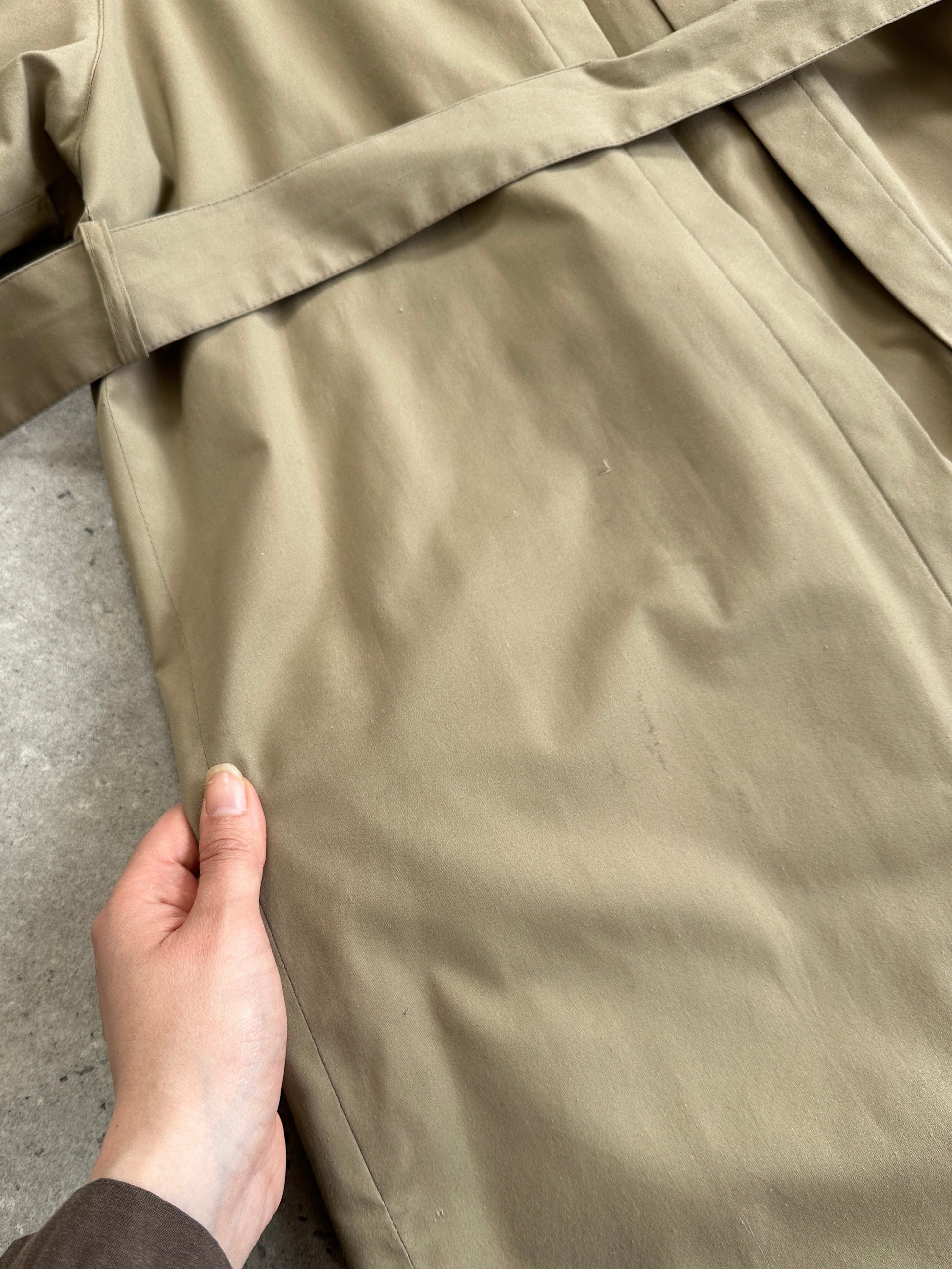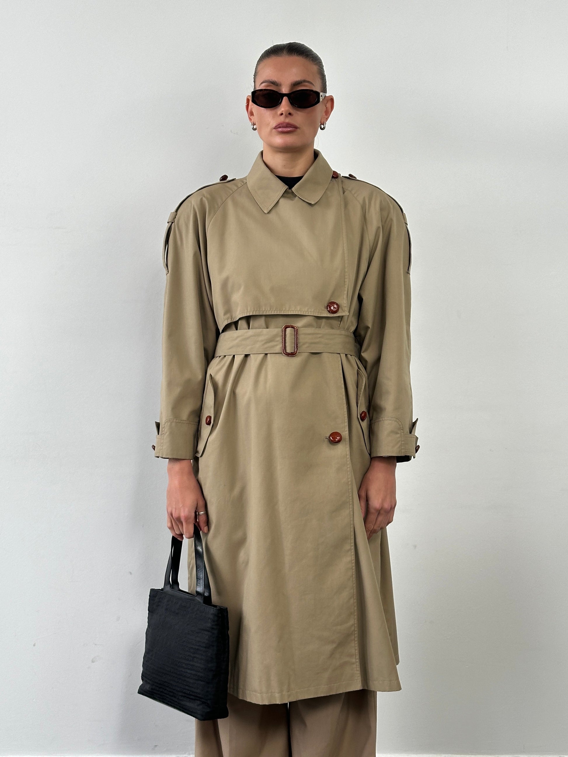 A vintage 1980s trench coat, finished with football buttons, belted waist, storm flap and a checked lining. A timeless British outerwear silhouette, versatile for layering across seasons.
