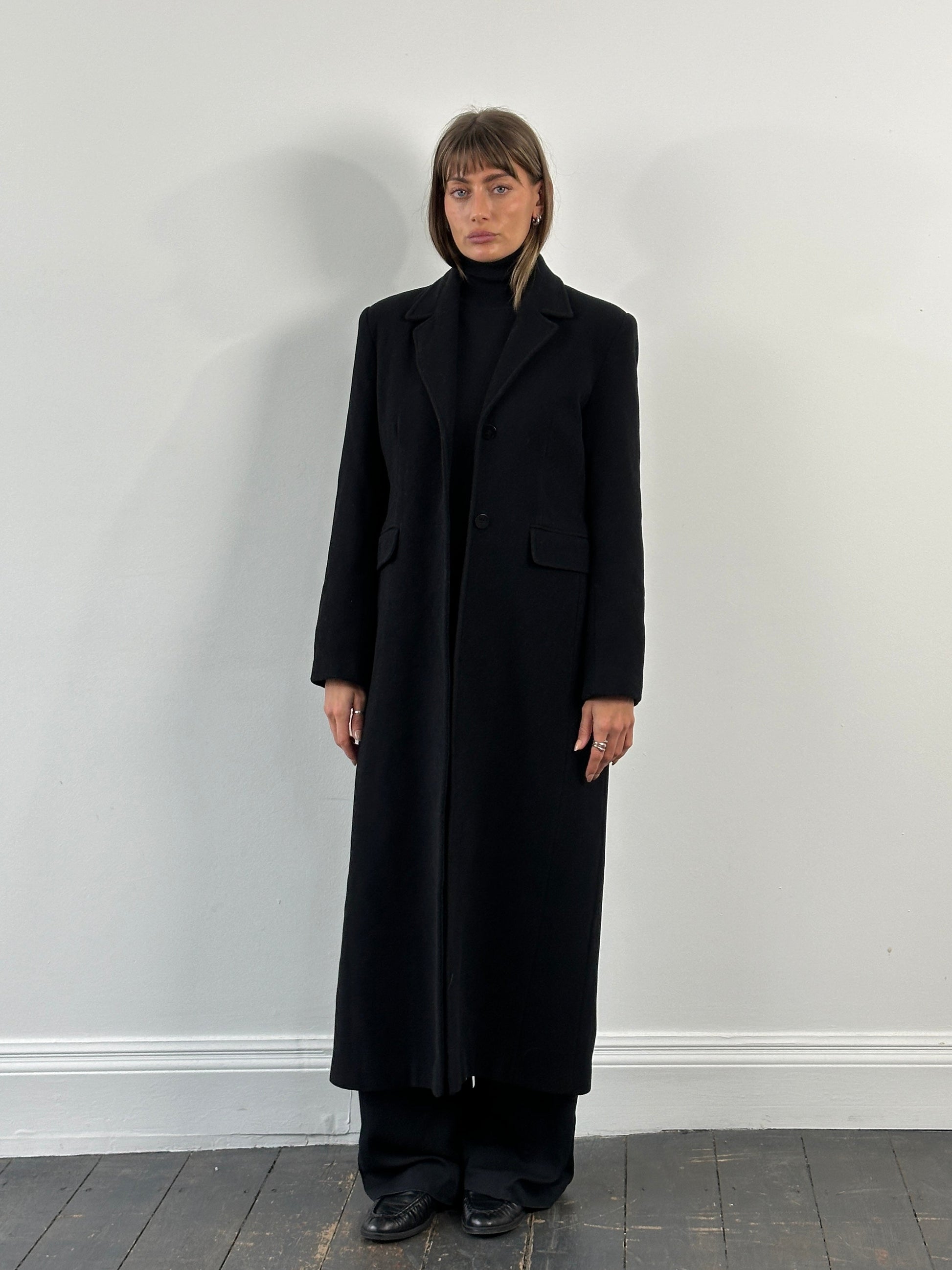 A vintage 1990s Smith Collection single breasted floor length coat in a deep black tone. A long clean silhouette with understated structure and quiet refined detailing.