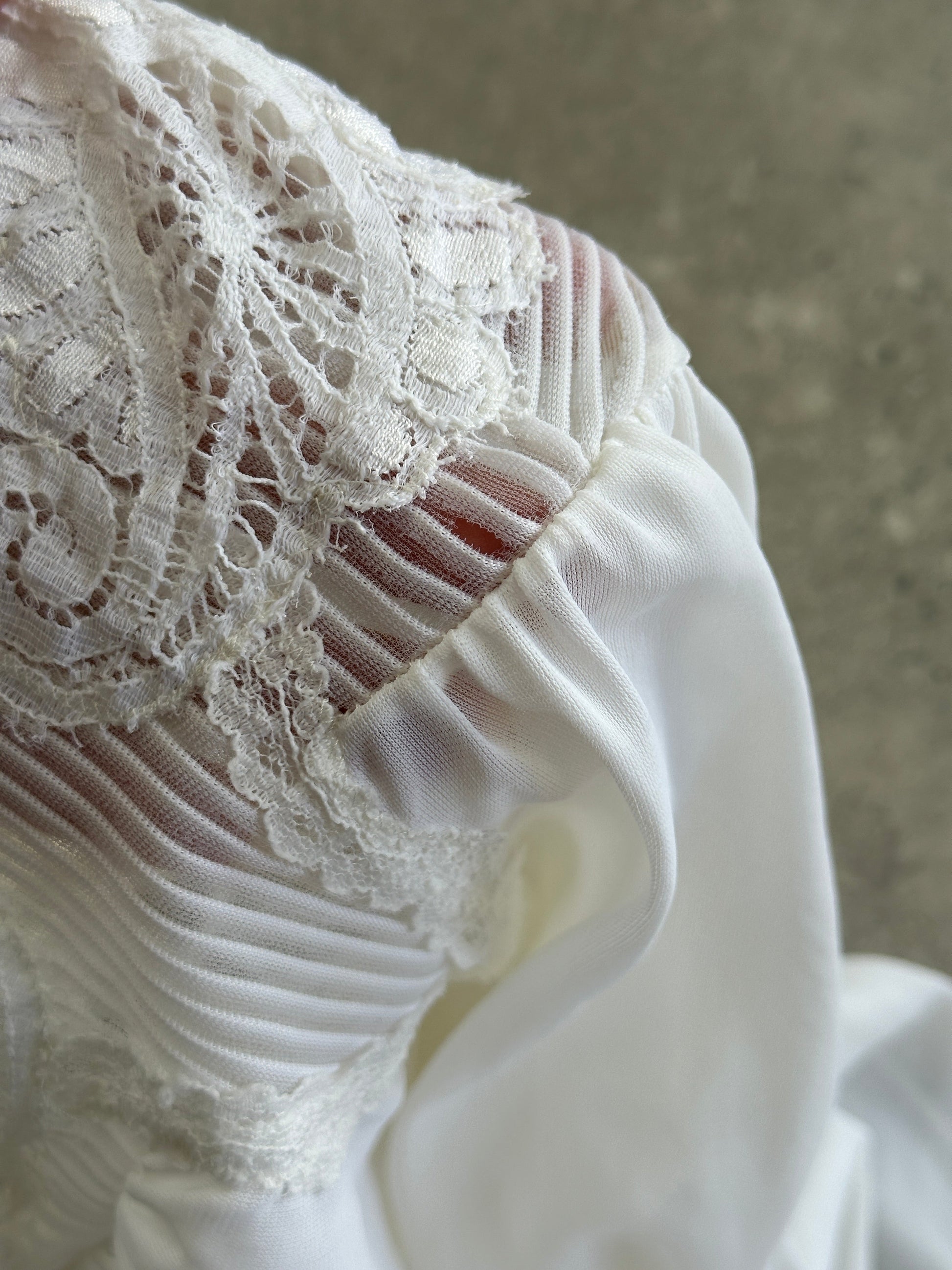 Flaws: few small tears in lace section and two faint pink marks near hem, hard to pick up on camera