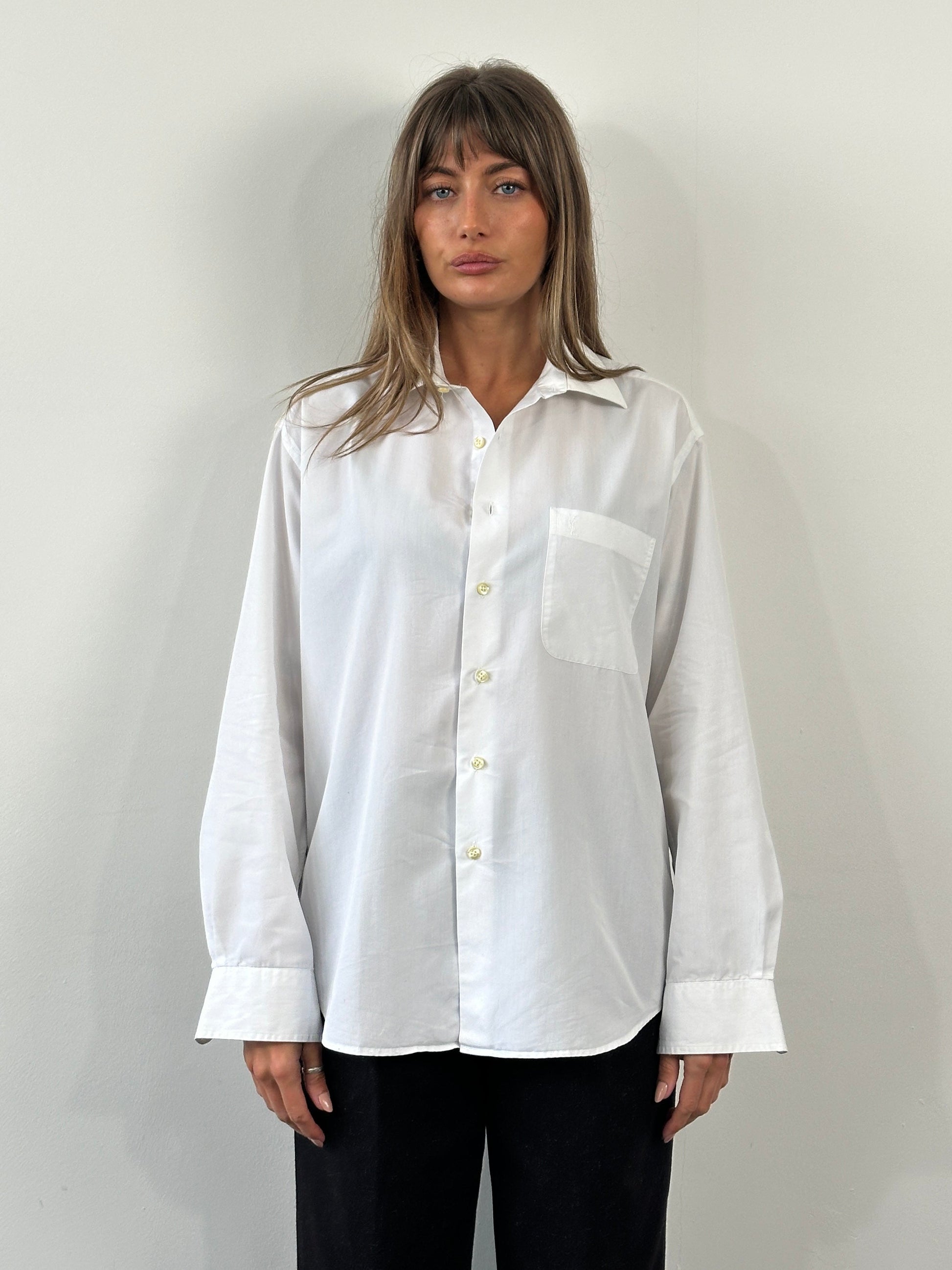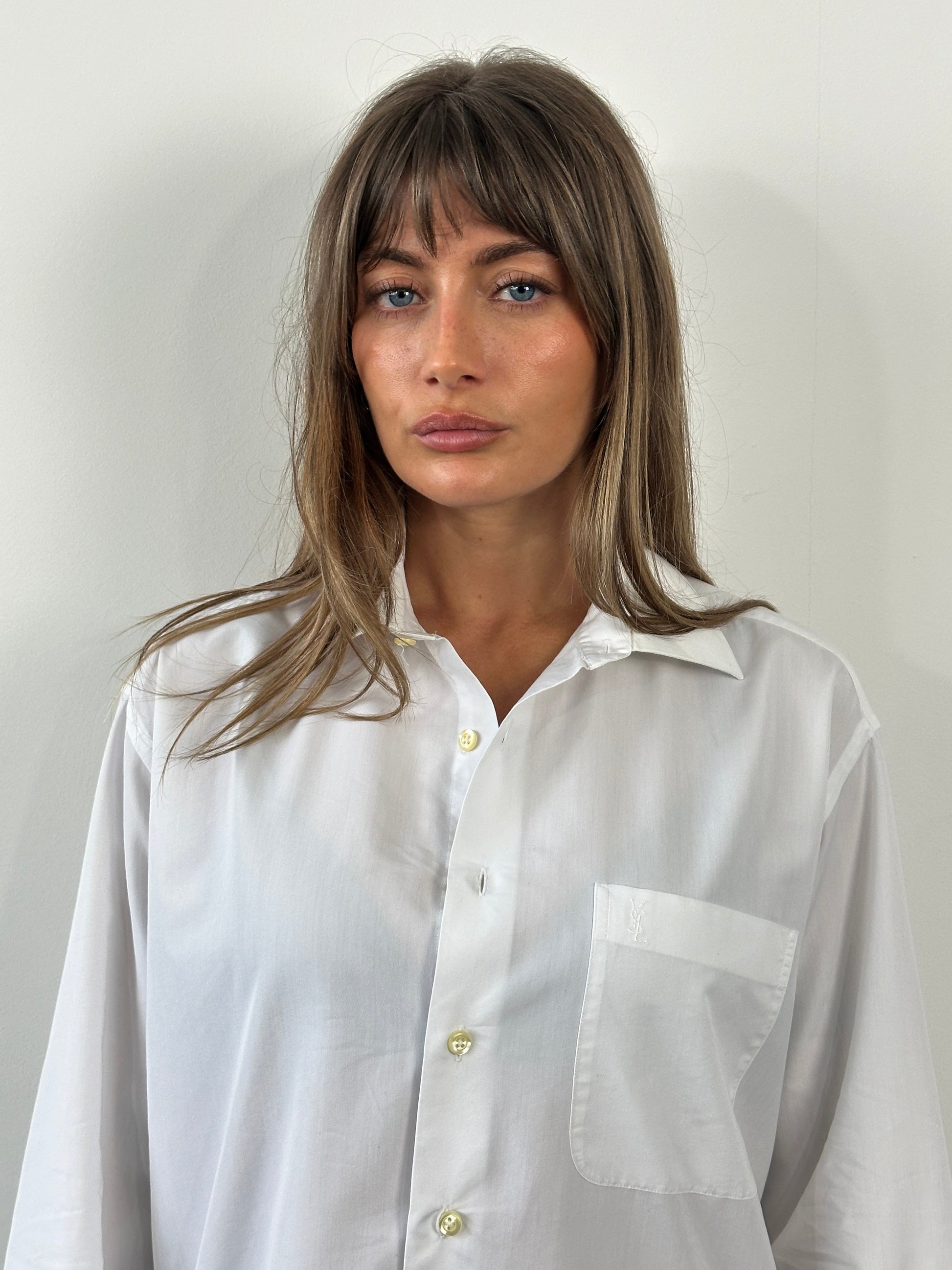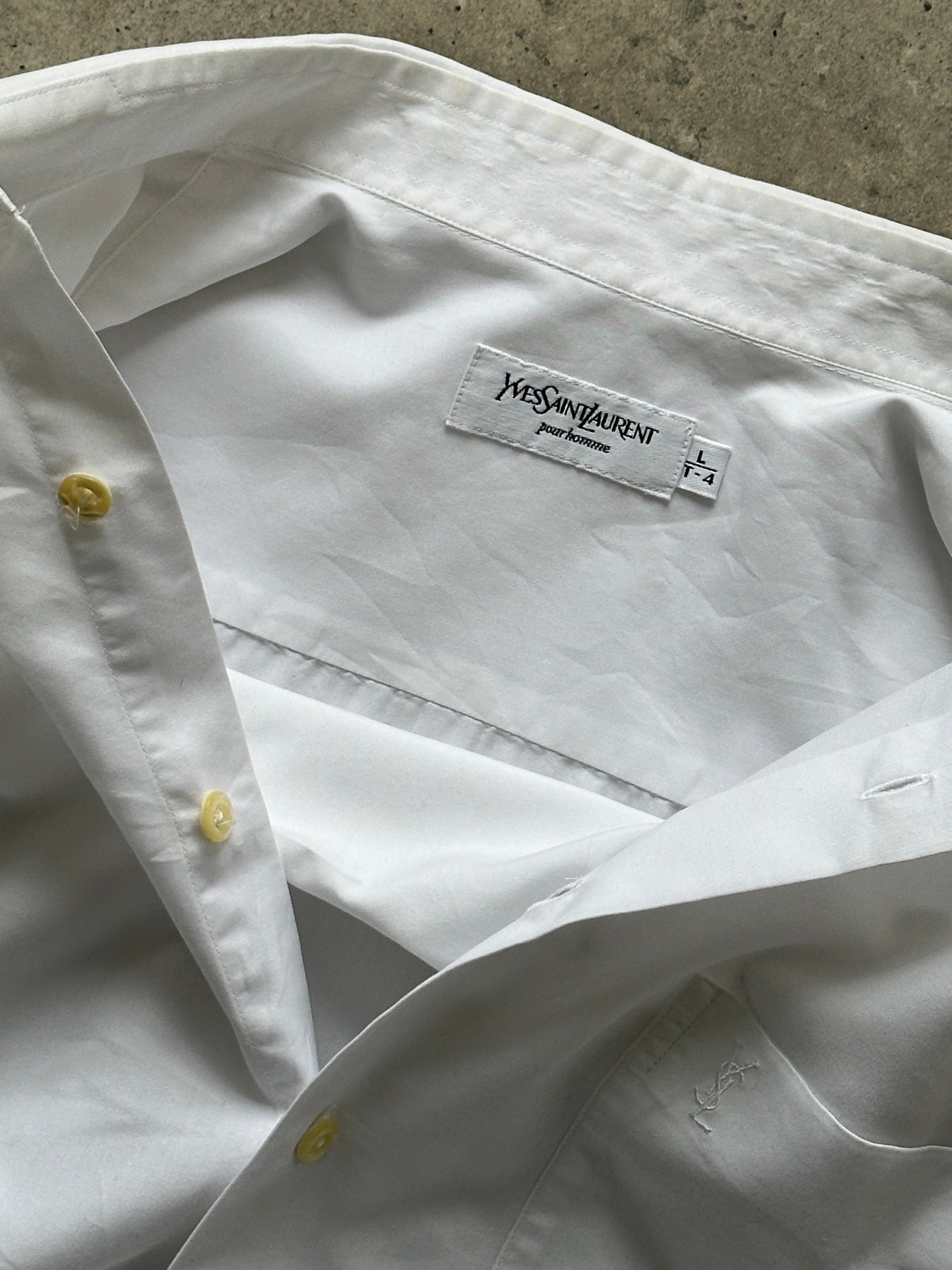 A crisp white 1990s Yves Saint Laurent Pour Homme shirt with a clean poplin handle and a sharp, structured collar. Cut with a relaxed straight silhouette and finished with a single chest pocket and subtle logo detailing.