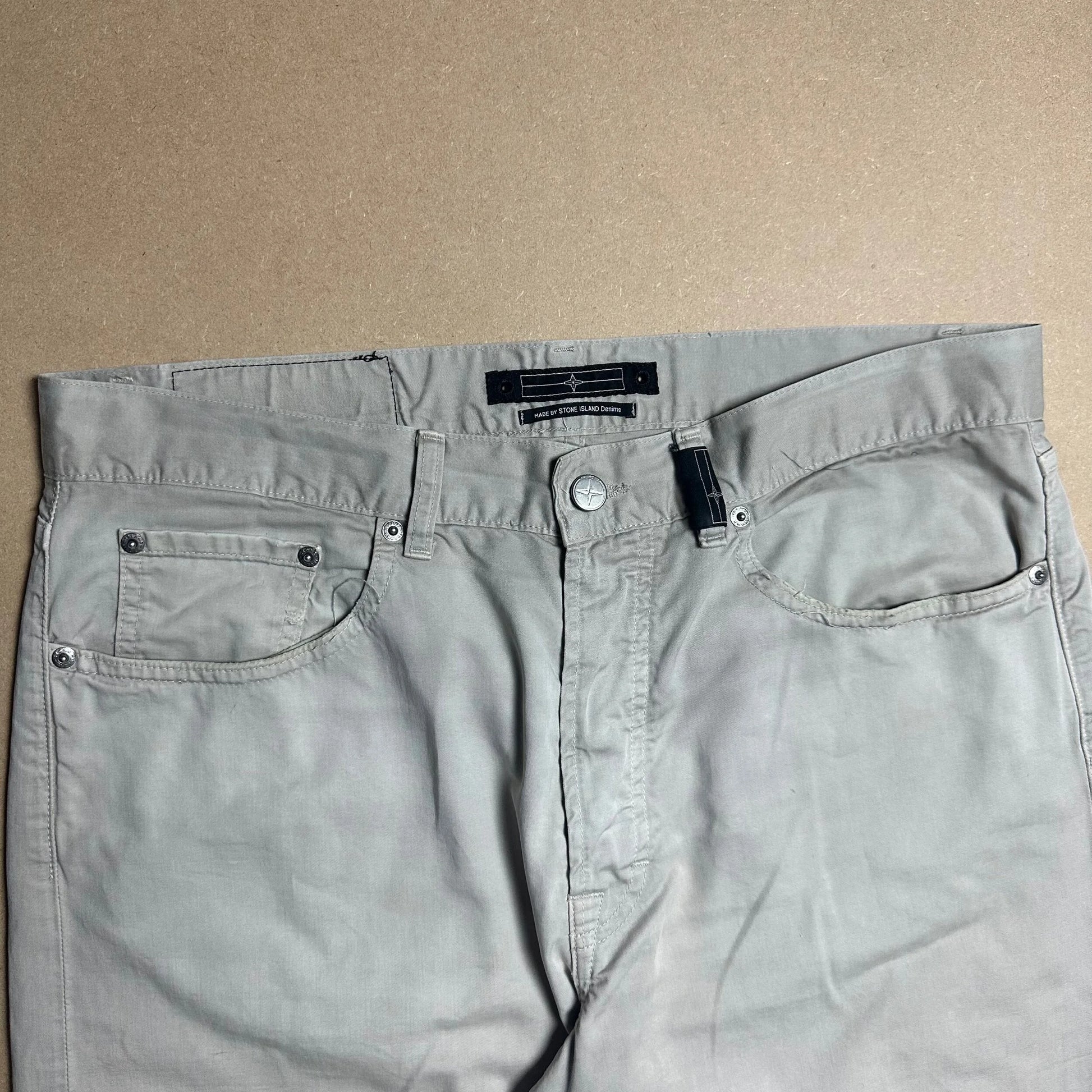 Mid 2000s classic style chino from the Denims range. Features embossed compass buttons. Rear back pocket spell out and leather branded stamp to belt line.