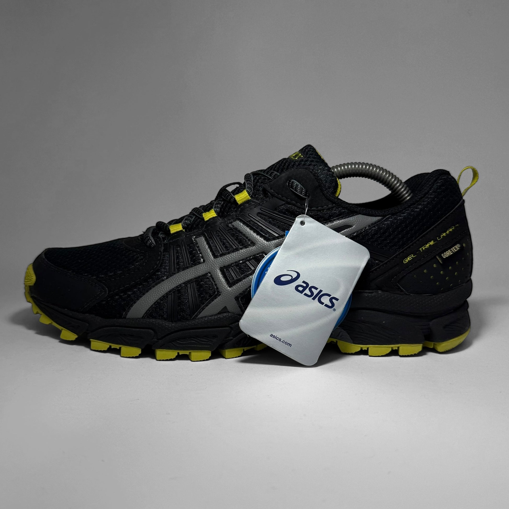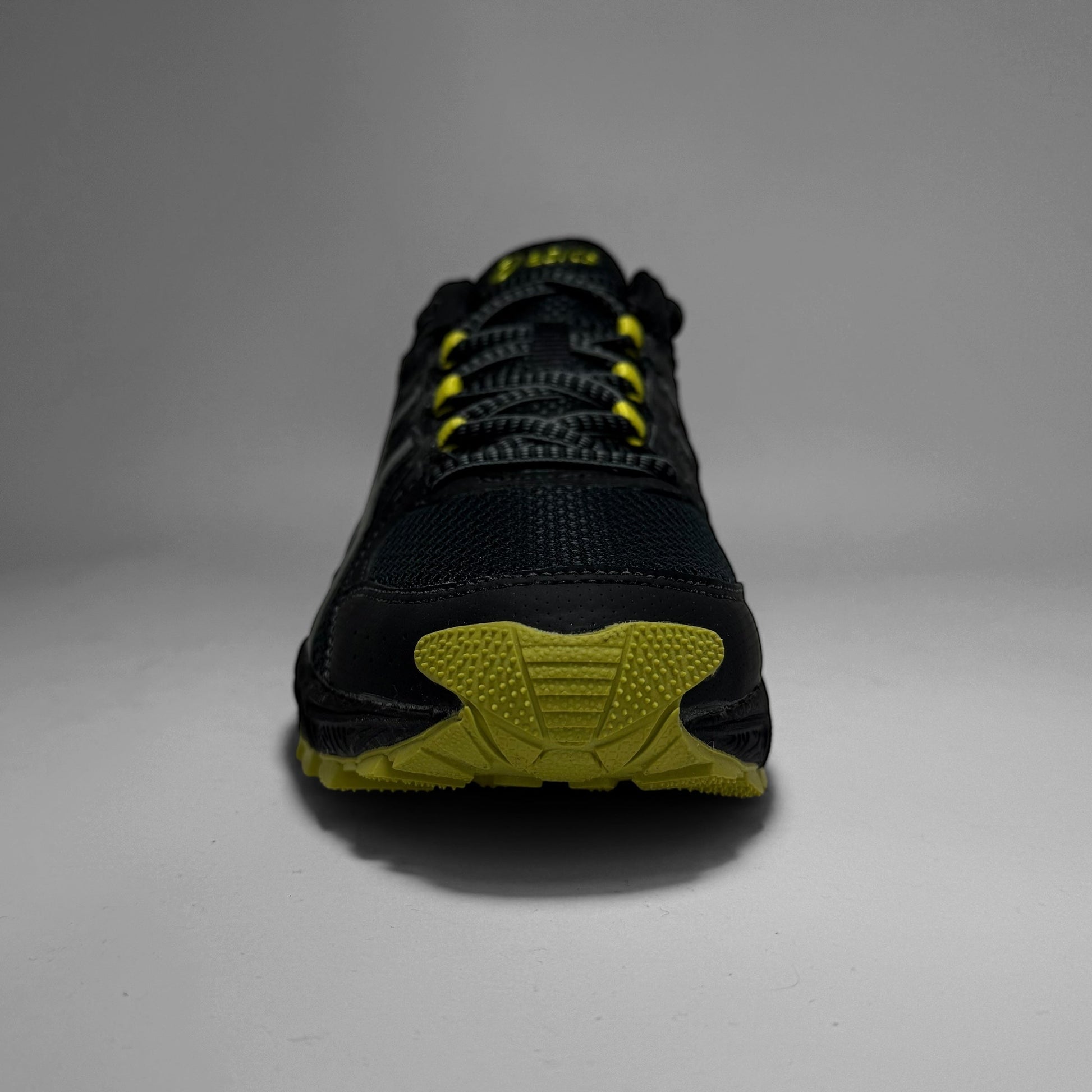 Built for rugged terrain, the Gel-Trail Lahar GTX combines trail-ready durability with all-weather protection. Featuring a Gore-Tex membrane for waterproof breathability, GEL cushioning for impact absorption, and an aggressive outsole for superior traction. Finished in black with grey overlays and yellow detailing.